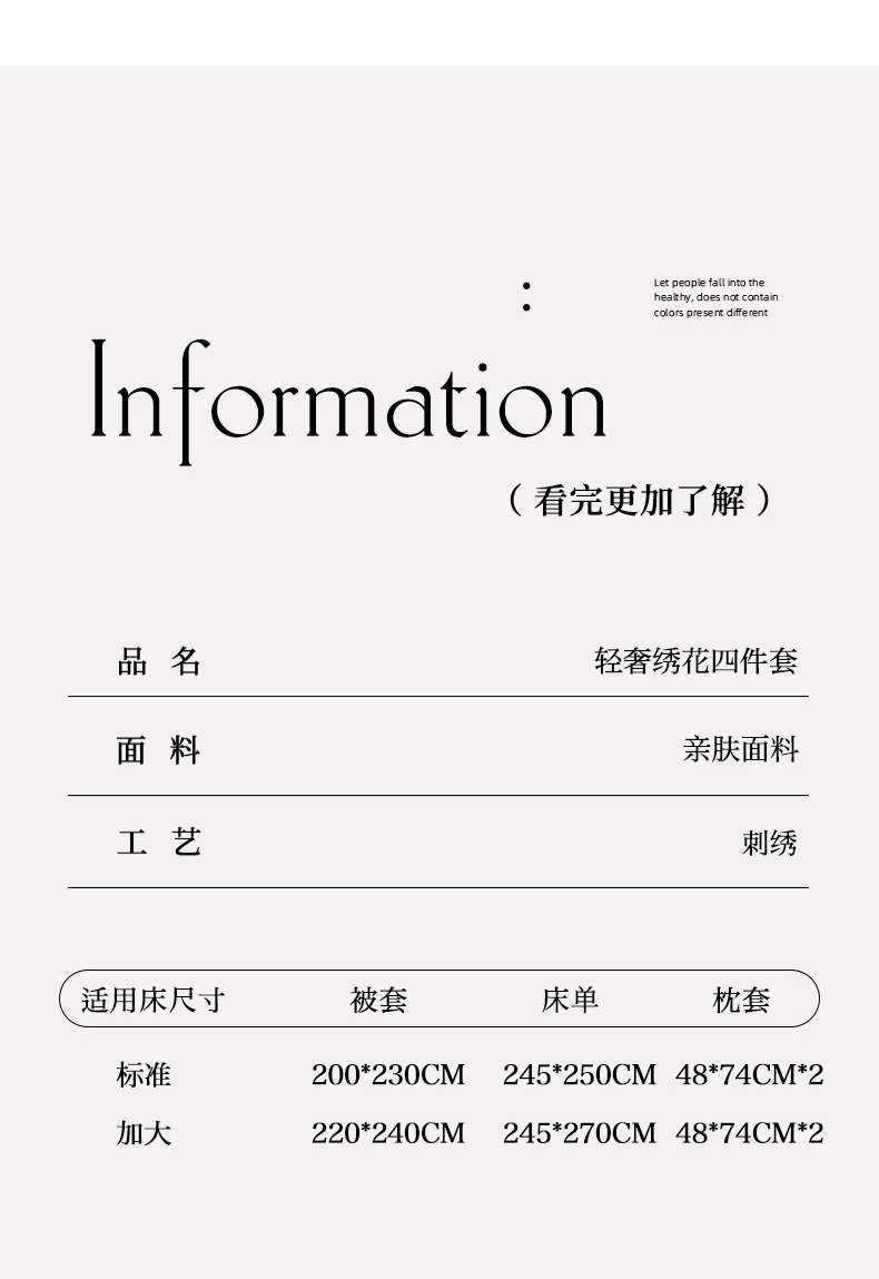 (总)金纱玉纺家纺 2024新款百分之百全棉新款轻奢刺绣四件套,恬静时光-灰,恬静时光-蓝,恬静时光-浅粉,恬静时光-浅紫,恬静时光-棕,沉漫星空-粉玉,沉漫星空-灰绿,沉漫星空-蓝,沉漫星空-浅紫,沉漫星空-棕,沉漫星空-棕灰,叶香风暖-粉玉,叶香风暖-灰绿,叶香风暖-兰,叶香风暖-浅紫,叶香风暖-棕,叶香风暖-棕灰