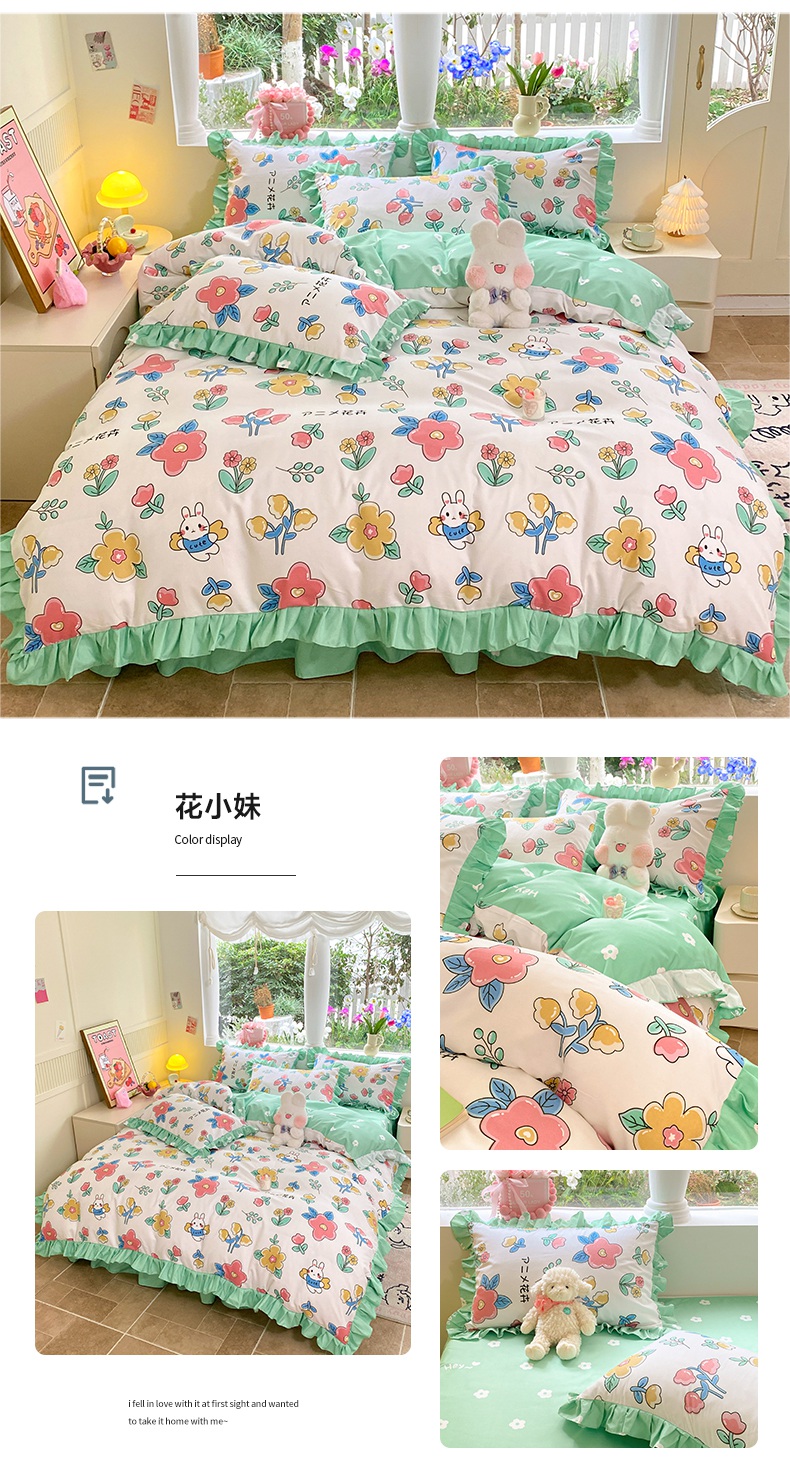当前位置: 91家纺网 > 商品网购 > 床品套件 > 四件套 > 化纤活性四件套 > 亨通家纺 2025新款亲肤棉花边韩版床裙四件套 花小妹