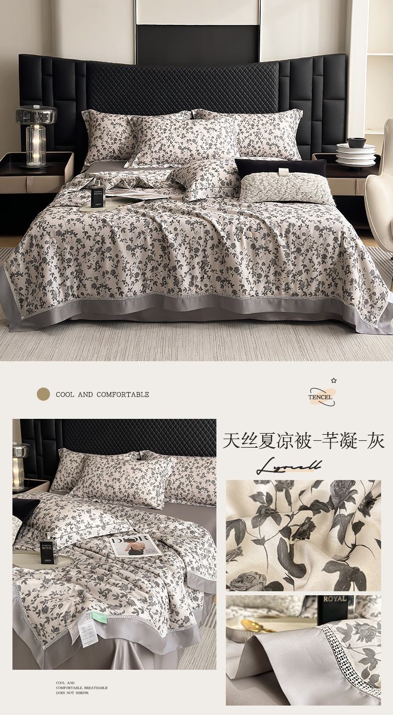 商品名称:娇逸家居 2025新款50支印花莱赛尔天丝夏被镂空款花边夏凉被 芊凝-灰
