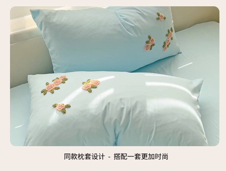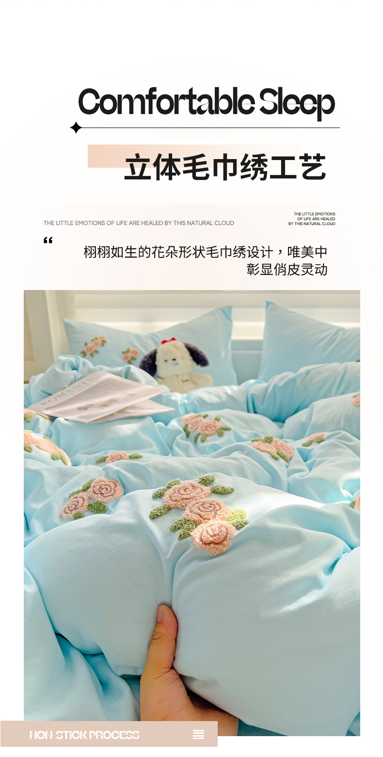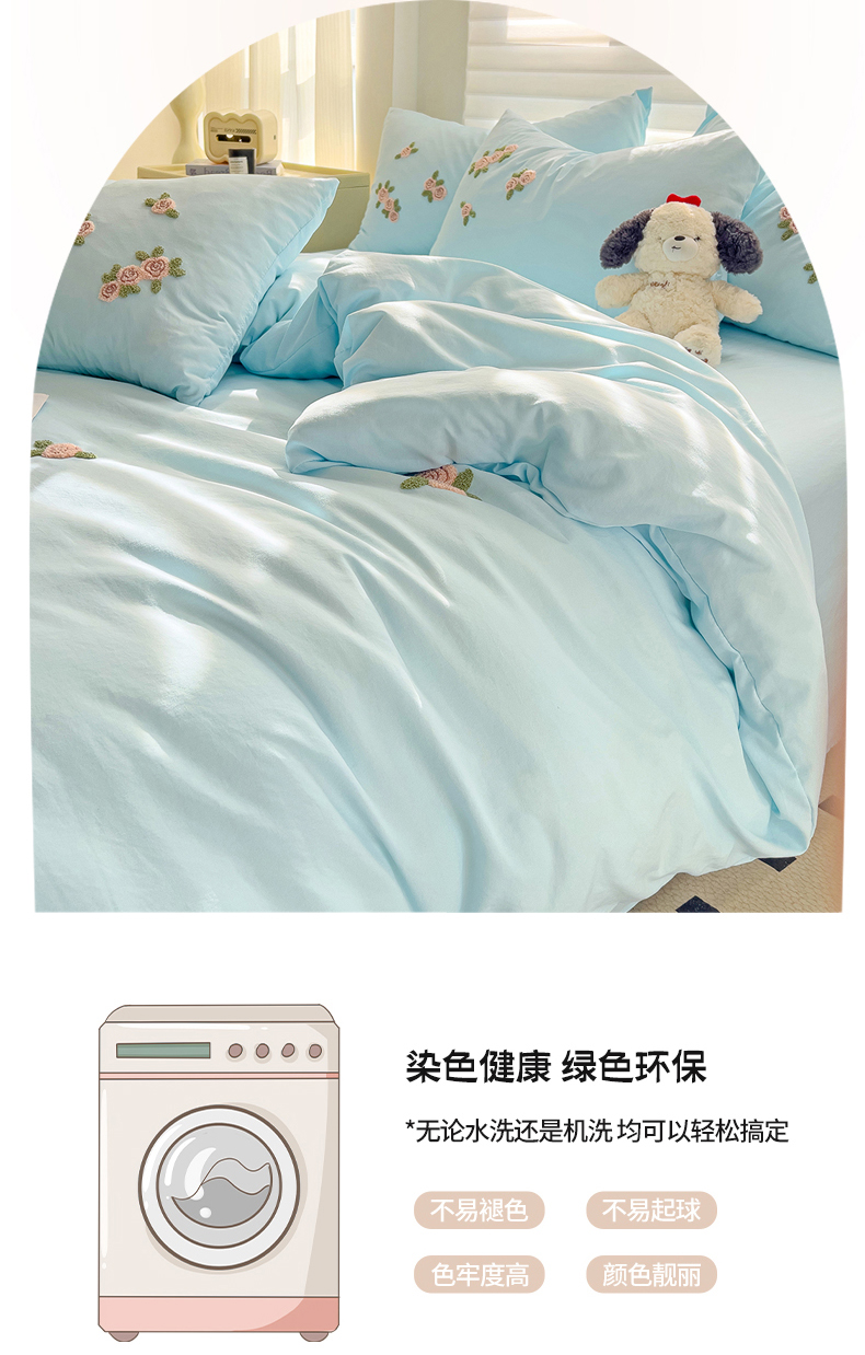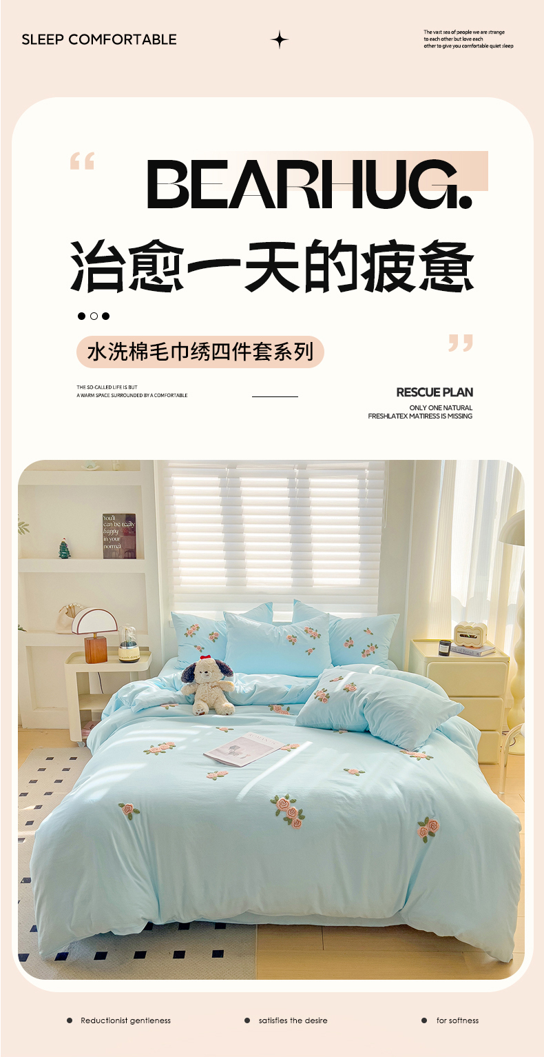 商品名称:你好美丽 2025新款水洗棉毛巾绣花朵花漾四件套 花漾蓝