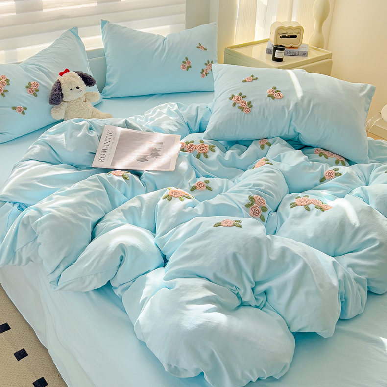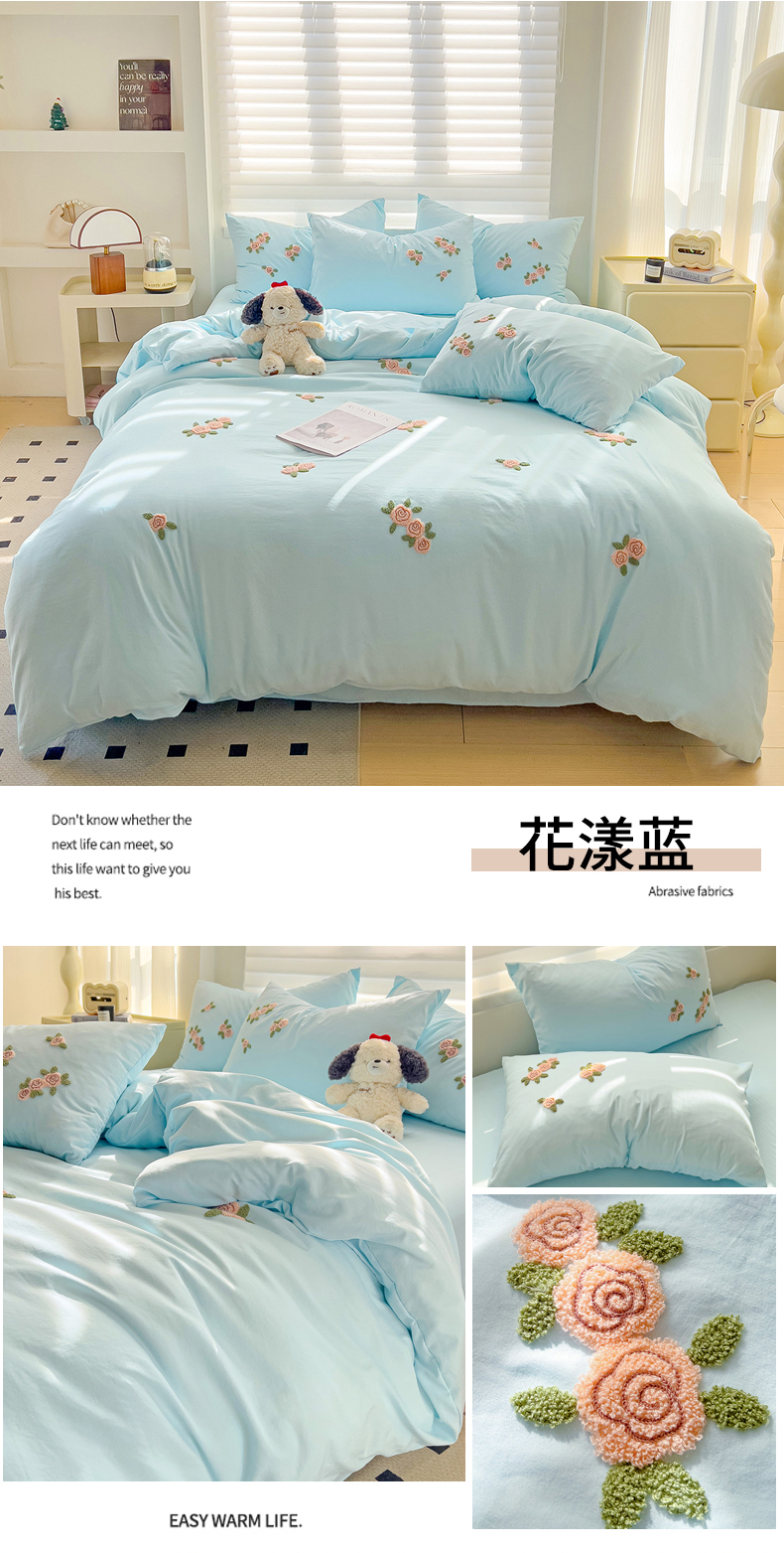 2025新款直播热卖韩版加厚磨毛刺绣花边四件套 淡雅花语-蓝,淡雅花语-蓝