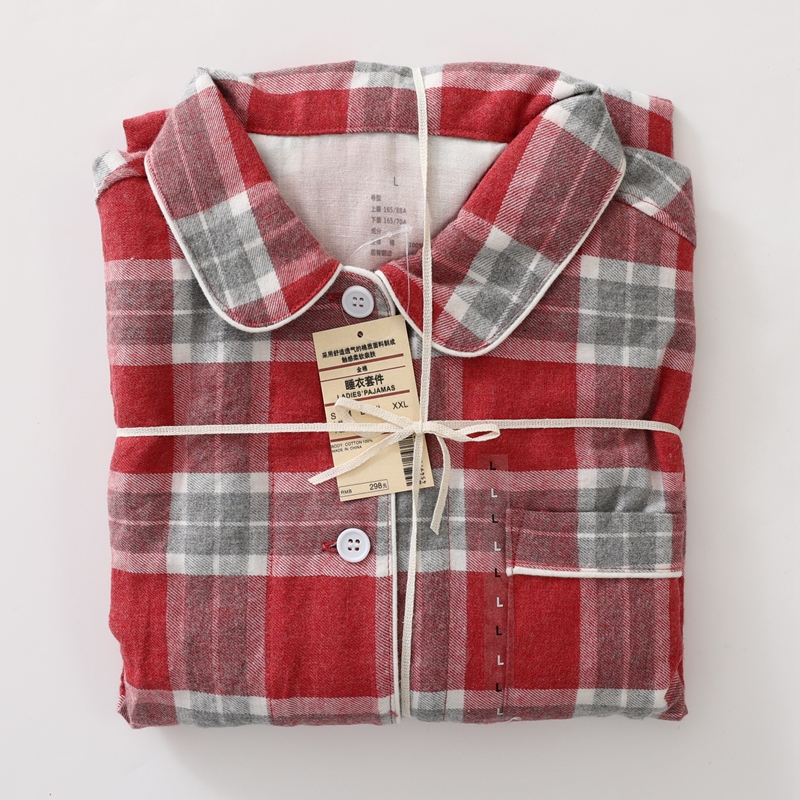 伊嫚家居 2025新款无印日式双股全棉法兰绒家居服良品睡衣女纯棉直播秋冬款情侣睡衣 灰红色