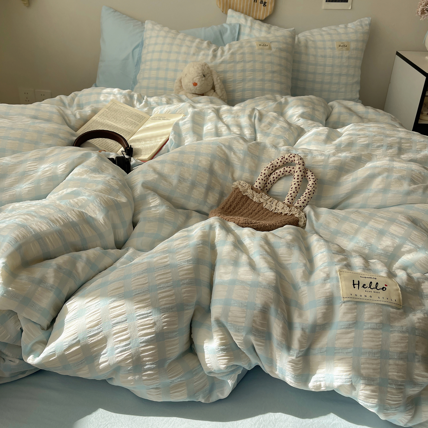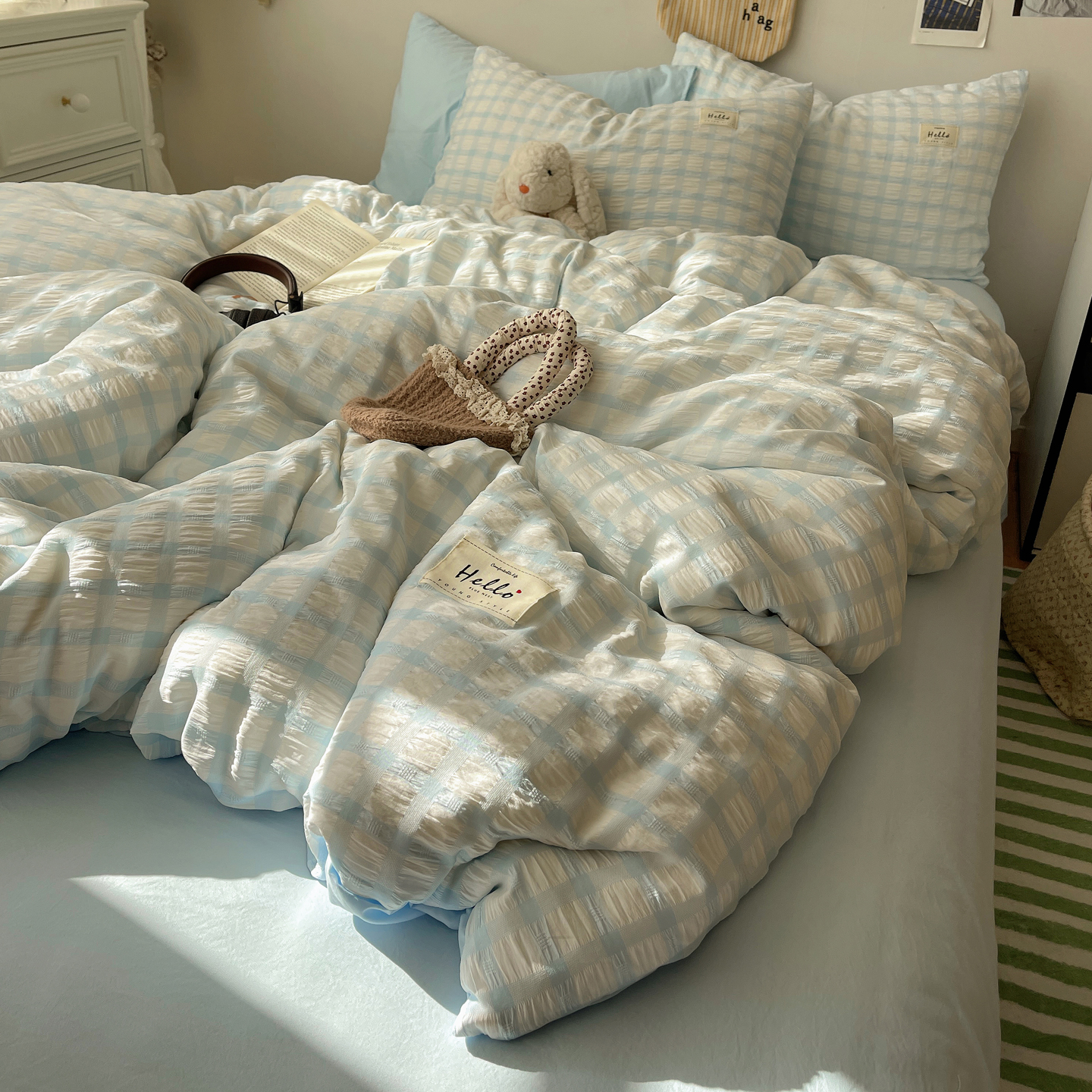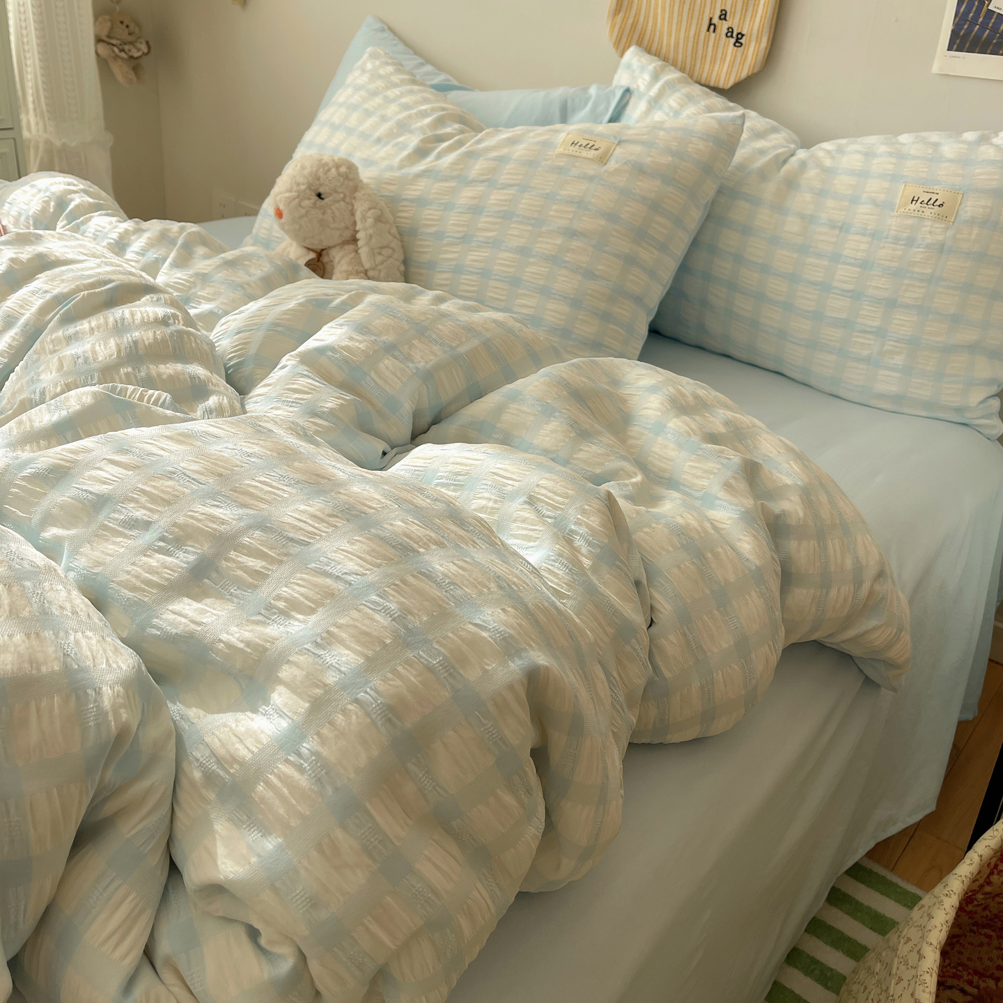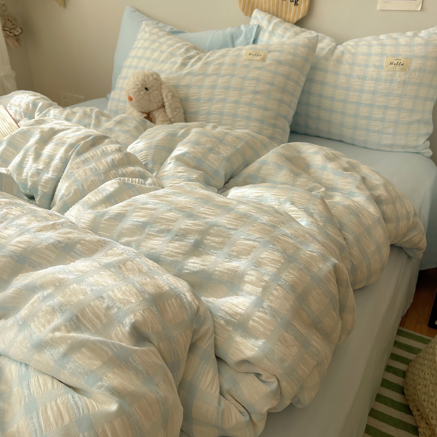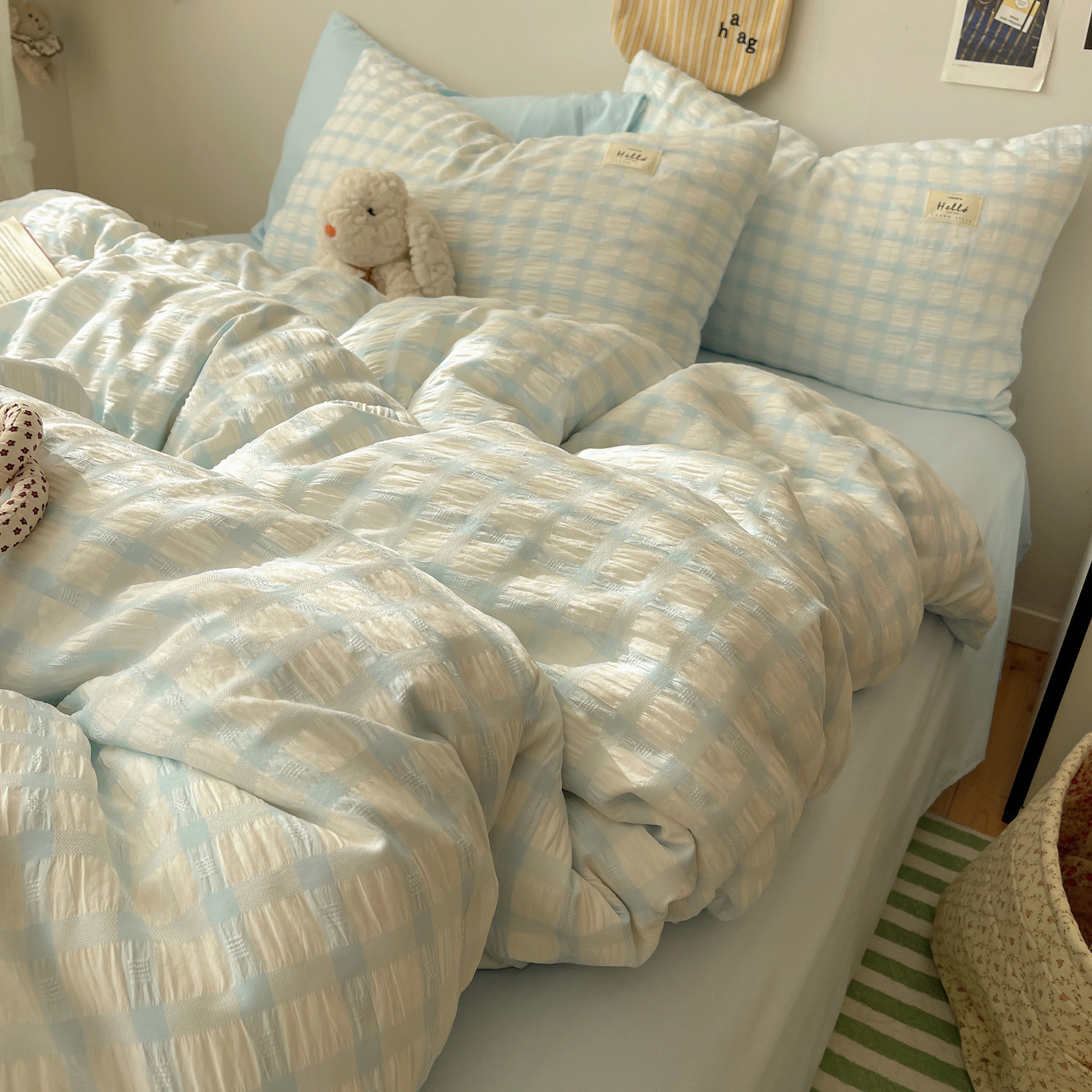 当前位置: 91家纺网 > 商品网购 > 床品套件 > 四件套 > 双层纱四件套 > 顾里2025新款韩系格子阳离子泡泡纱四件套-第二组 天空蓝格