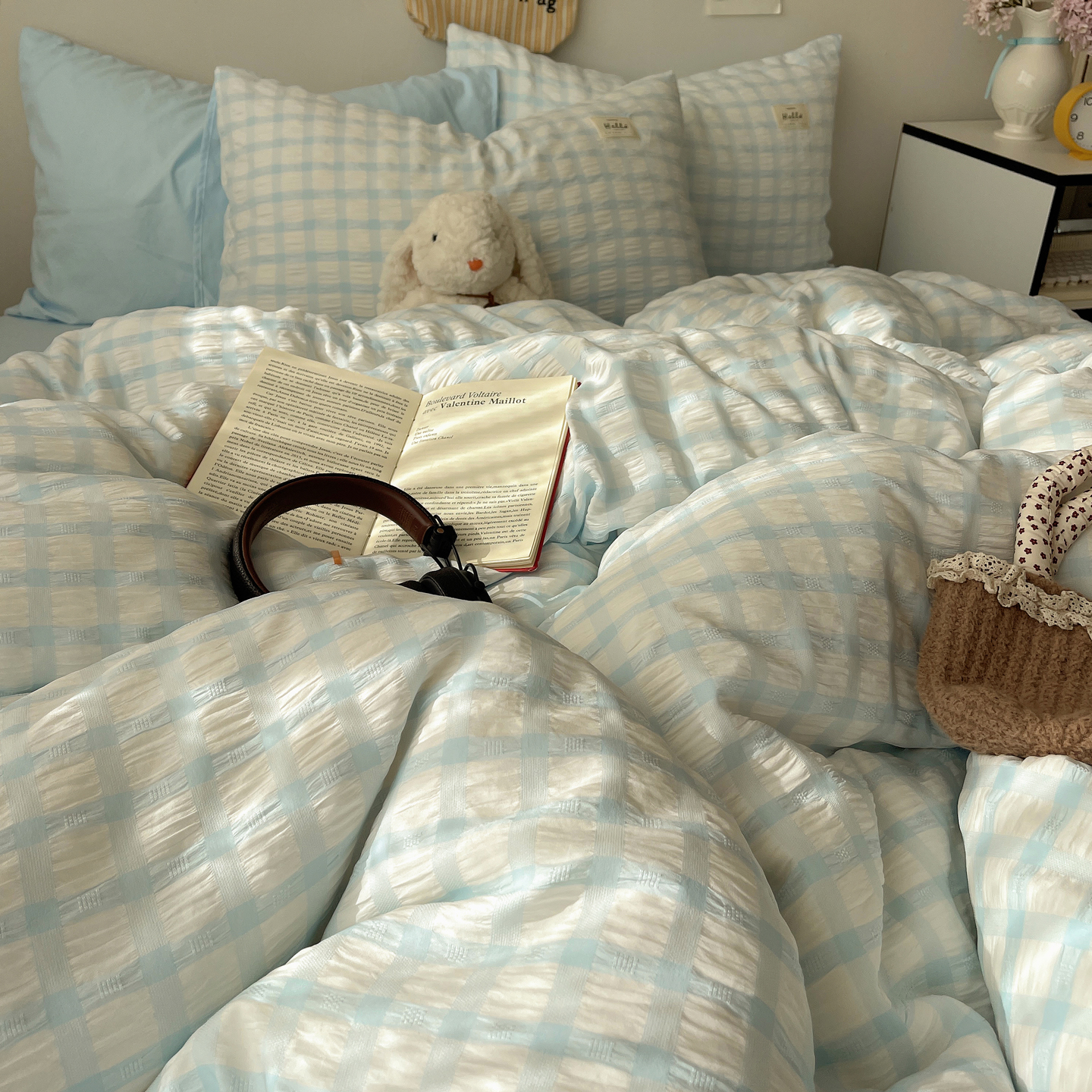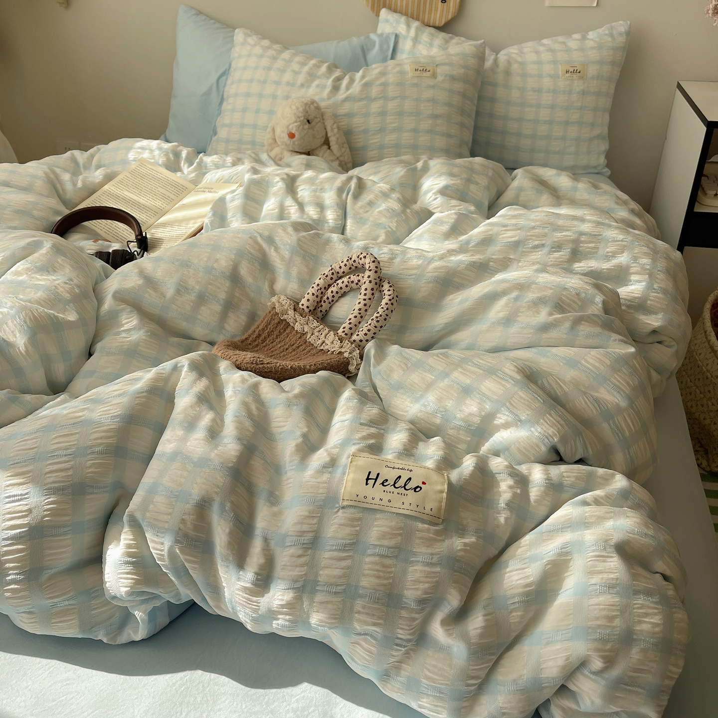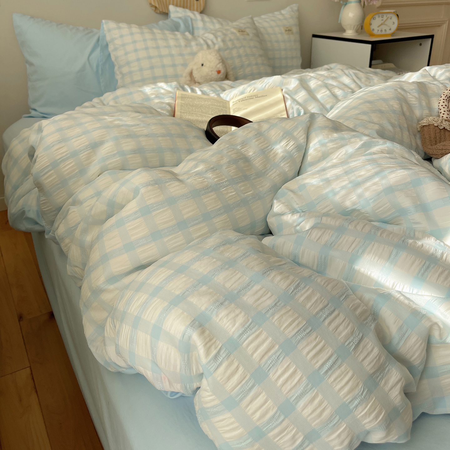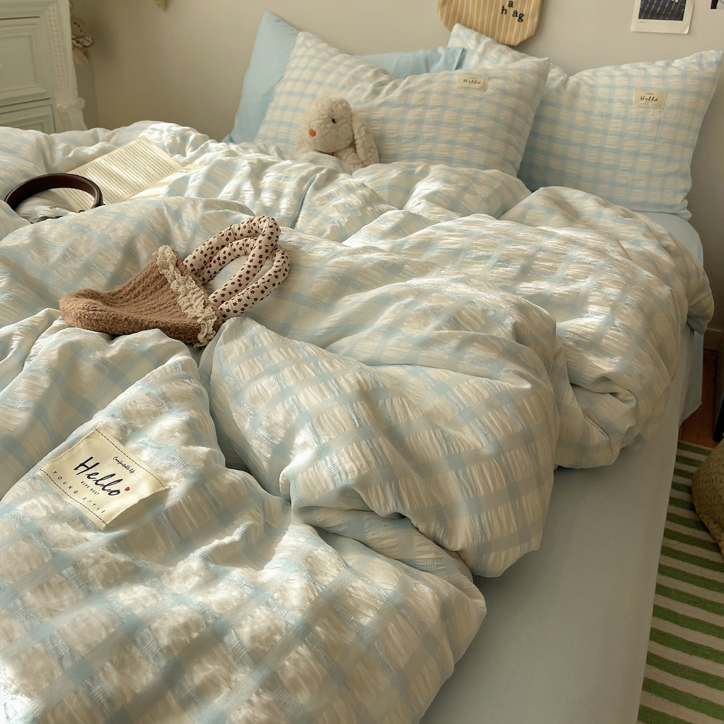 当前位置: 91家纺网 > 商品网购 > 床品套件 > 四件套 > 双层纱四件套 > 顾里2025新款韩系格子阳离子泡泡纱四件套-第二组 天空蓝格