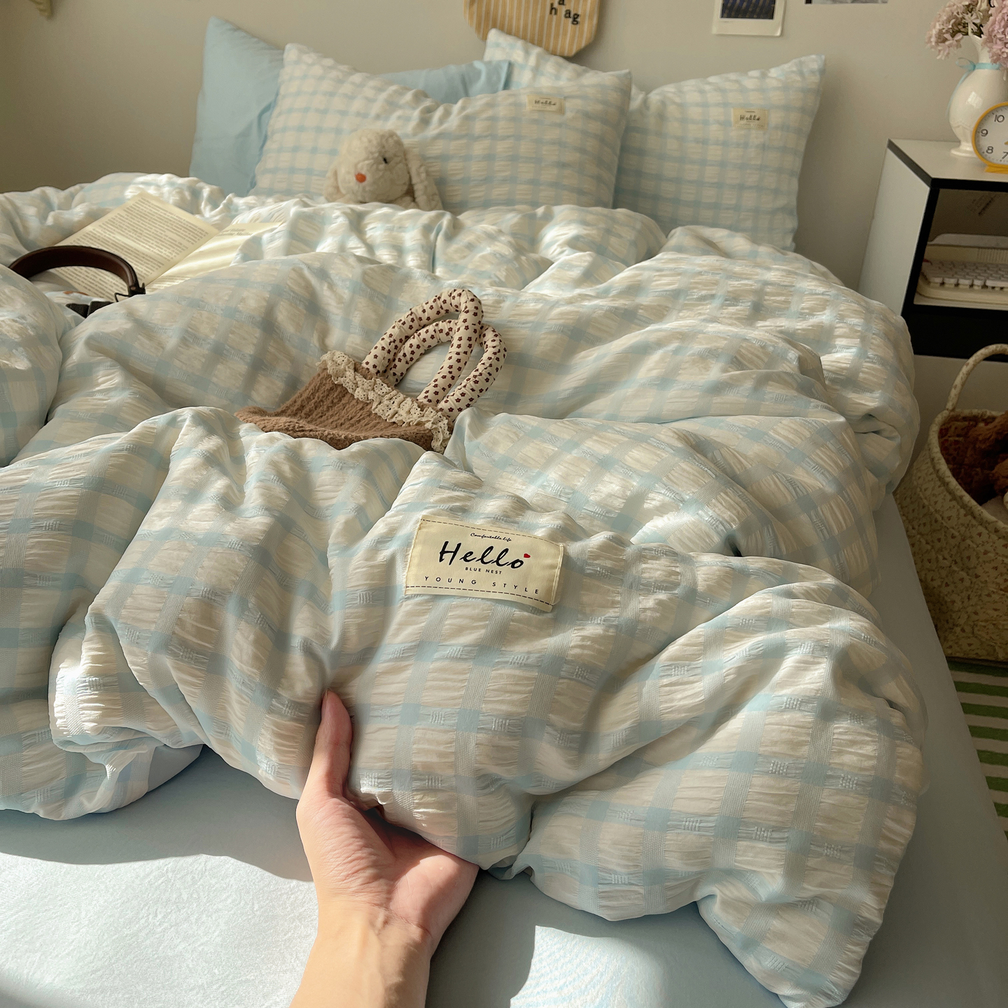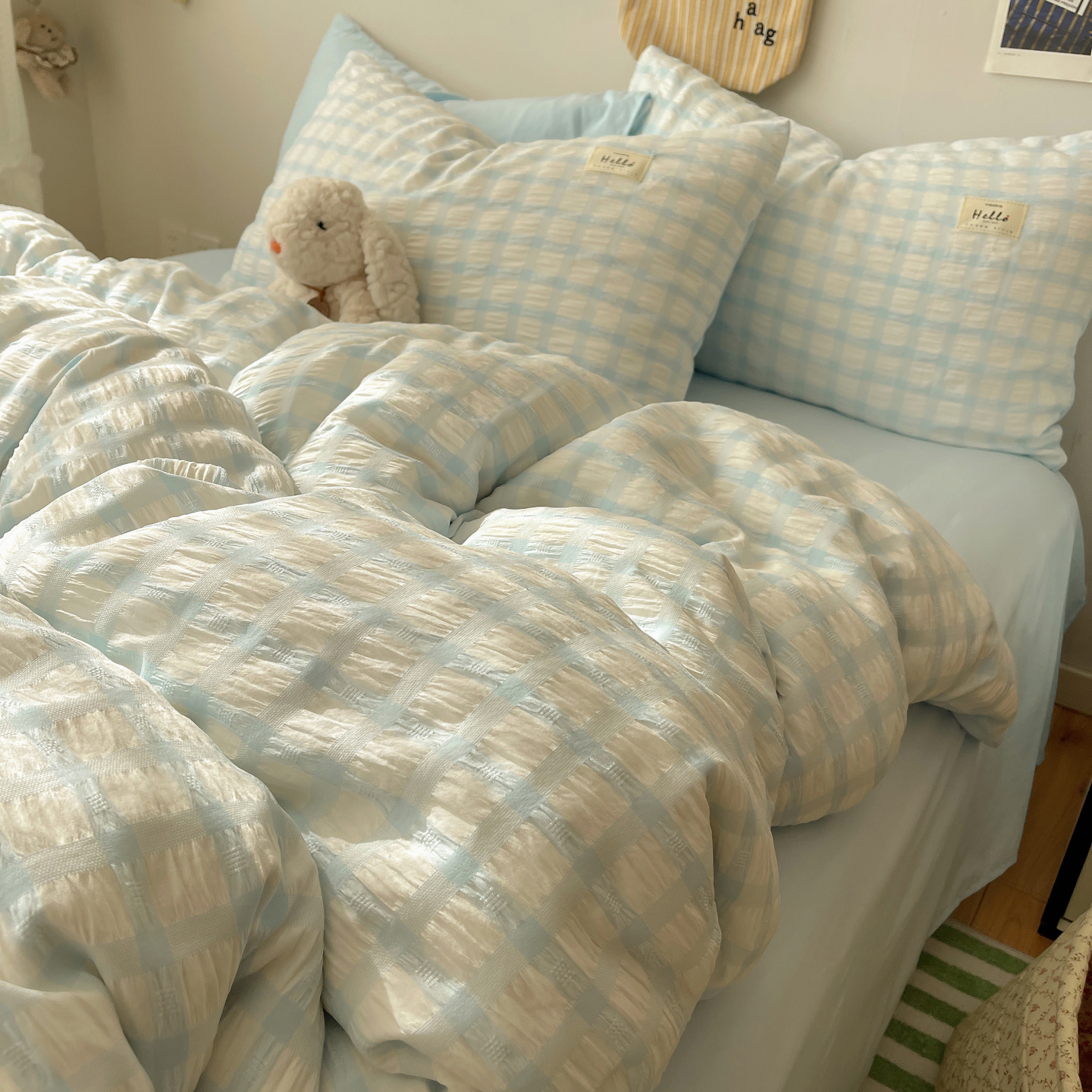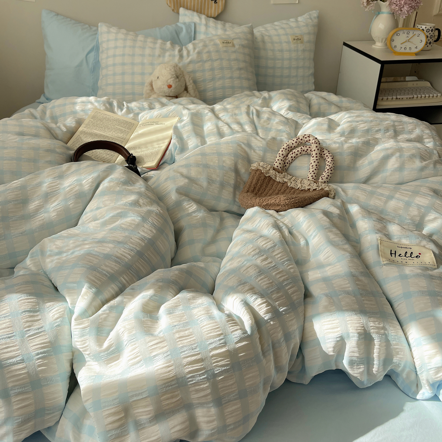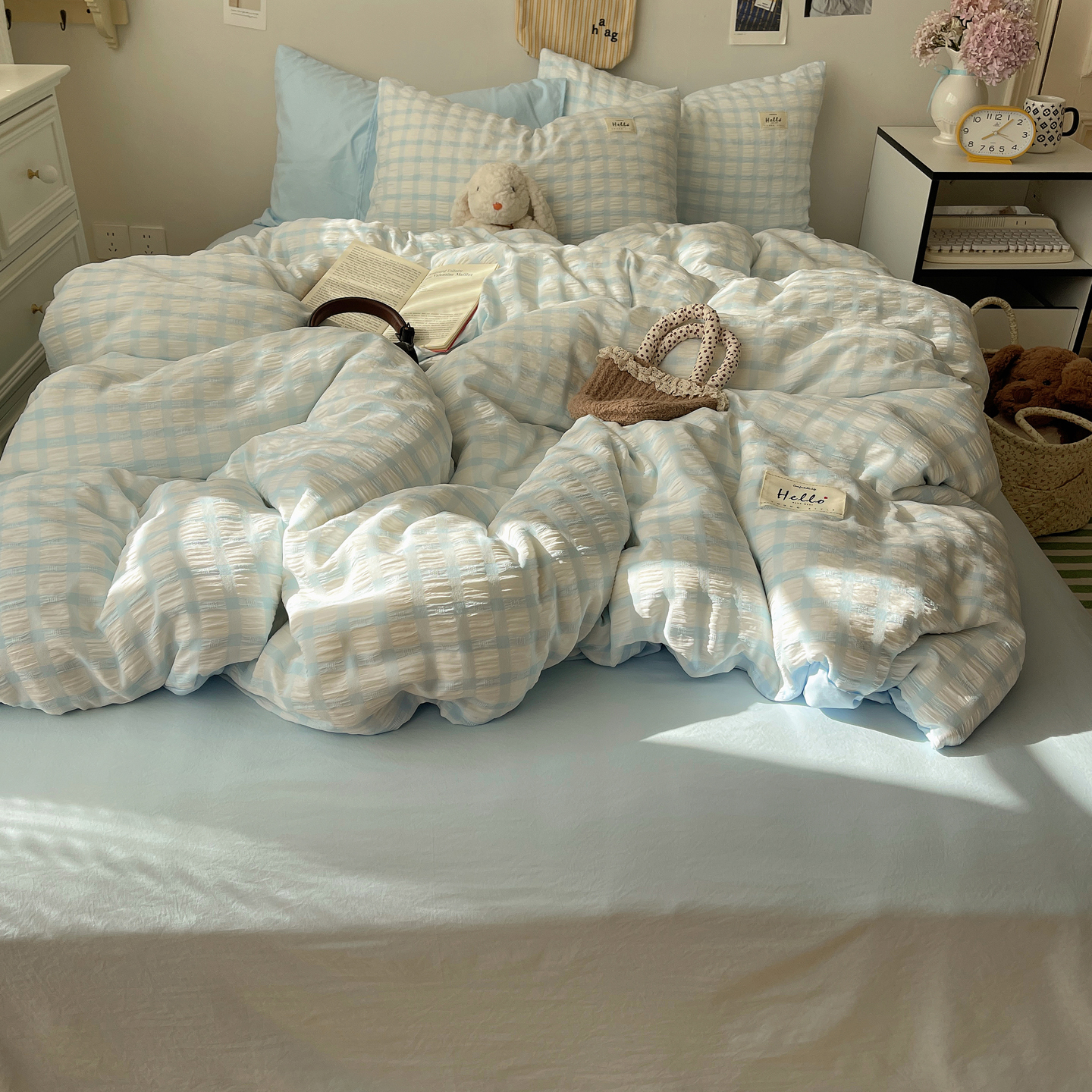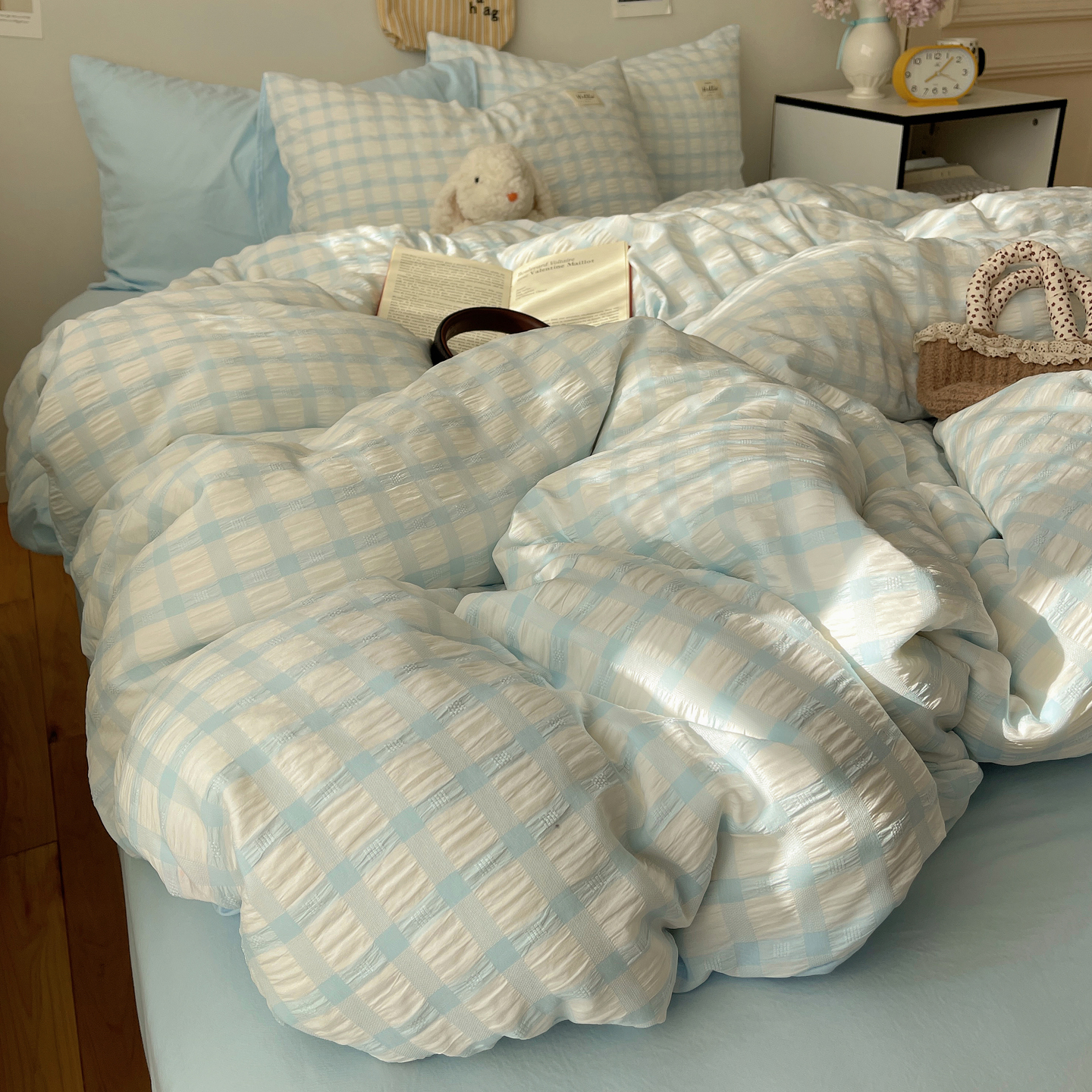 当前位置: 91家纺网 > 商品网购 > 床品套件 > 四件套 > 双层纱四件套 > 顾里2025新款韩系格子阳离子泡泡纱四件套-第二组 天空蓝格