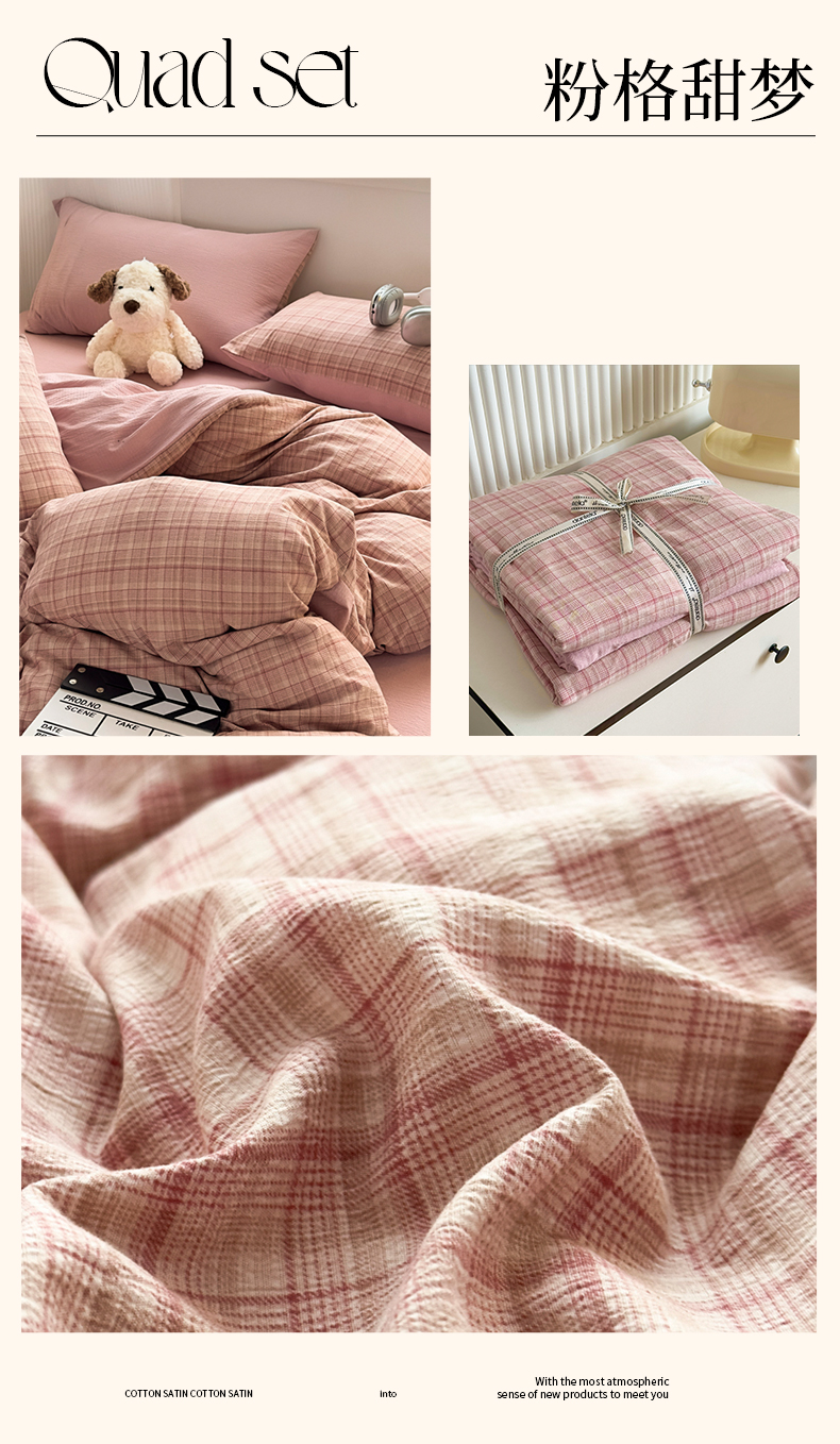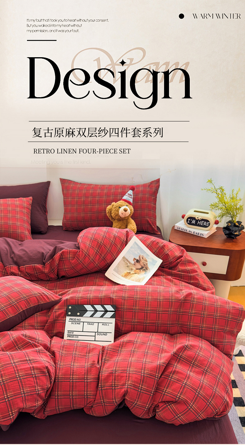 当前位置: 91家纺网 > 商品网购 > 床品套件 > 四件套 > 双层纱四件套 > 亨通家纺 2025新款复古原麻双层纱格子系列四件套 绯梦