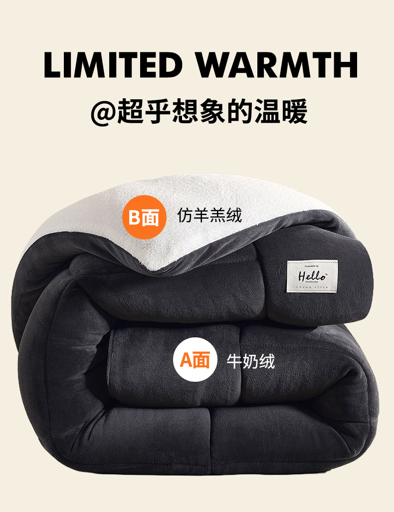当前位置: 91家纺网 > 商品网购 > 被子 > 冬被 > 梦恬佳 2025新款180克牛奶绒羊羔绒加厚冬被 被子被芯 牛奶绒-灰拼白