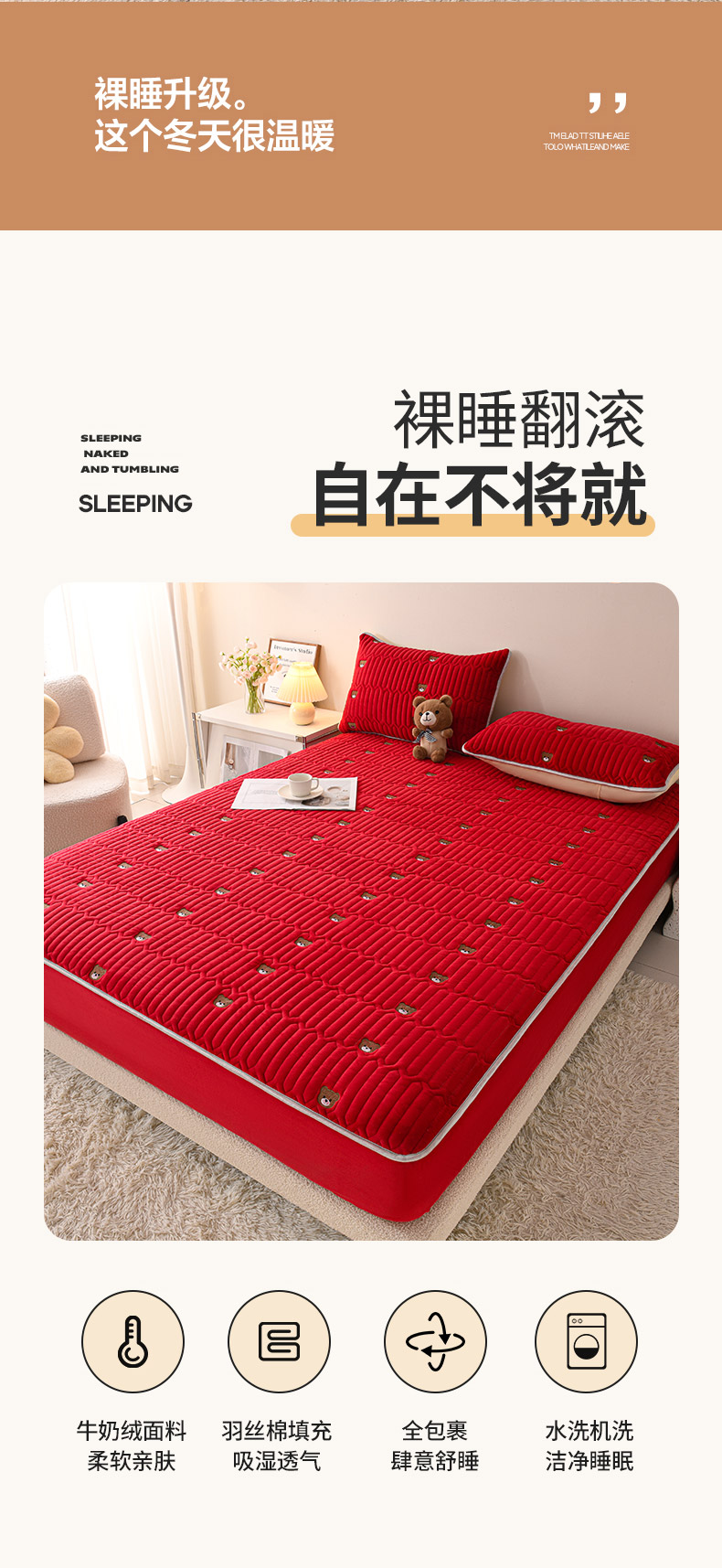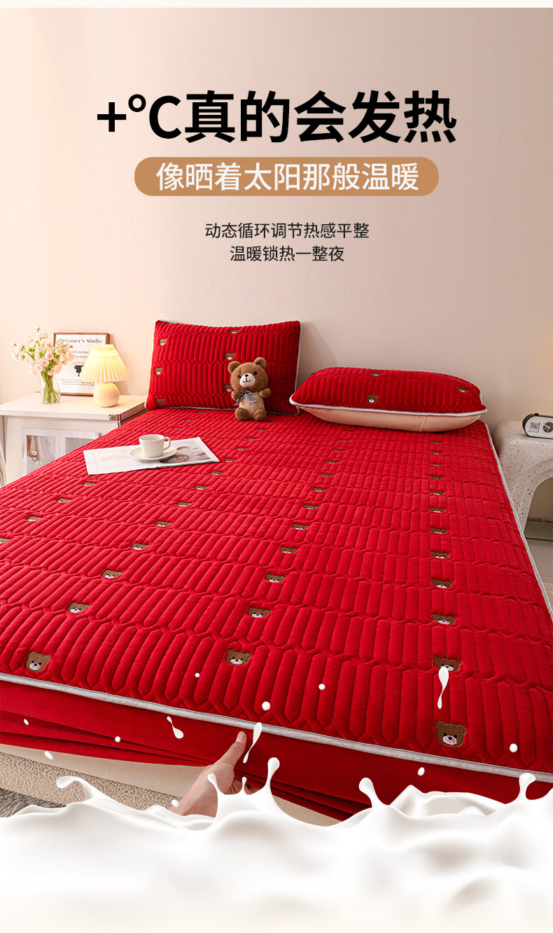 推推家纺 2025新款刺绣夹棉宝宝绒床笠牛奶绒床垫保护套 三色熊-酒红