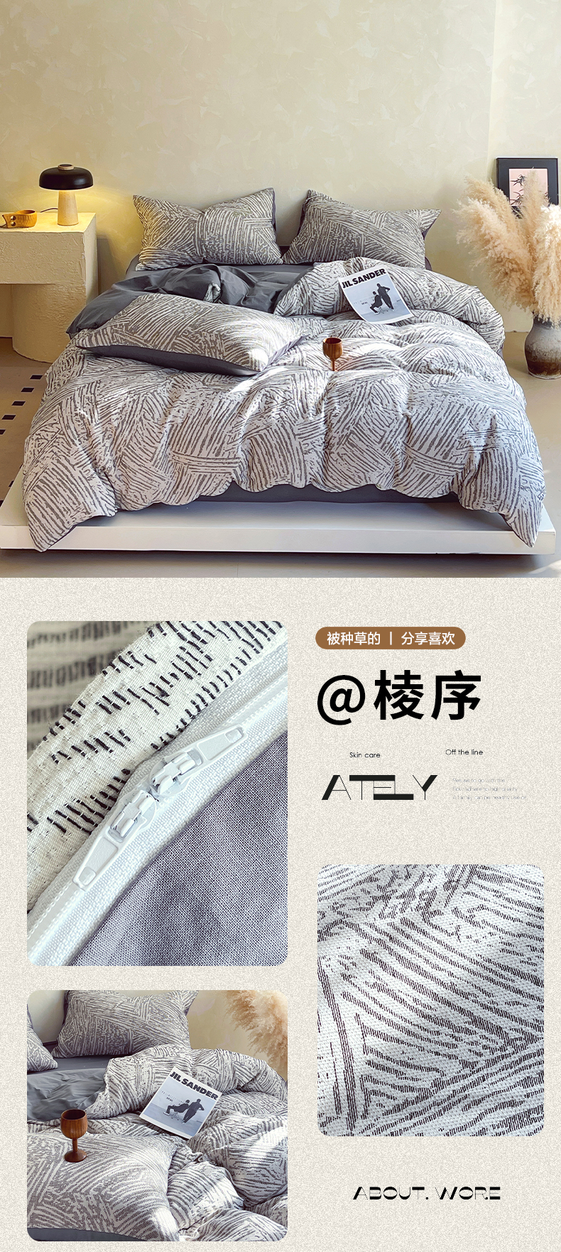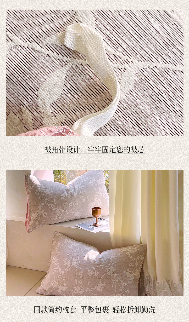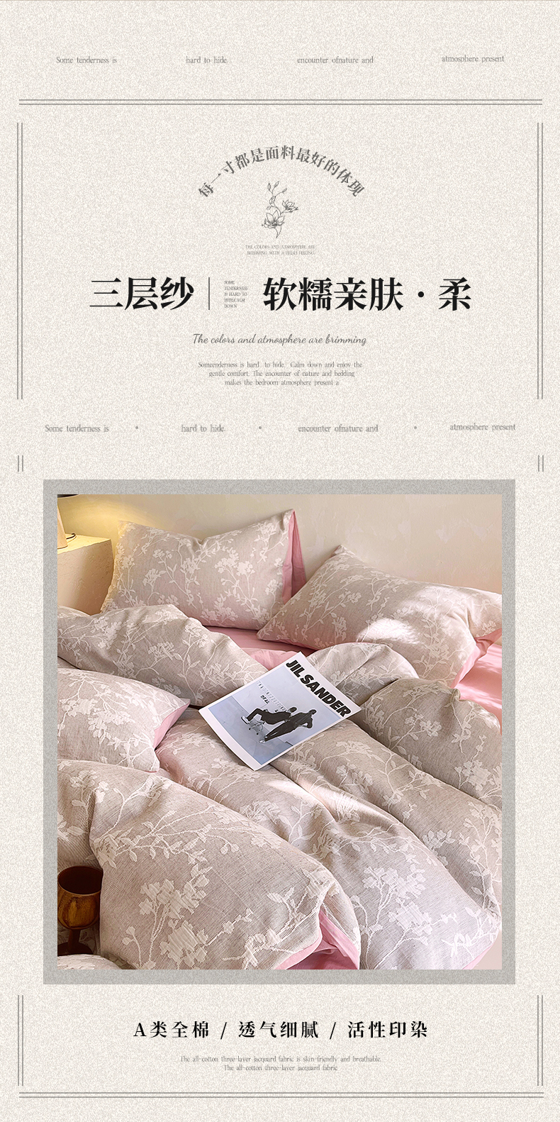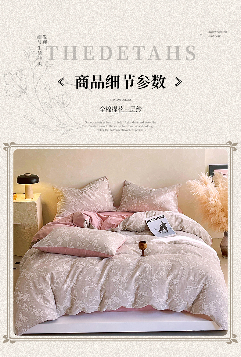 商品名称:春皖家纺 2026新款A类全棉三层纱AB版简约四件套-风格二 花笺