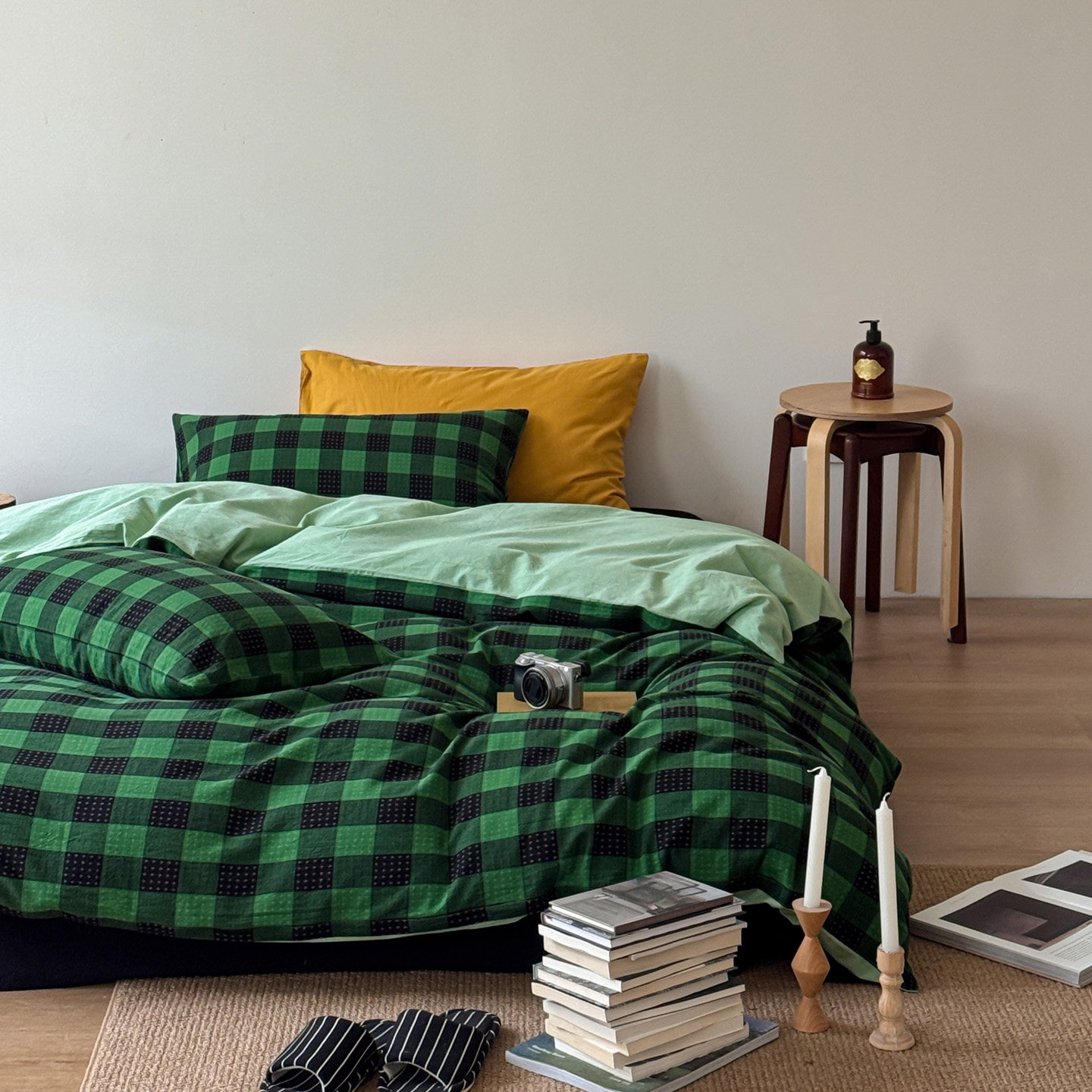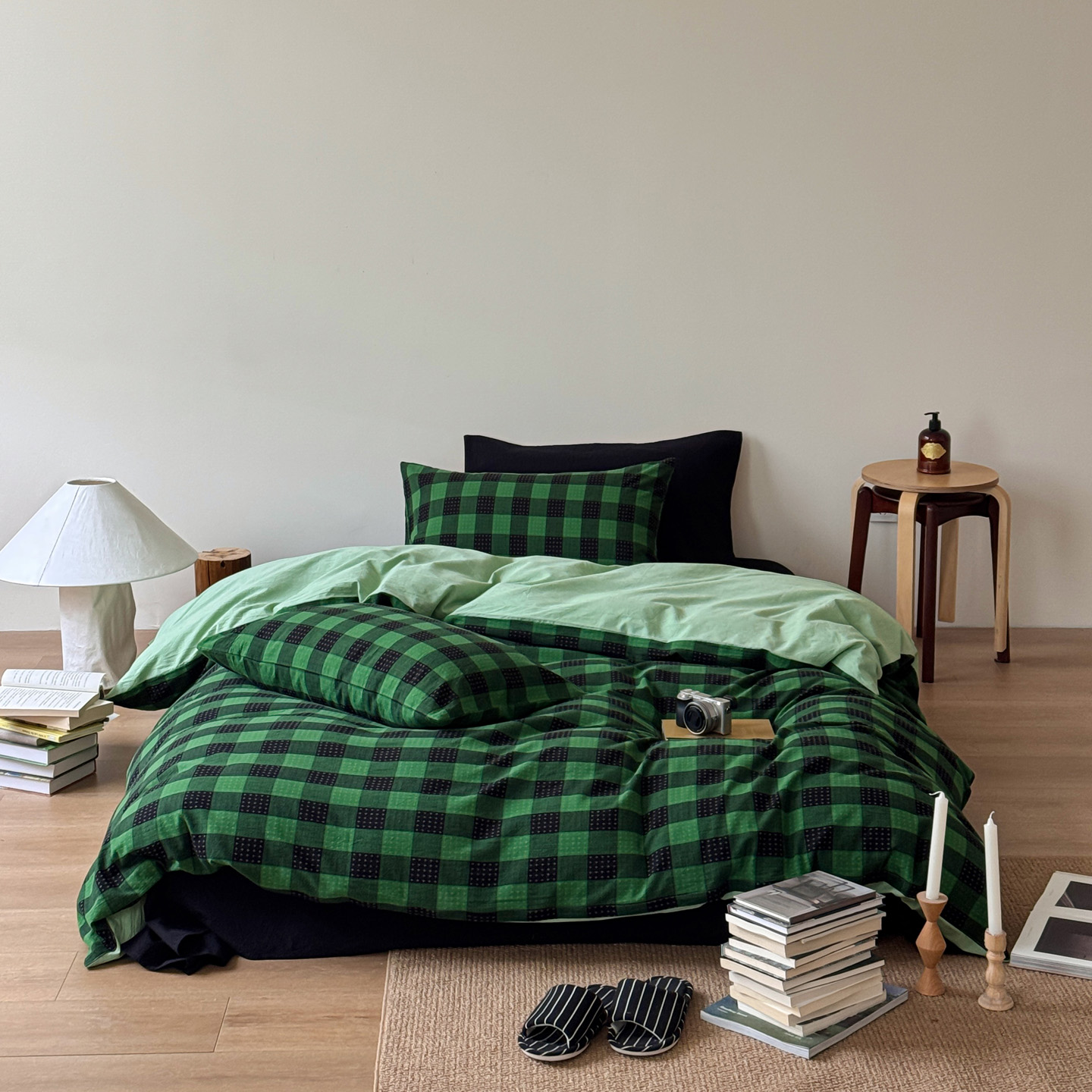 当前位置: 91家纺网 > 商品网购 > 床品套件 > 四件套 > 全棉普通四件套 > 艾沁家纺 2026新款复古风全棉色织水洗提花四件套 绿黑棋盘格十字提花-枕套绿格