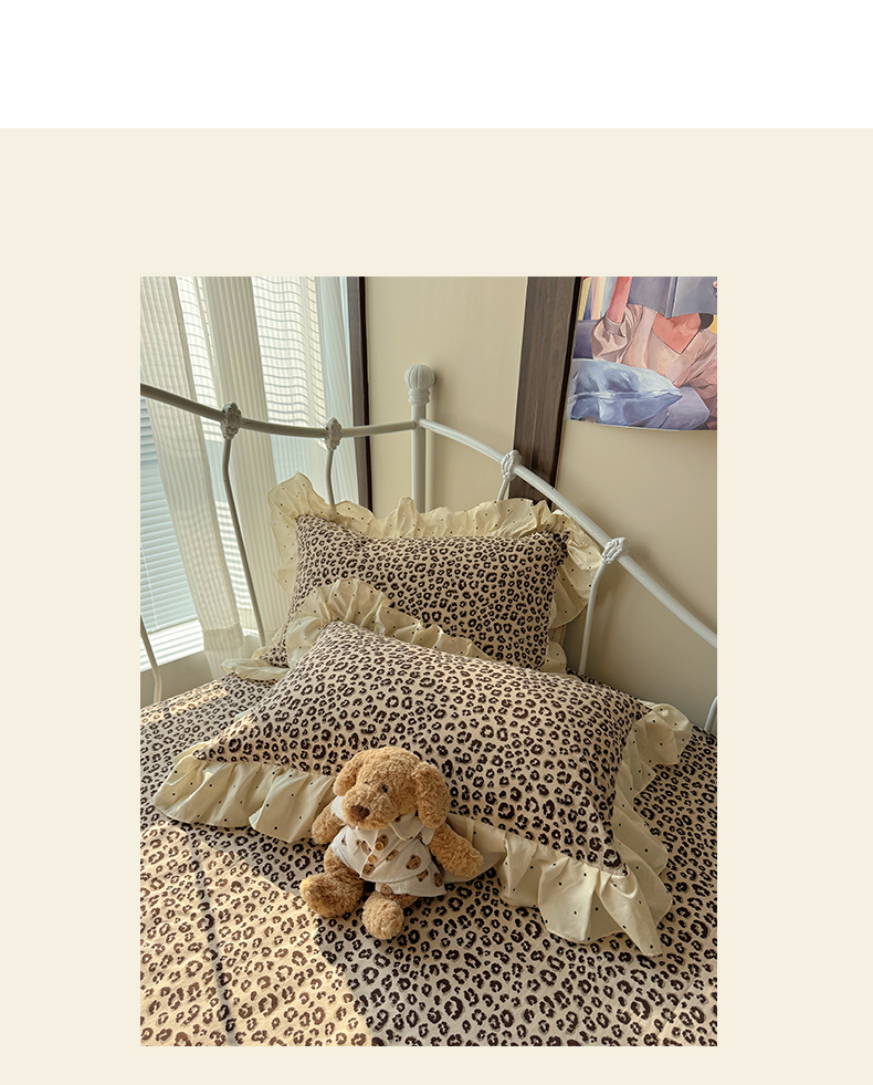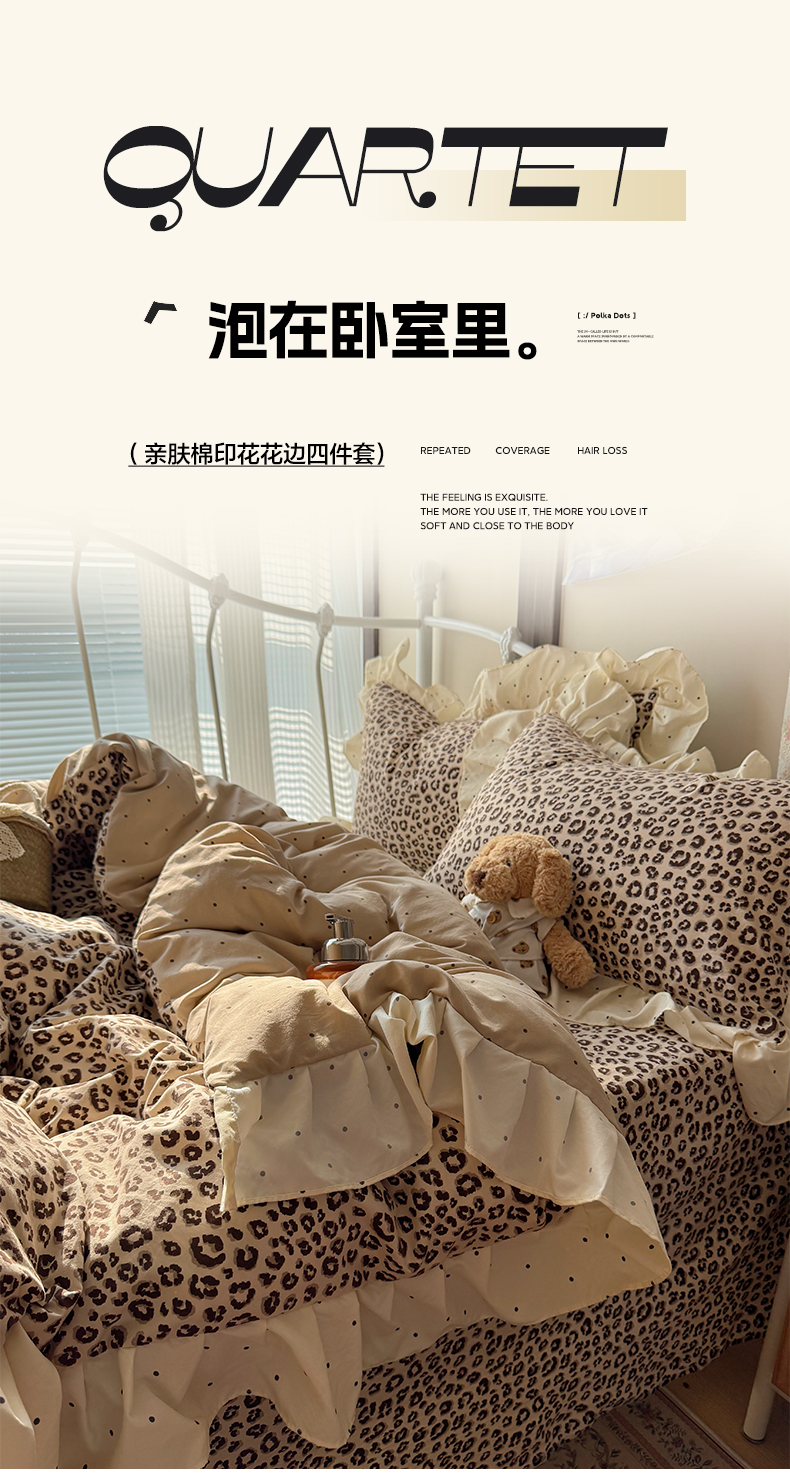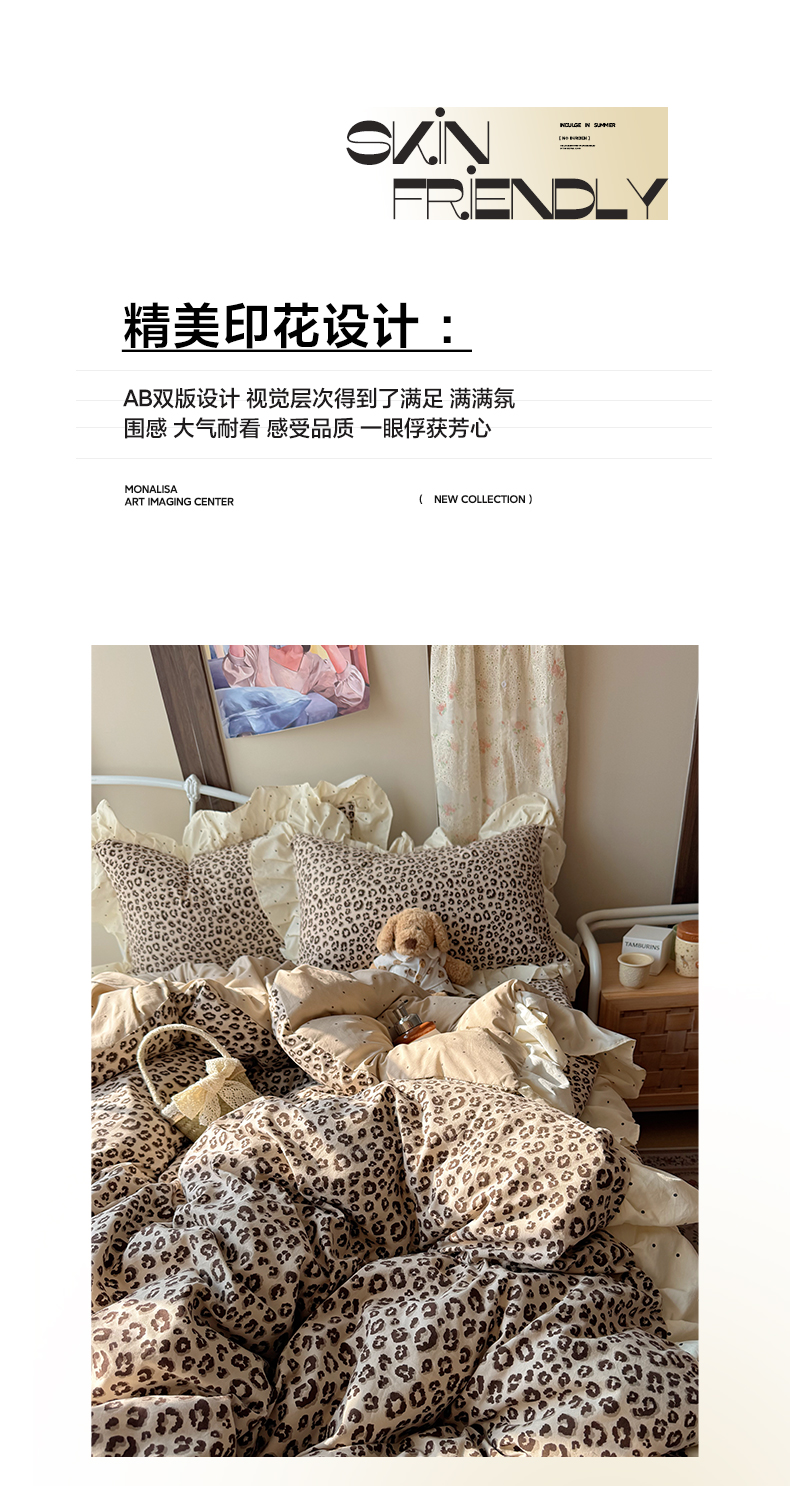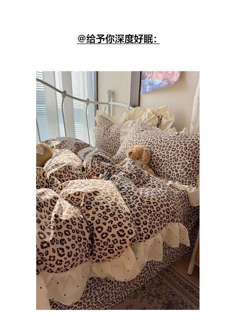 当前位置: 91家纺网 > 商品网购 > 床品套件 > 四件套 > 化纤活性四件套 > 摩妮卡 2026春夏新款韩版公主风花边亲肤棉水洗棉印花四件套 经典豹纹