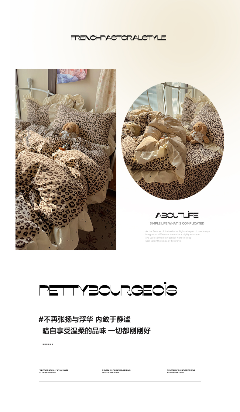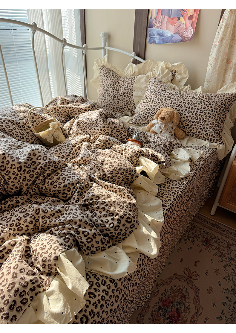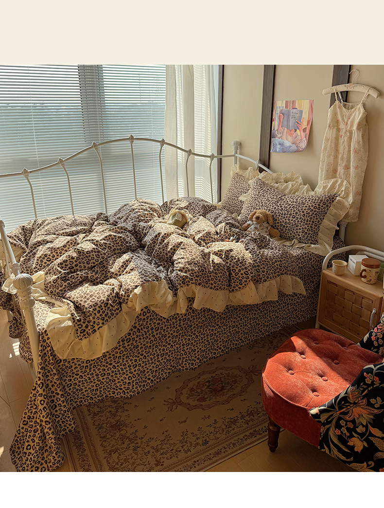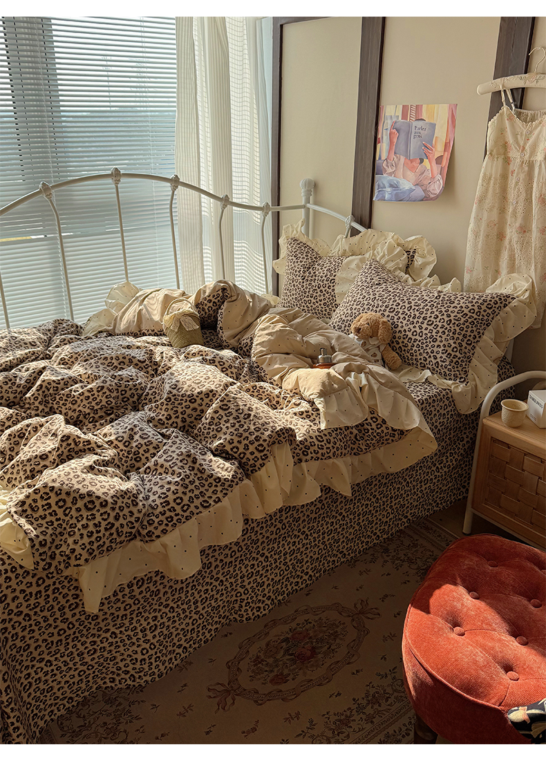 当前位置: 91家纺网 > 商品网购 > 床品套件 > 四件套 > 化纤活性四件套 > 摩妮卡 2026春夏新款韩版公主风花边亲肤棉水洗棉印花四件套 经典豹纹