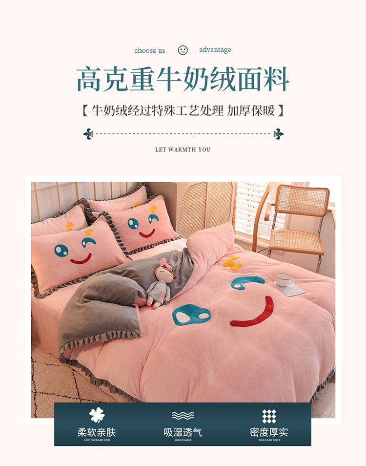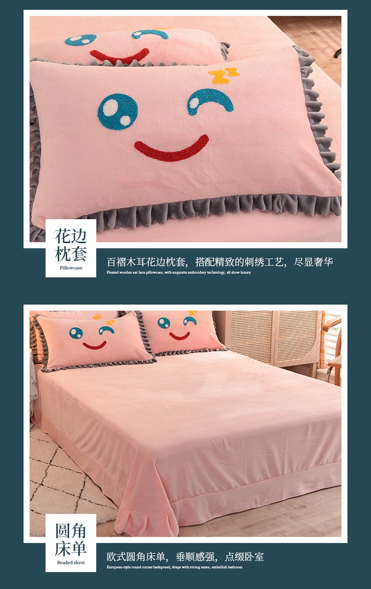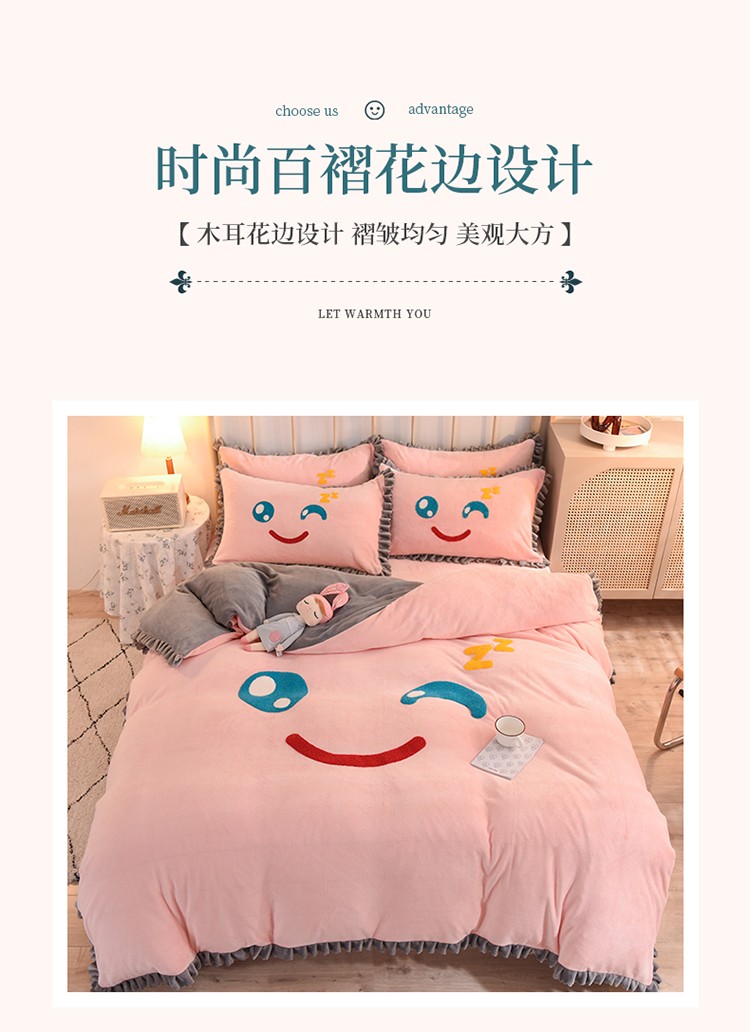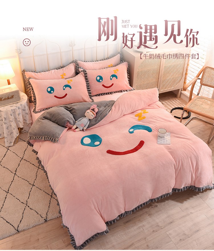兴美佳家纺 新款牛奶绒花边毛巾绣四件套-你的微笑 粉玉