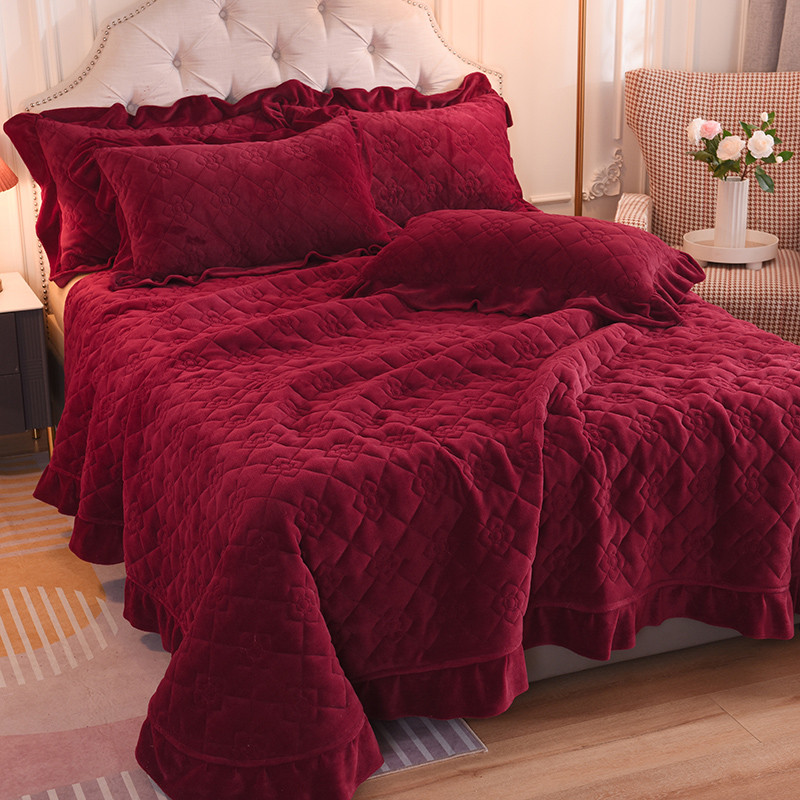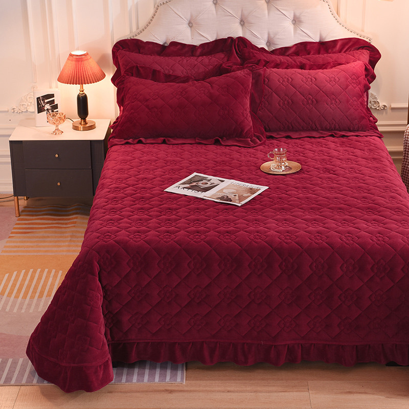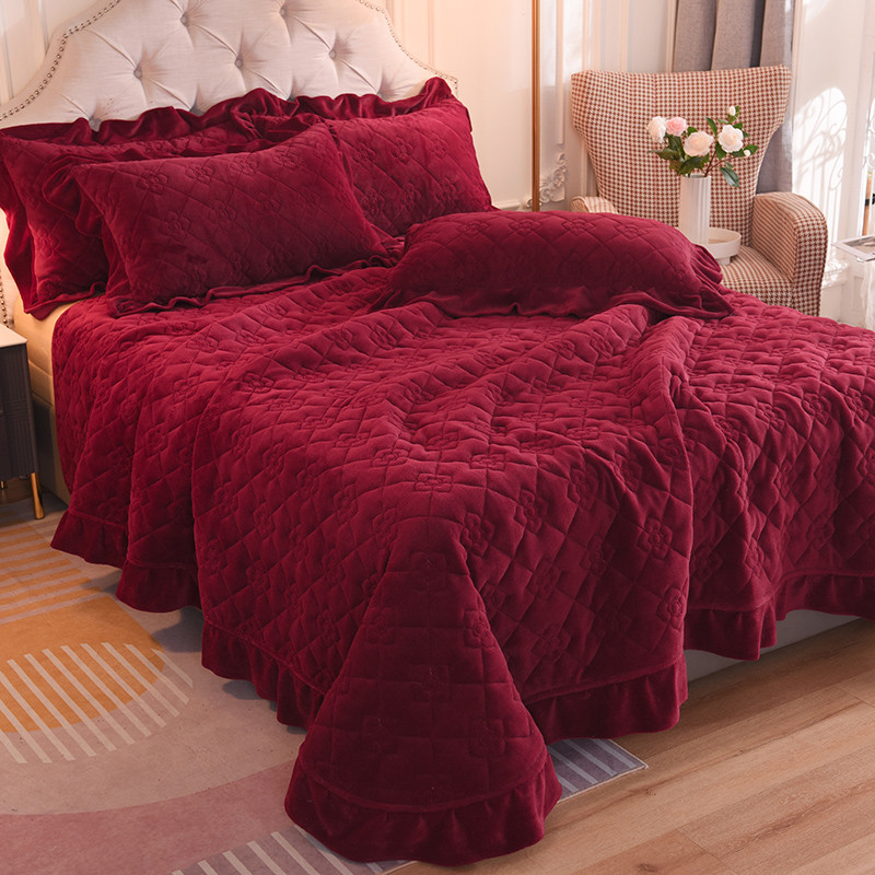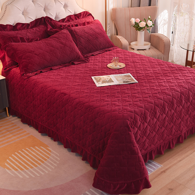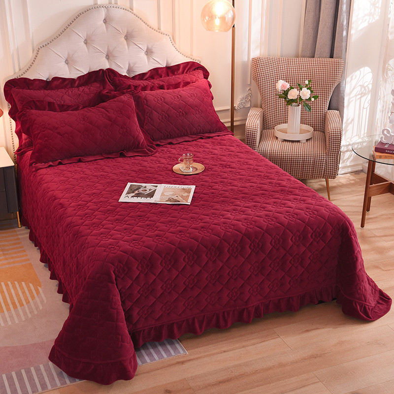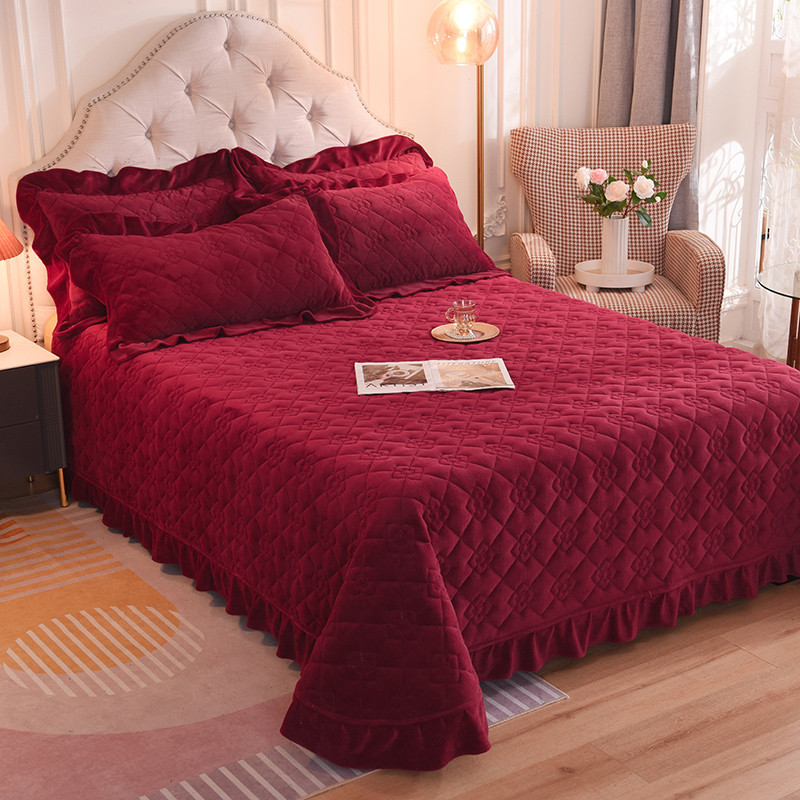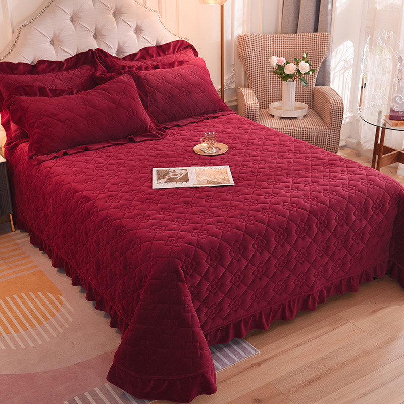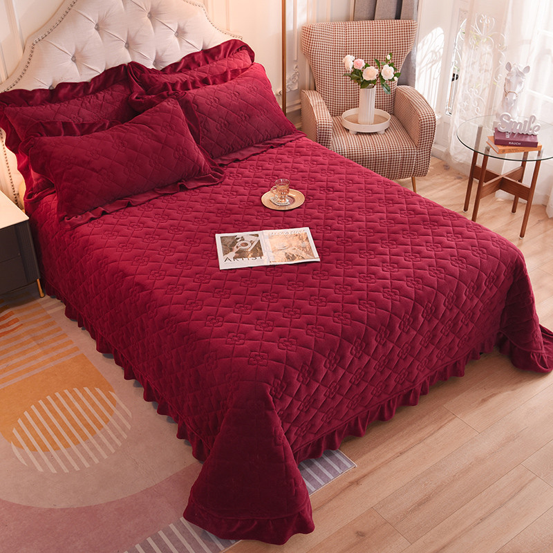 甜之梦 2025新款纯色全棉夹棉防滑花边款床盖 洋酒红