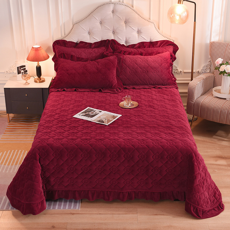 商品名称:甜之梦 2025新款纯色全棉夹棉防滑花边款床盖 洋酒红