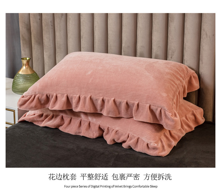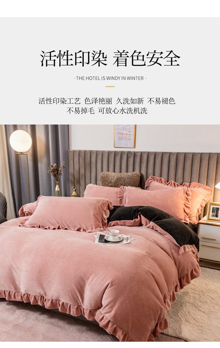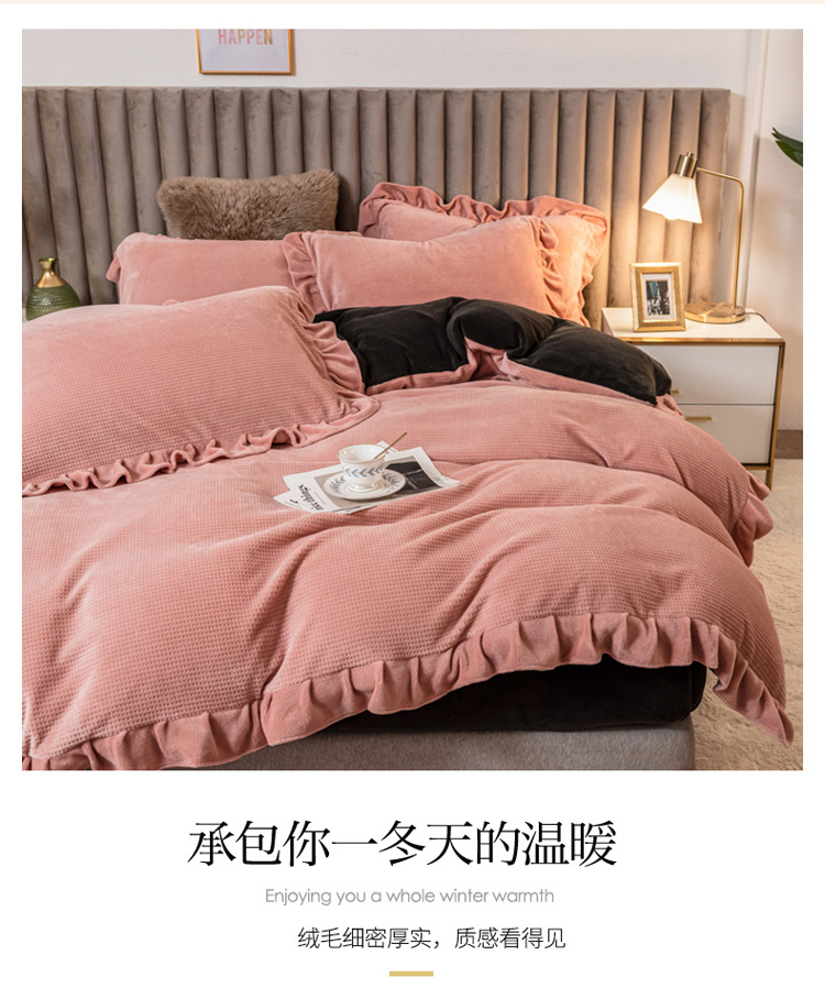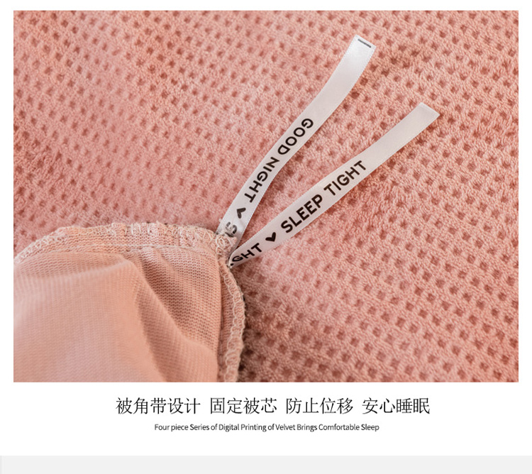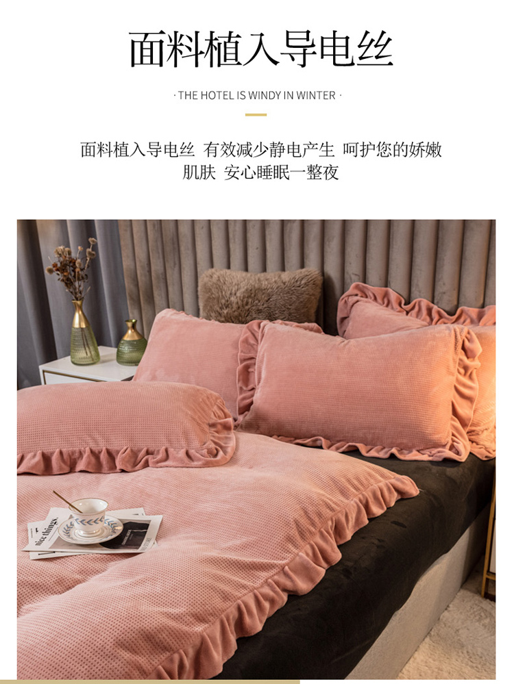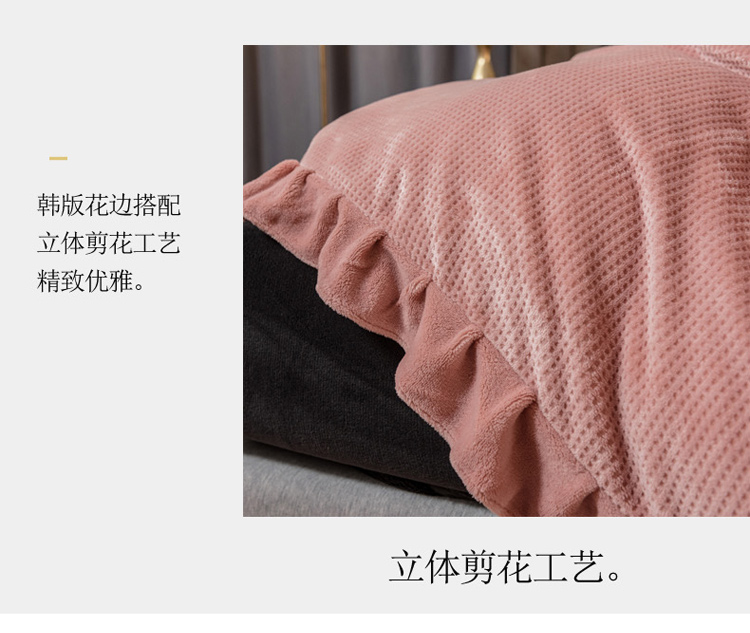 商品名称:印季 2024新款华夫格牛奶绒花边四件套 豆沙-灰
