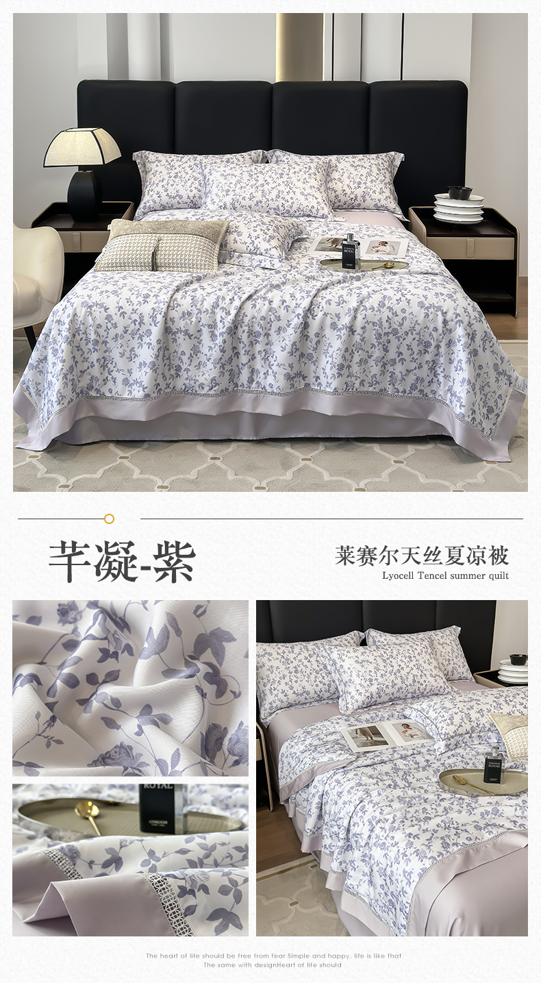 商品名称:娇逸家居 2025新款50支印花莱赛尔天丝夏被镂空款花边夏凉被 芊凝-紫
