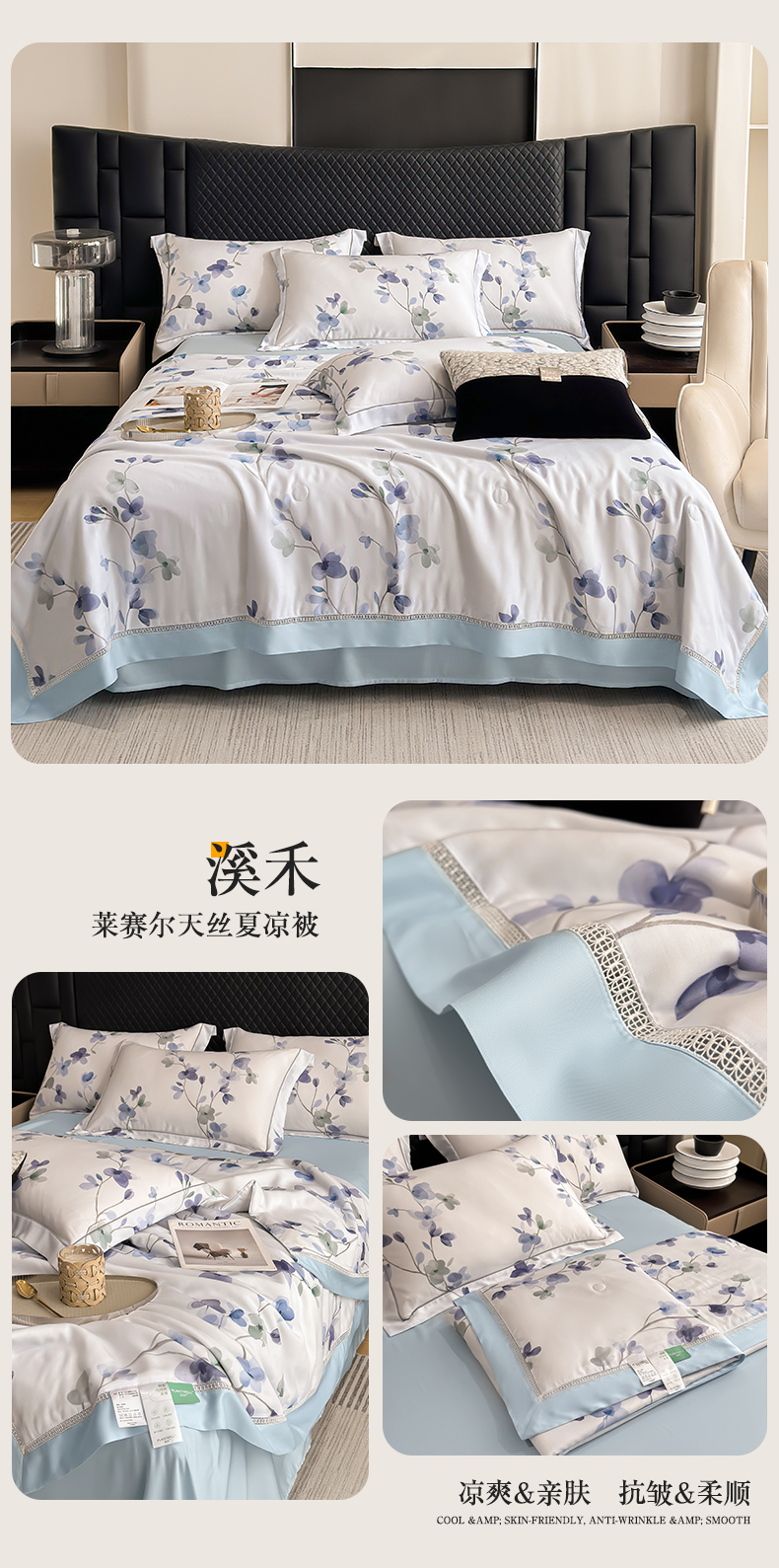 商品名称:娇逸家居 2025新款50支印花莱赛尔天丝夏被镂空款花边夏凉被 溪禾