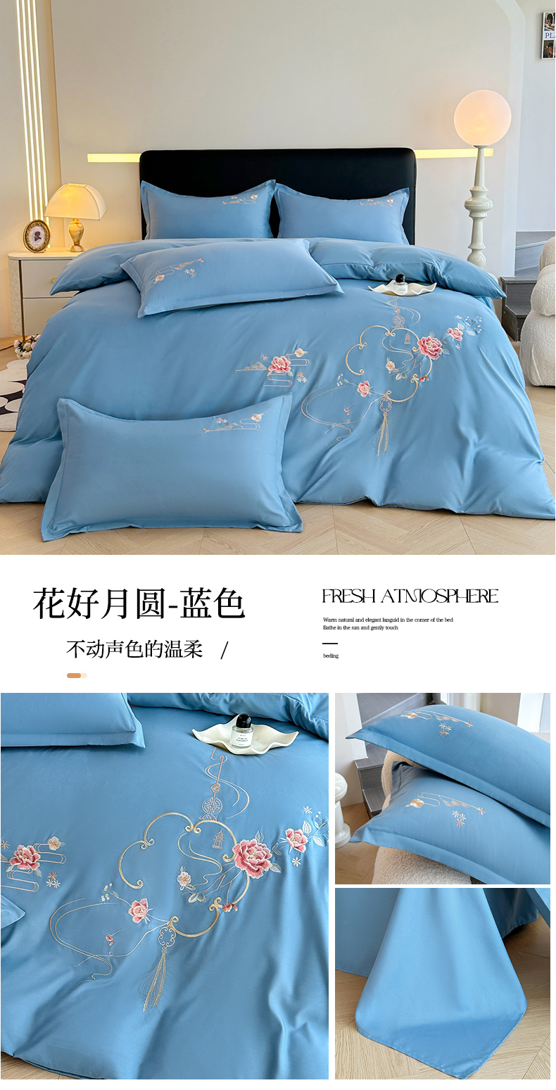 商品名称:帝菲妮 2025新款国潮风高克重超柔水洗棉针织棉糯小棉带质检报告刺绣四件套--花好月圆 花好月圆-蓝色