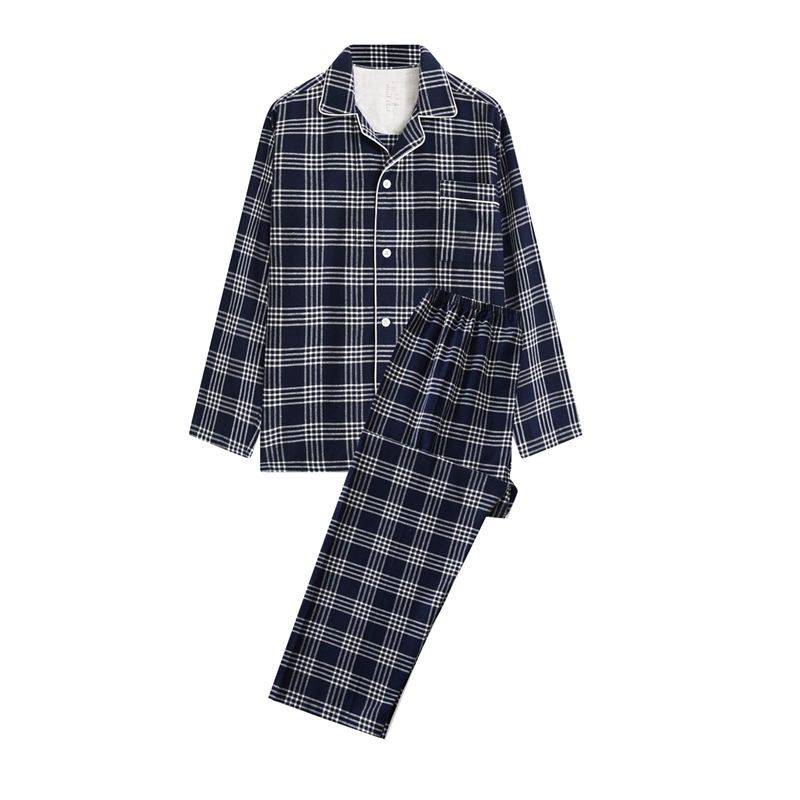 伊嫚家居 2025新款无印日式双股全棉法兰绒家居服良品睡衣女纯棉直播秋冬款情侣睡衣 藏青色大格男