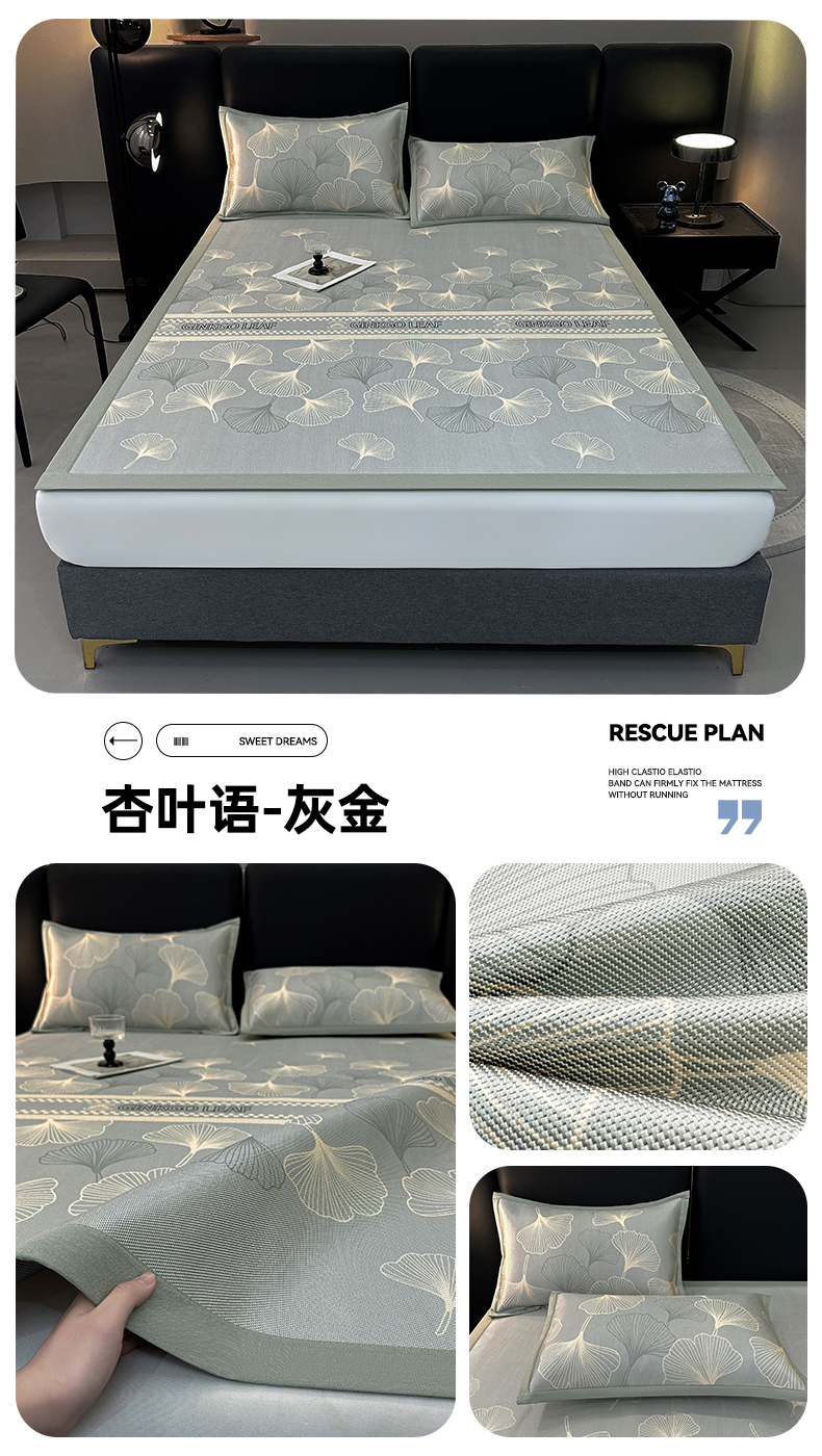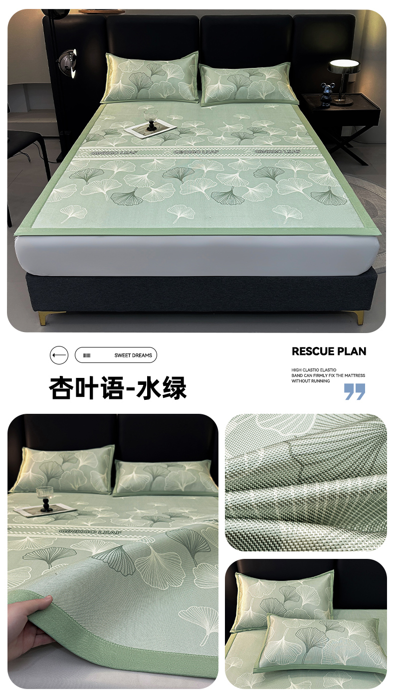 商品名称:全季家居 2025新款A类轻奢系列数码印花冰藤席凉席席子 杏叶语-水绿 床笠