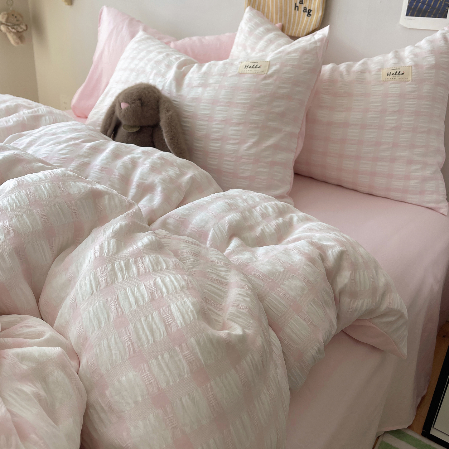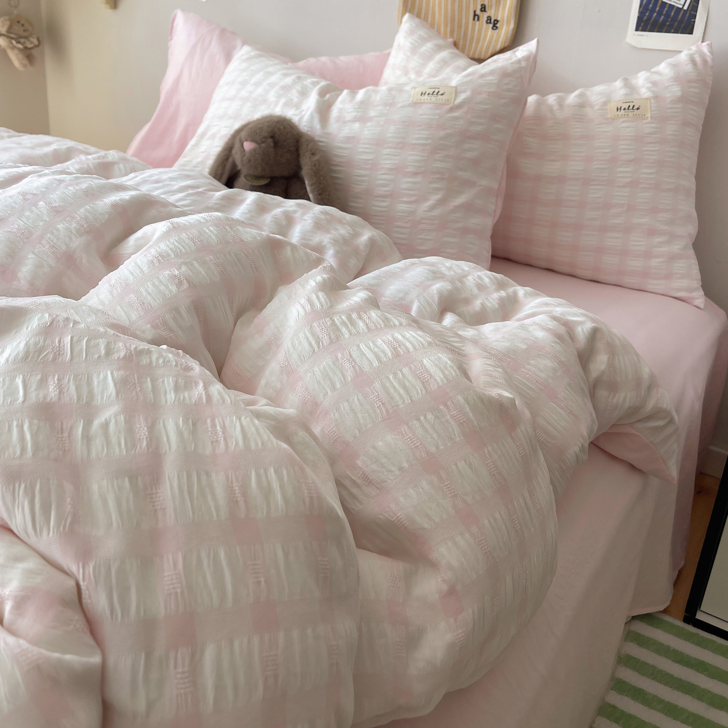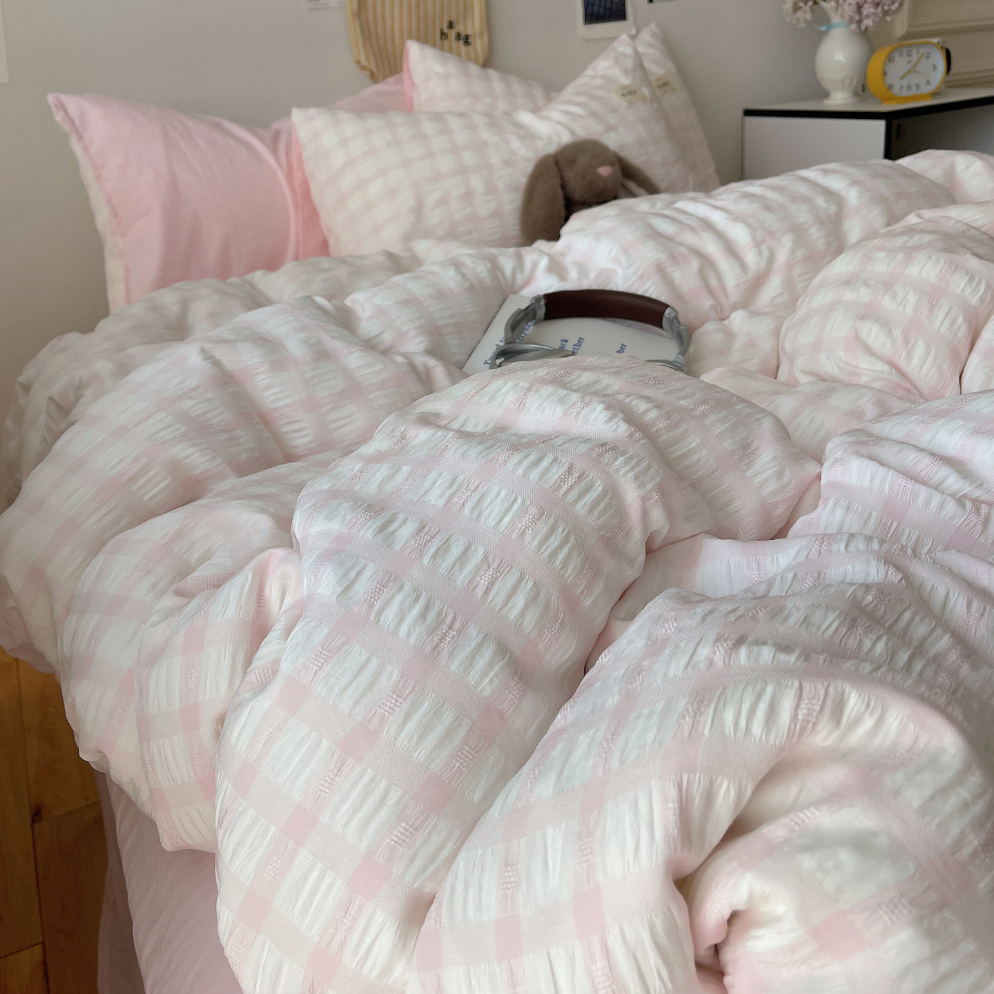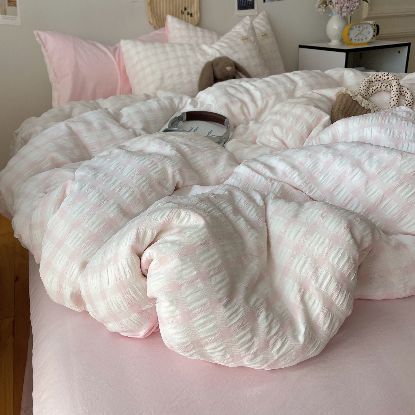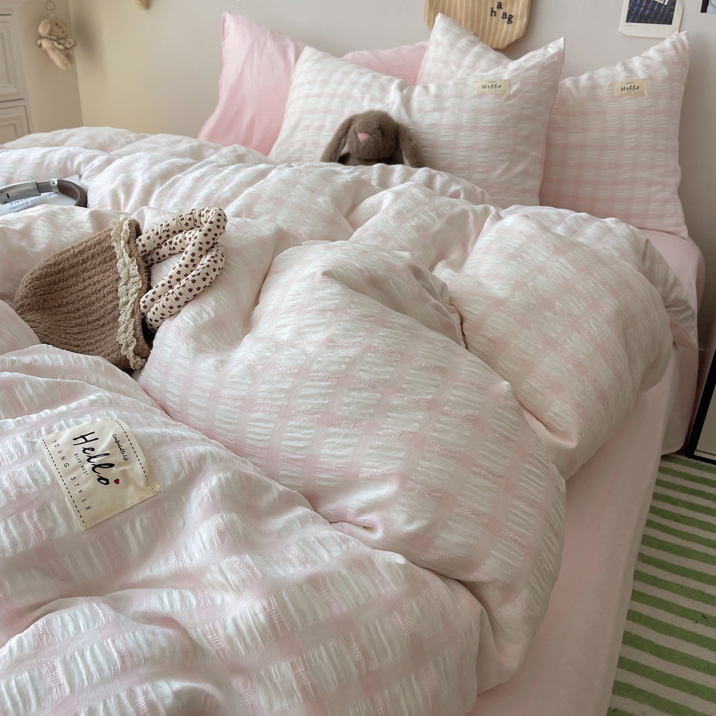 当前位置: 91家纺网 > 商品网购 > 床品套件 > 四件套 > 双层纱四件套 > 顾里2025新款韩系格子阳离子泡泡纱四件套-第二组 少女粉格