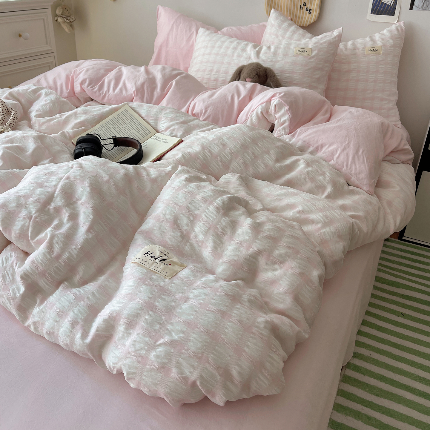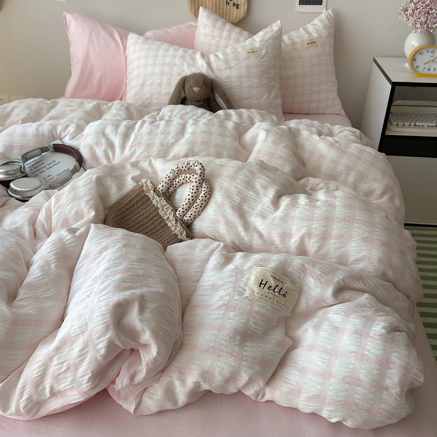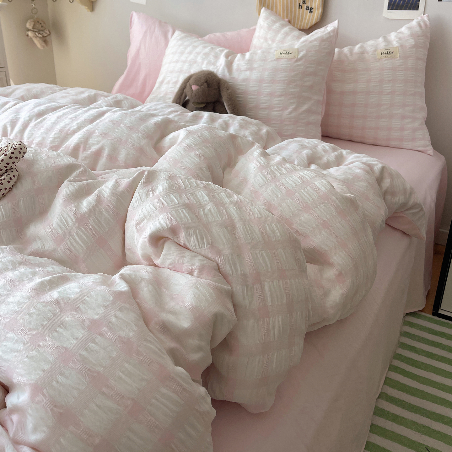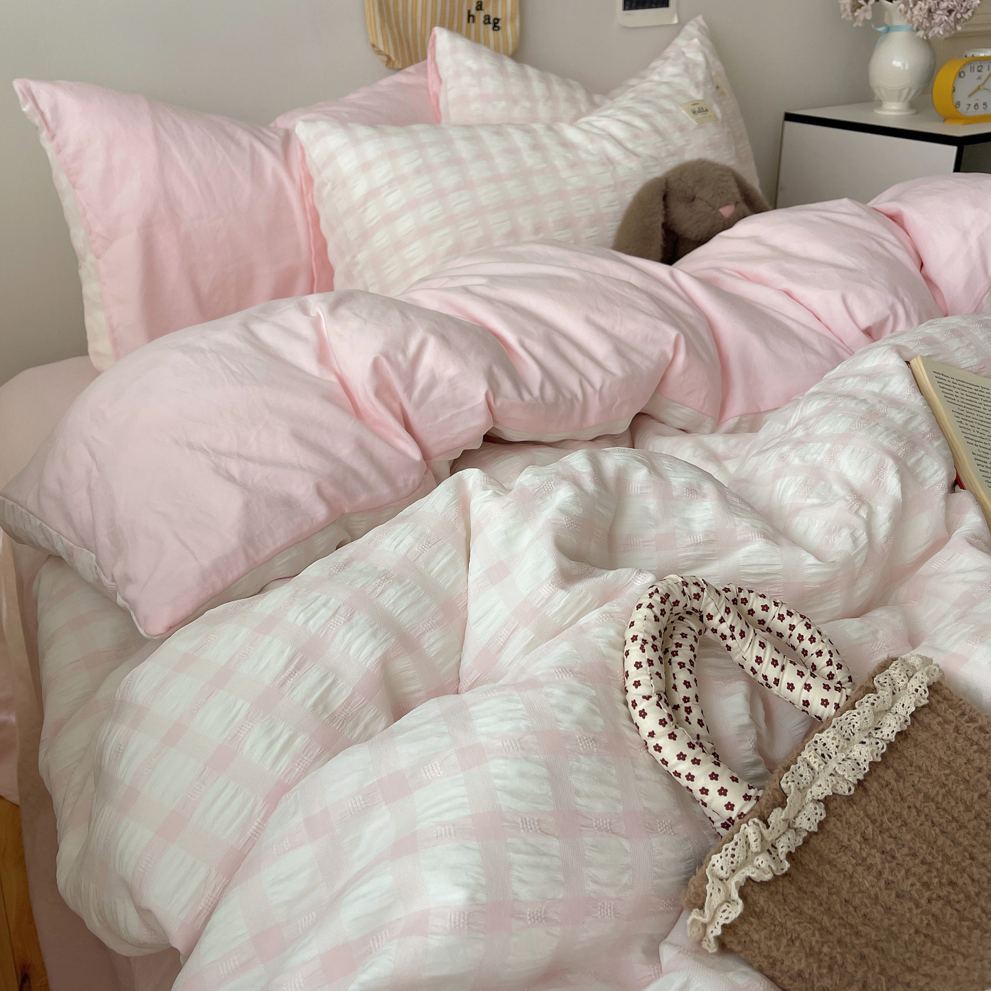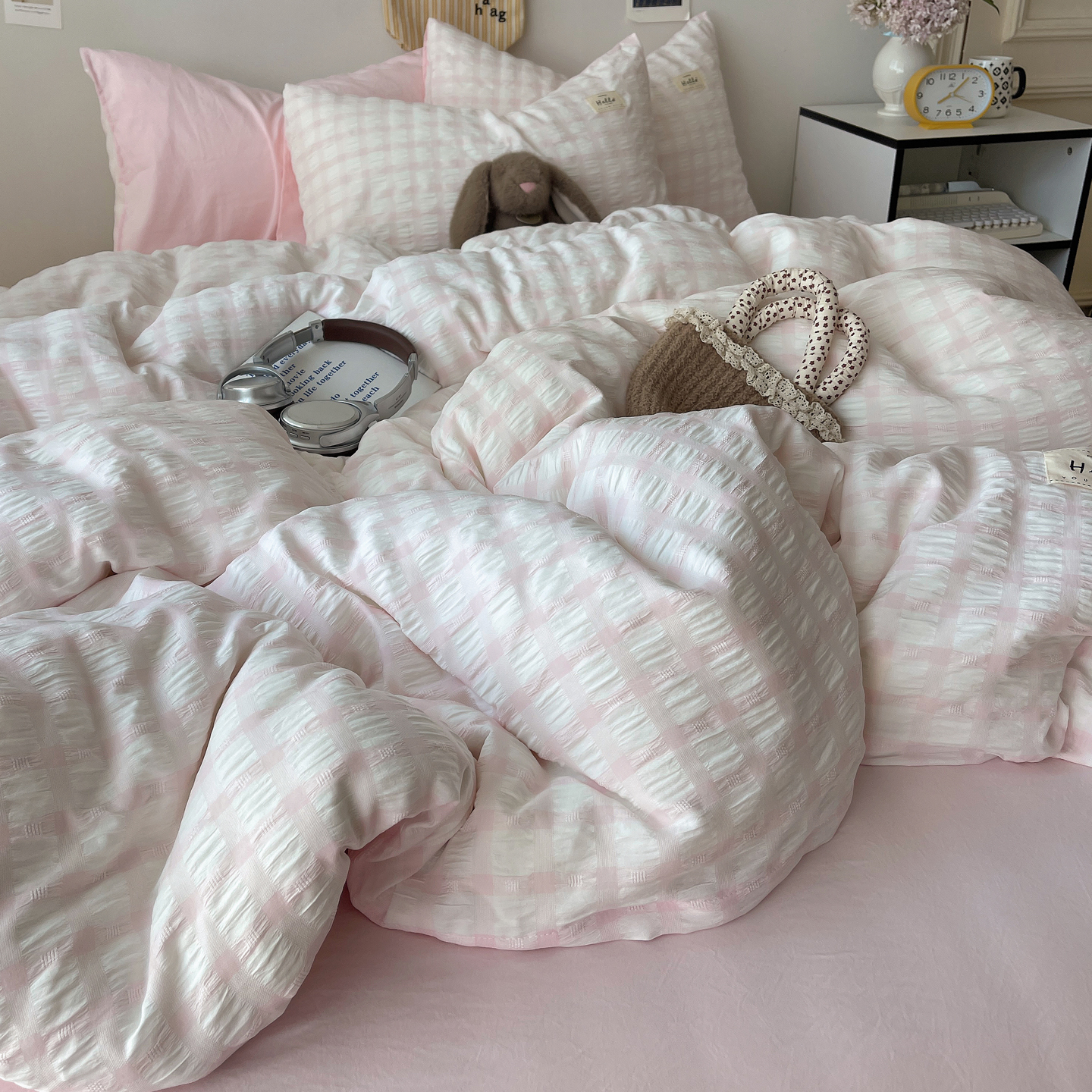 当前位置: 91家纺网 > 商品网购 > 床品套件 > 四件套 > 双层纱四件套 > 顾里2025新款韩系格子阳离子泡泡纱四件套-第二组 少女粉格