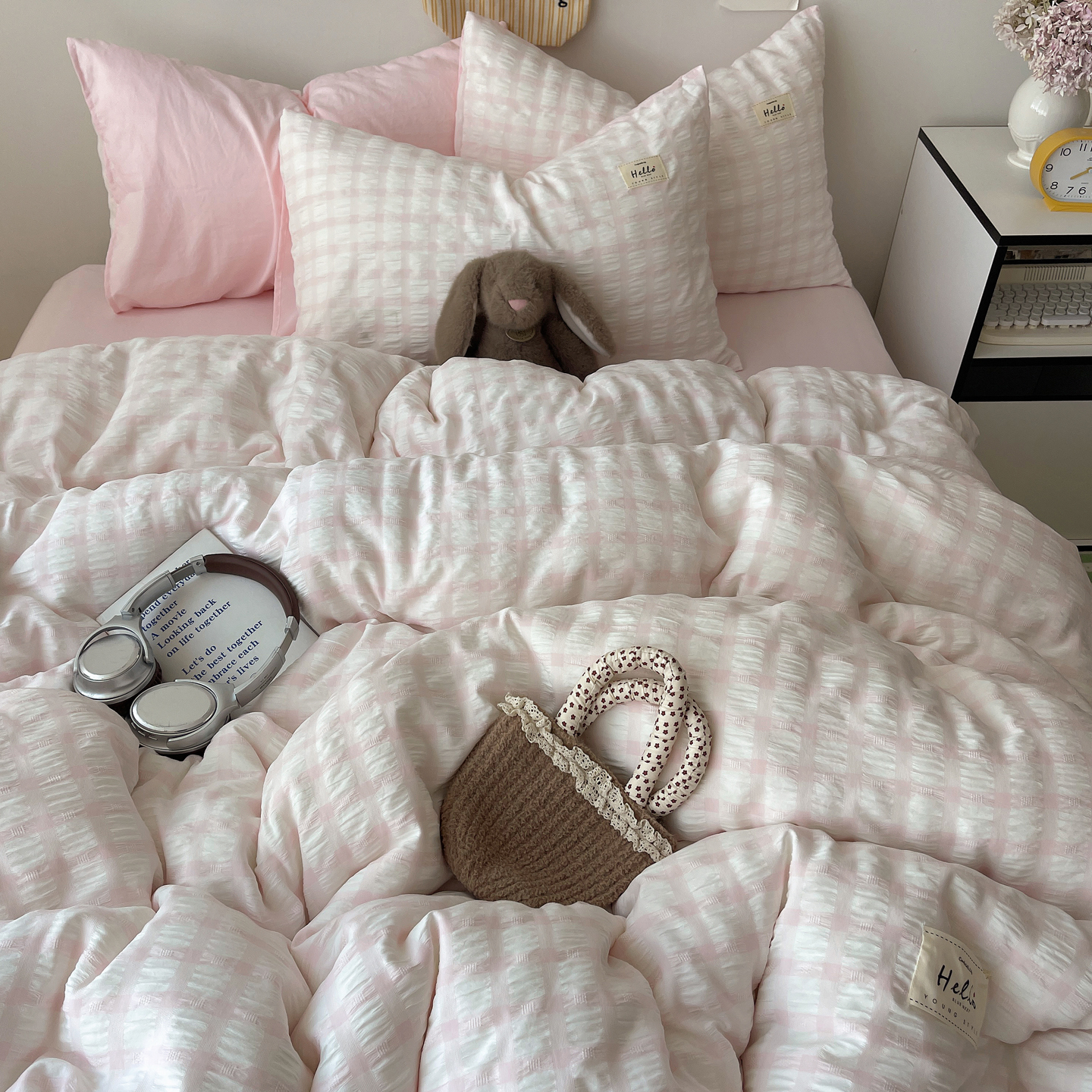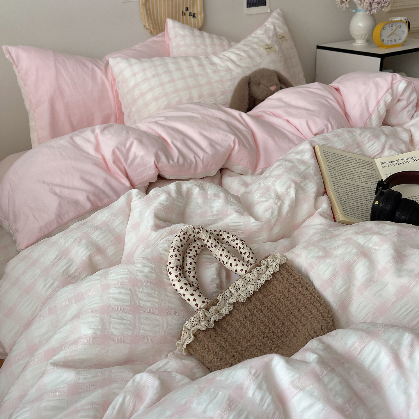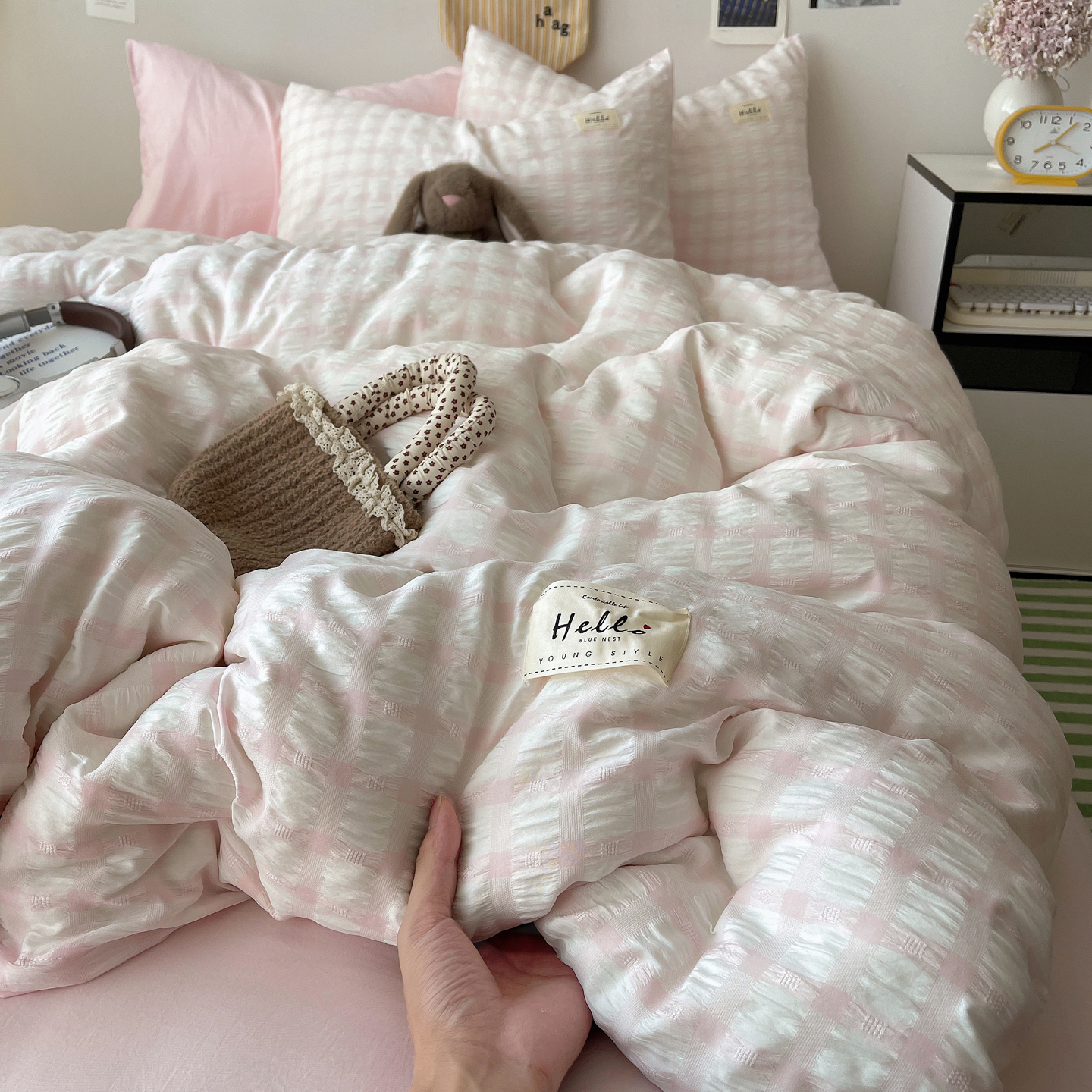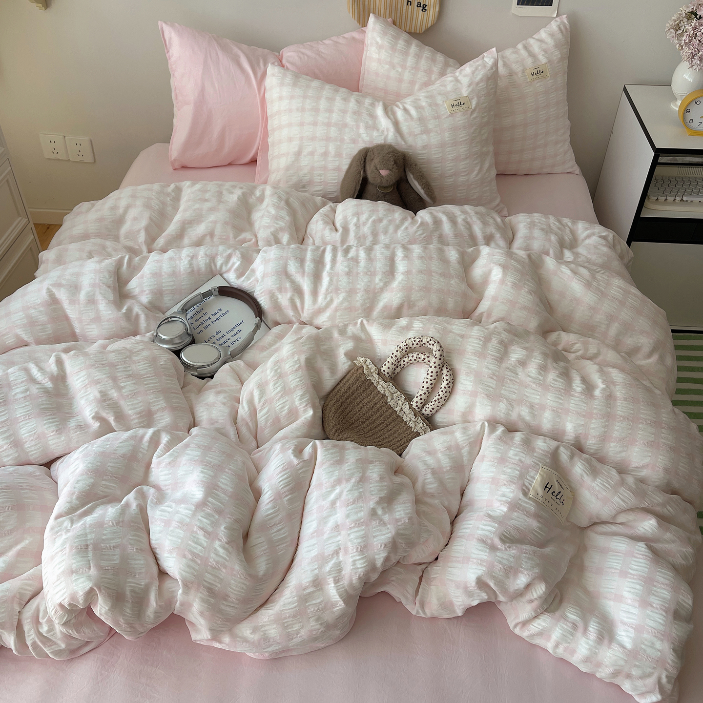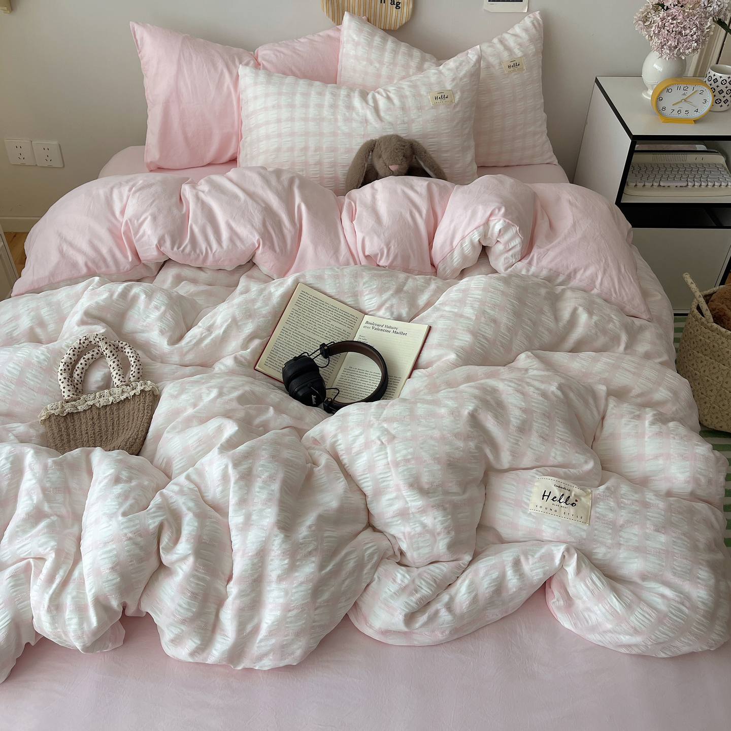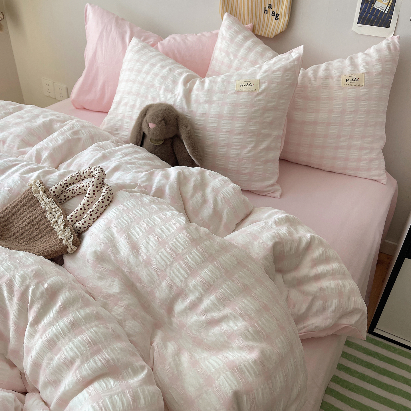 当前位置: 91家纺网 > 商品网购 > 床品套件 > 四件套 > 双层纱四件套 > 顾里2025新款韩系格子阳离子泡泡纱四件套-第二组 少女粉格