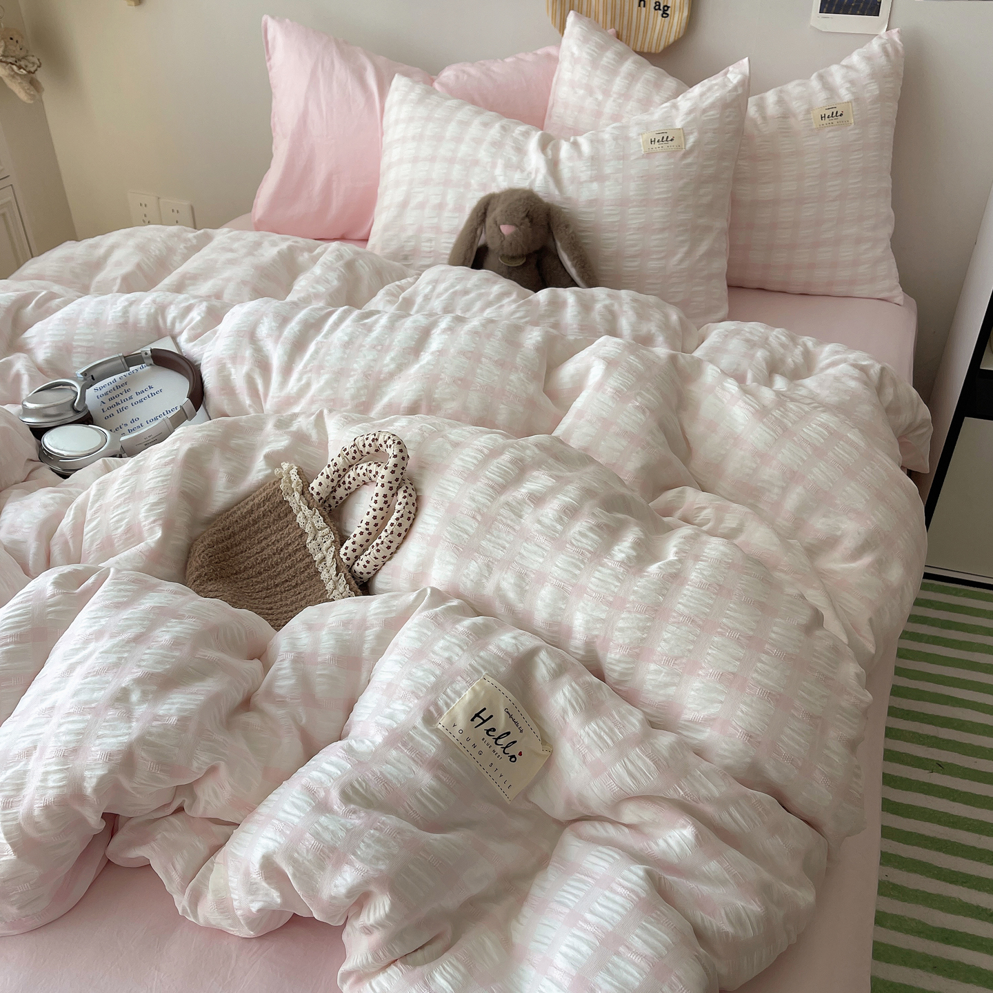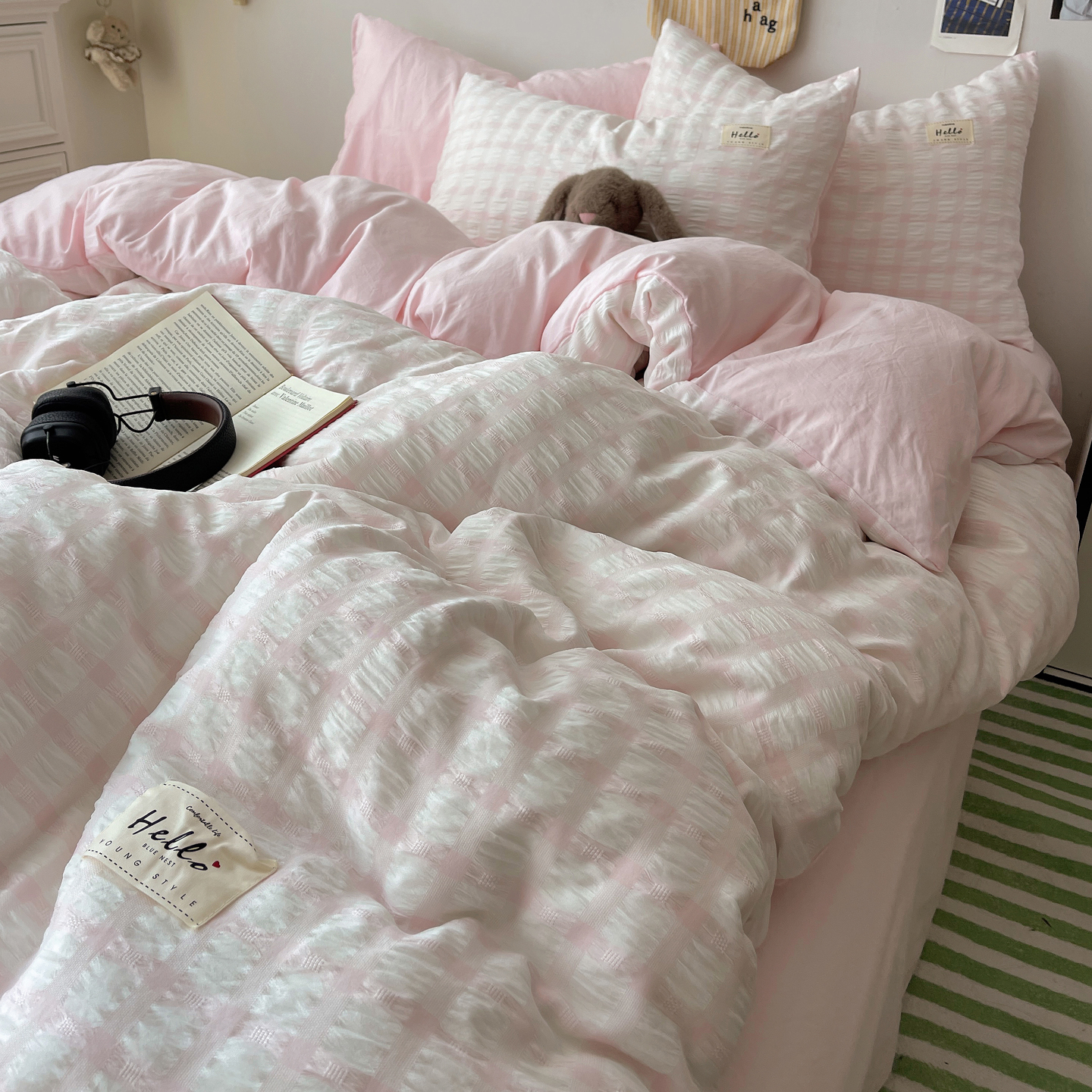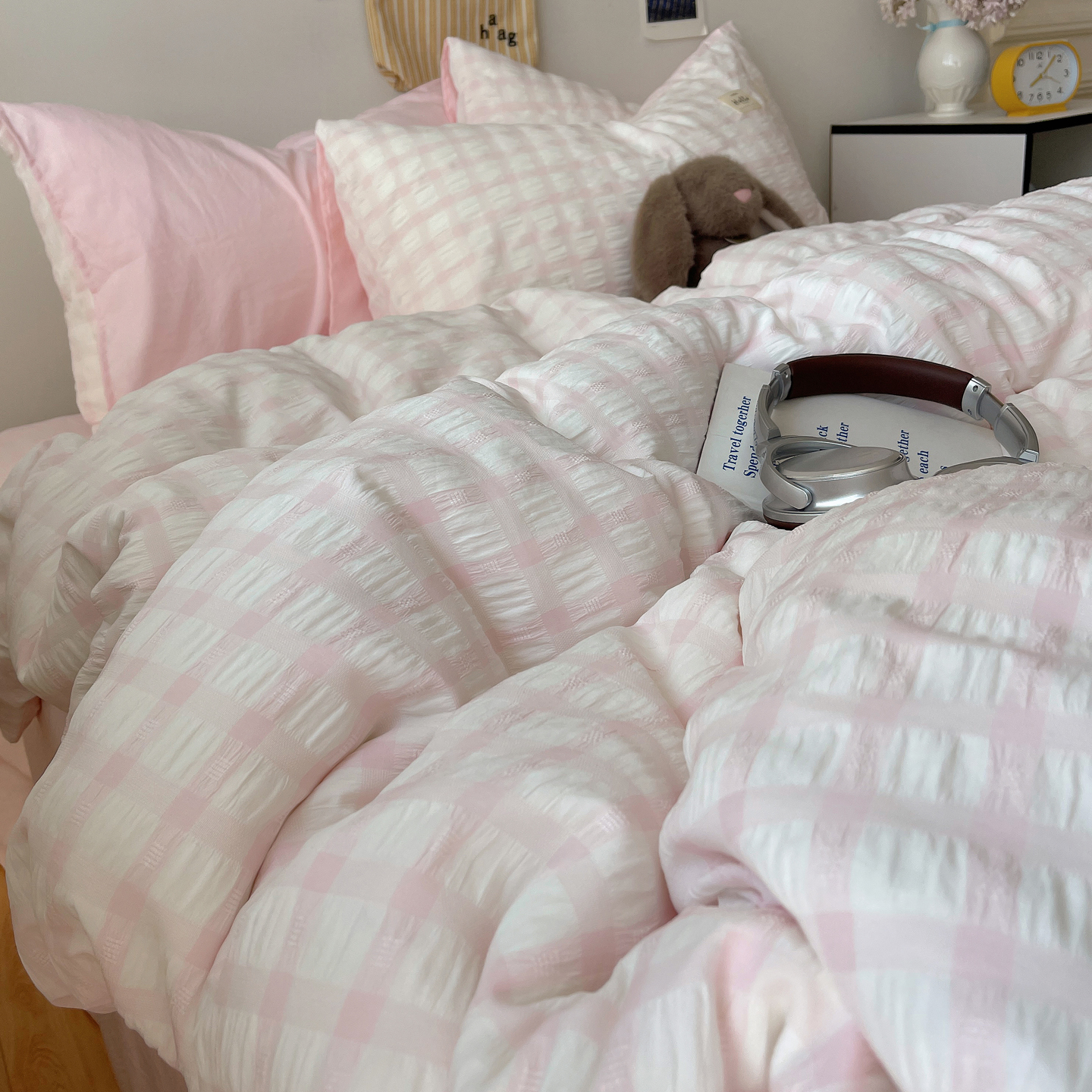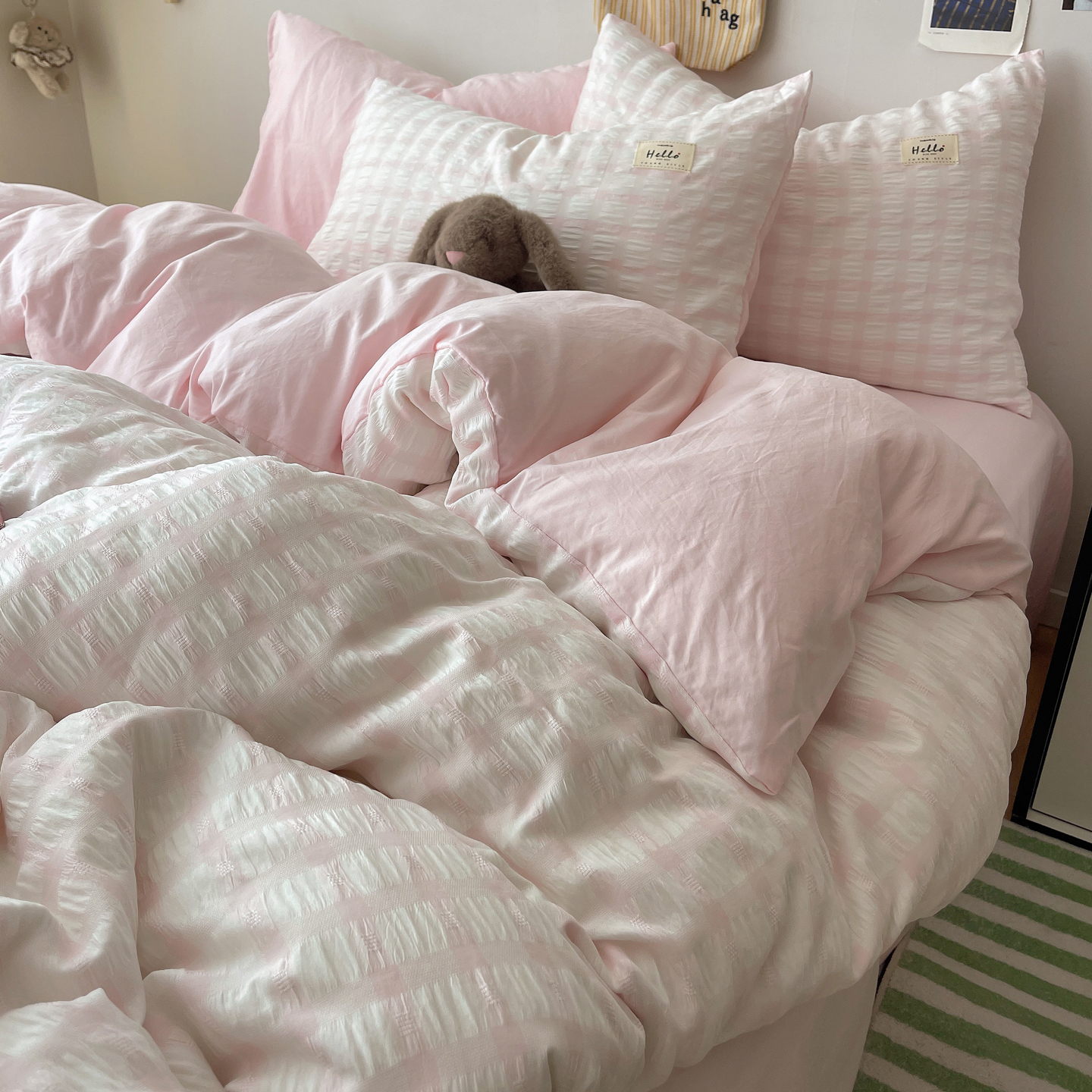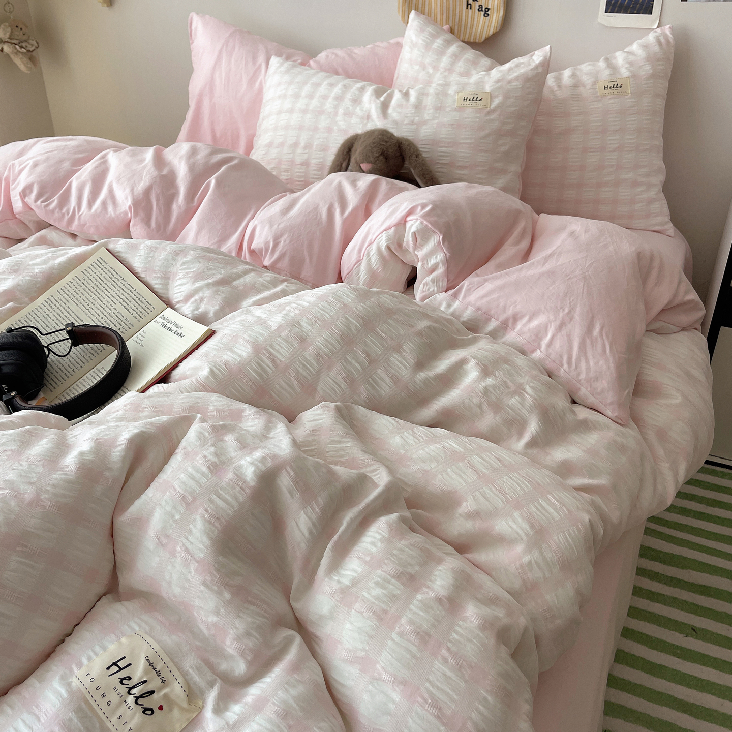当前位置: 91家纺网 > 商品网购 > 床品套件 > 四件套 > 双层纱四件套 > 顾里2025新款韩系格子阳离子泡泡纱四件套-第二组 少女粉格