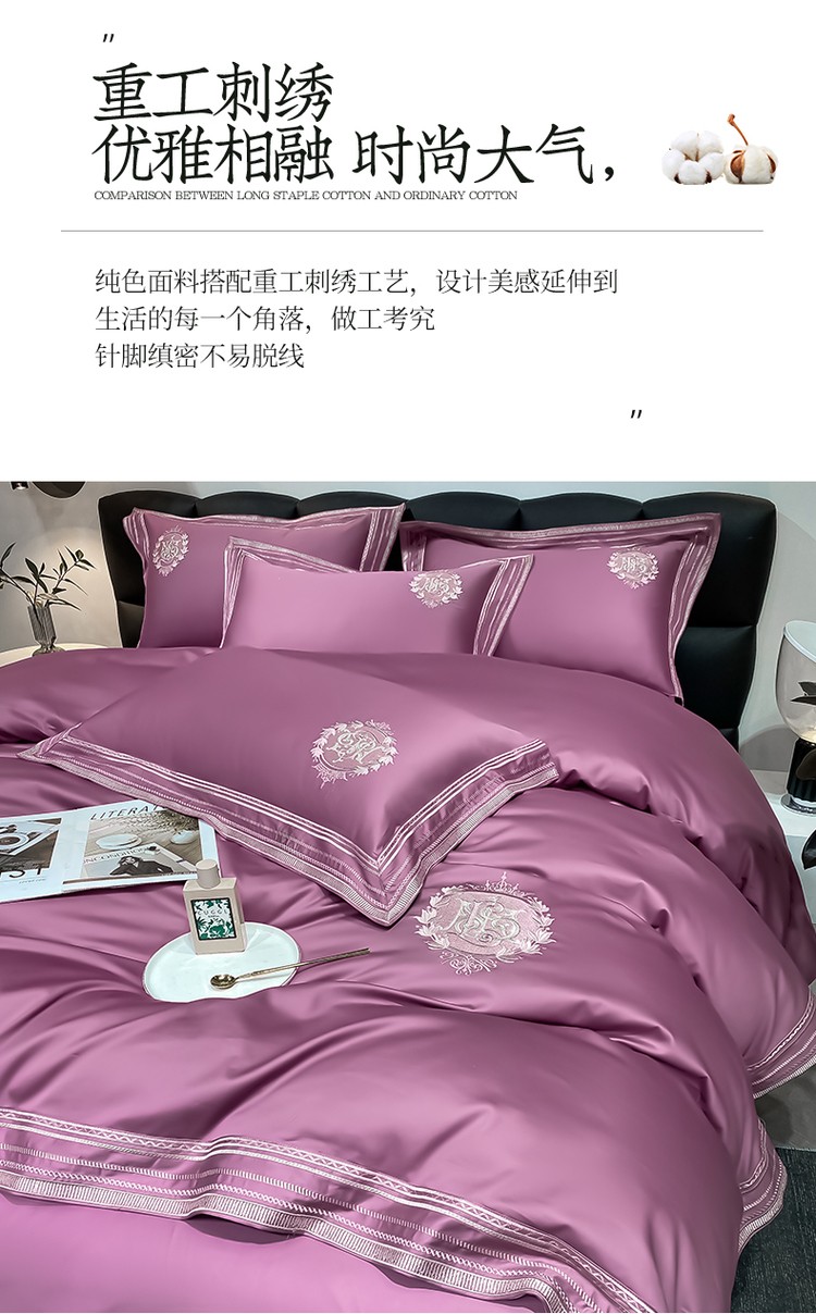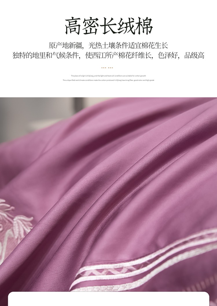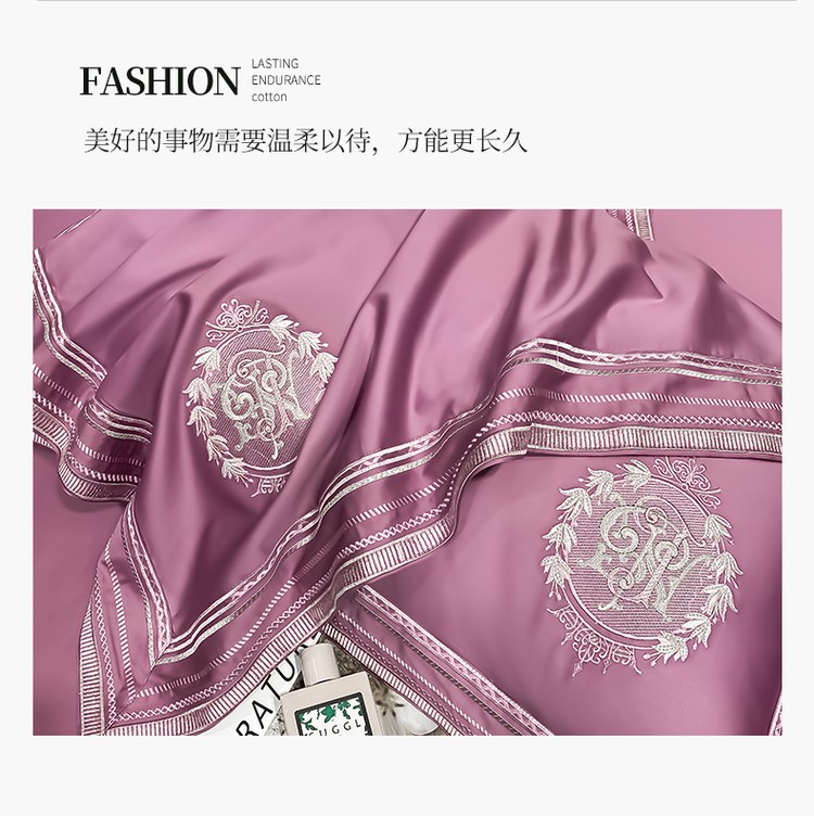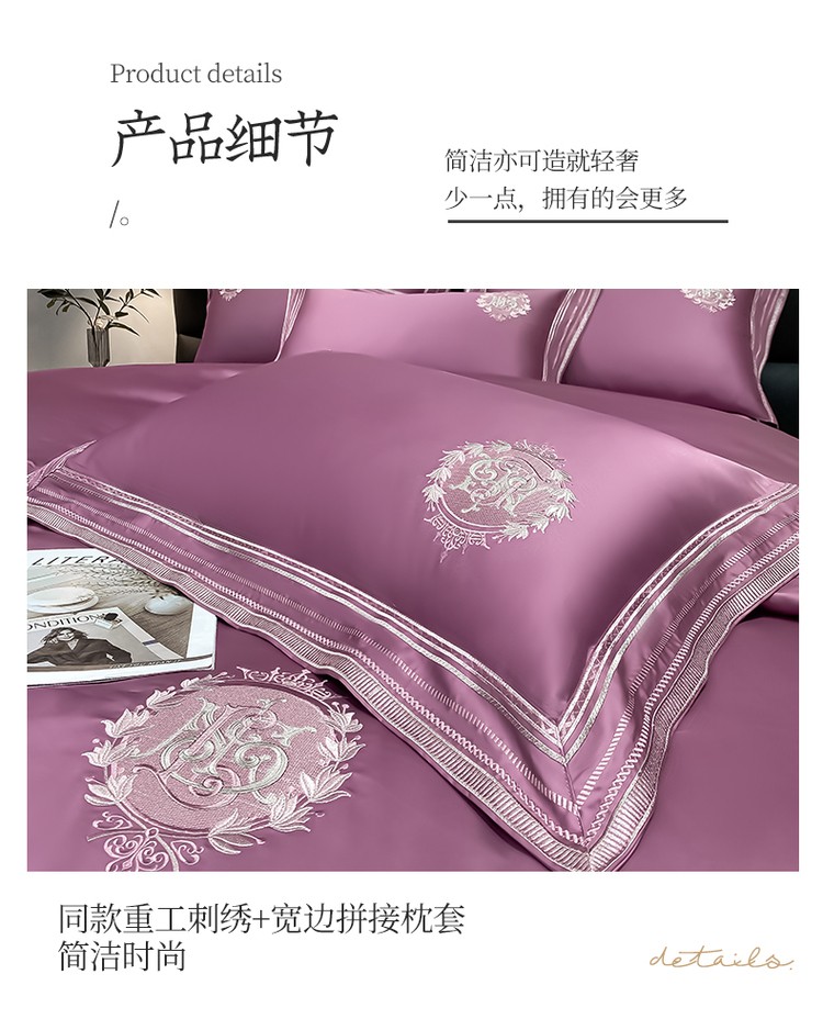 柔觉家纺 天丝刺绣贡缎提花全棉四件套,卡曼时尚-粉紫