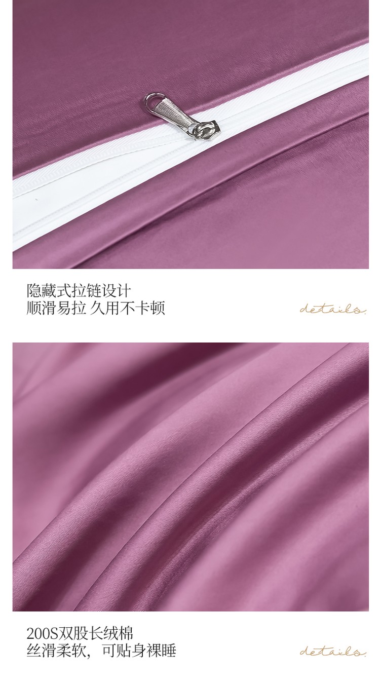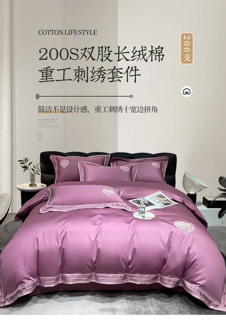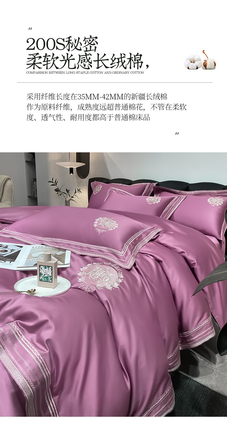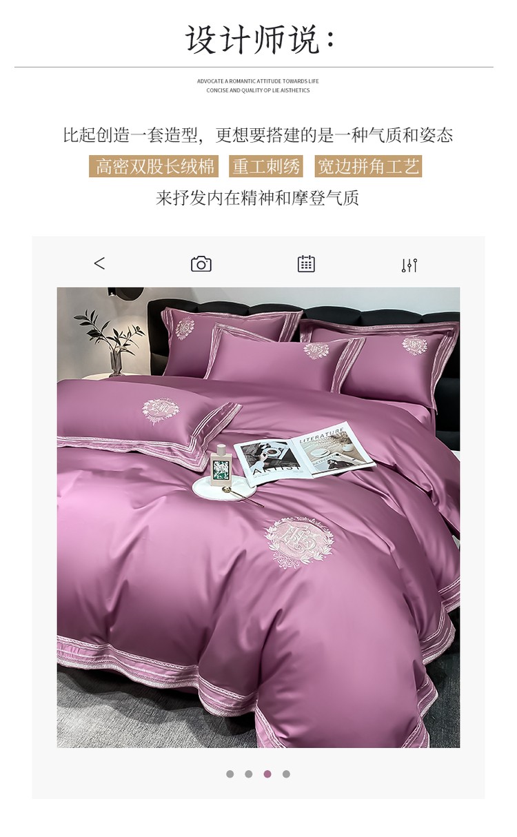 柔觉家纺 天丝刺绣贡缎提花全棉四件套,卡曼时尚-粉紫