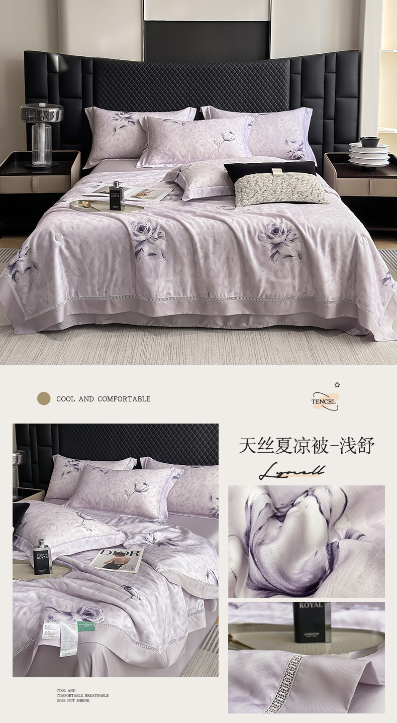 商品名称:娇逸家居 2025新款50支印花莱赛尔天丝夏被镂空款花边夏凉被 浅舒