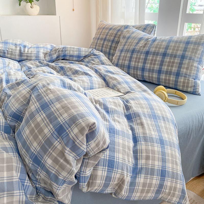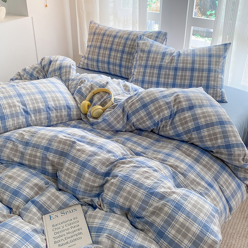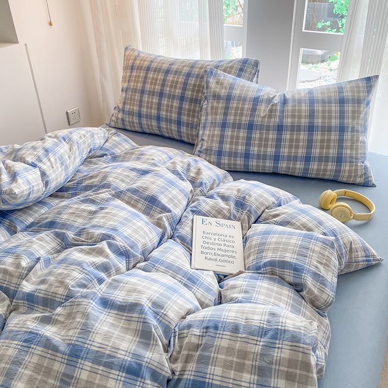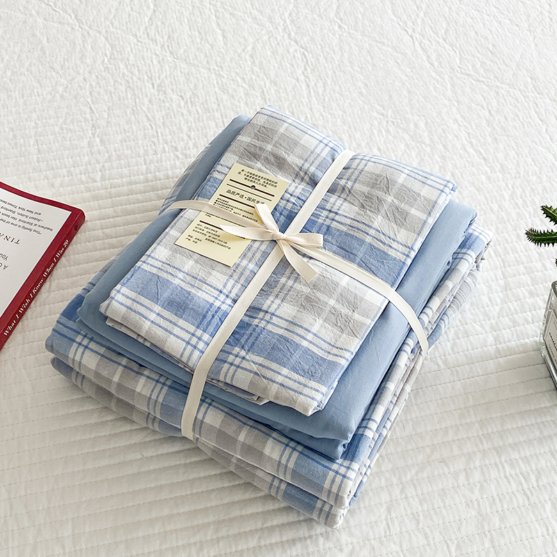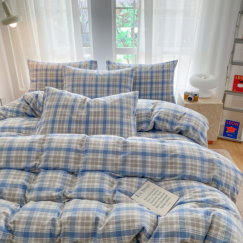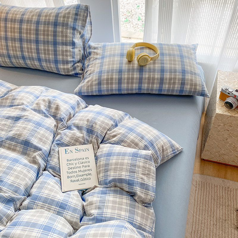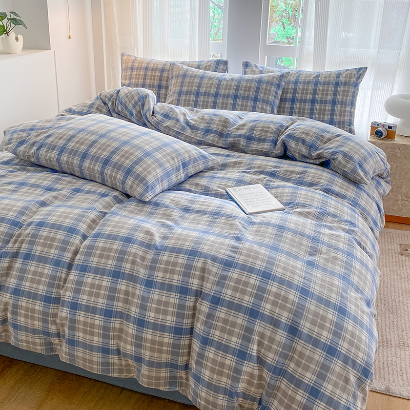 尚品本色 2024新款简约风水洗棉格子条纹系列四件套圣代-蓝
