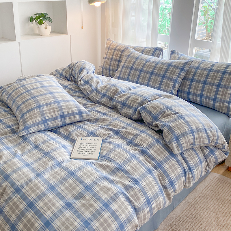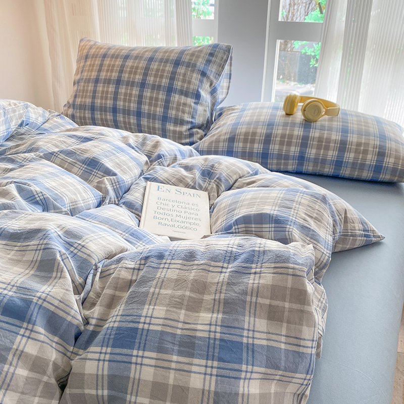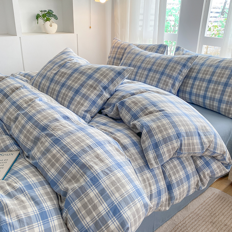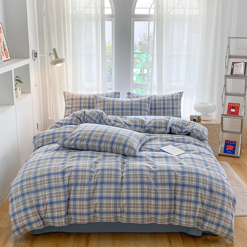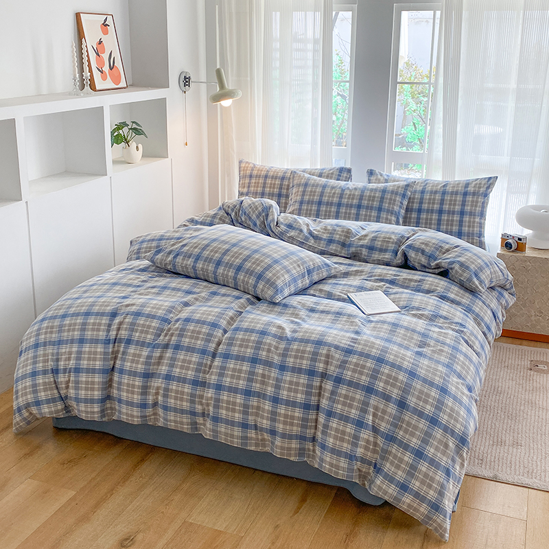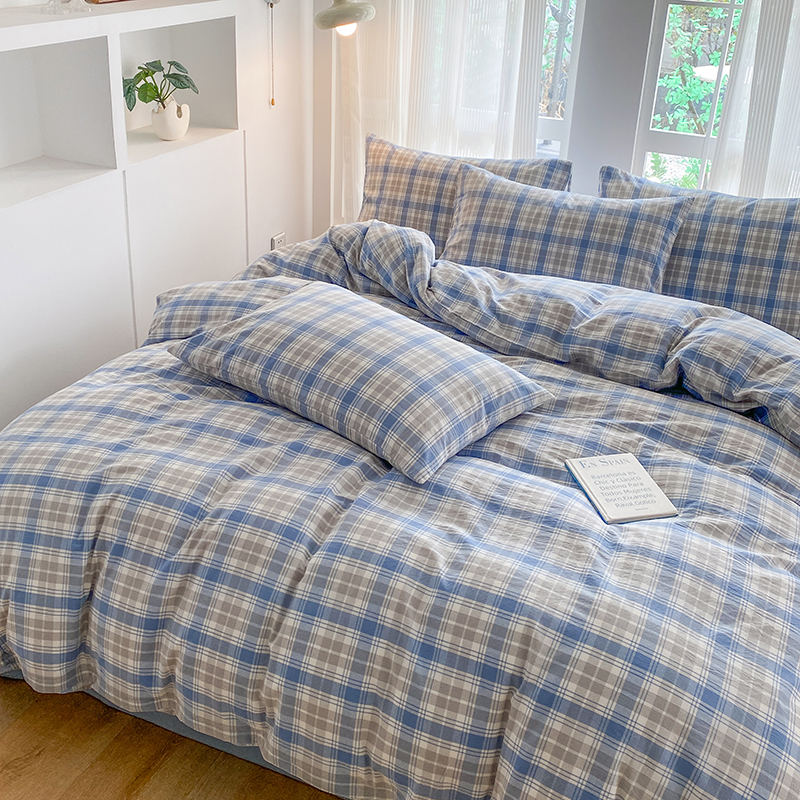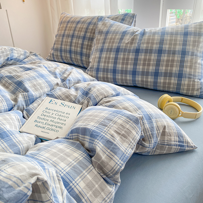 尚品本色 2024新款简约风水洗棉格子条纹系列四件套圣代-蓝