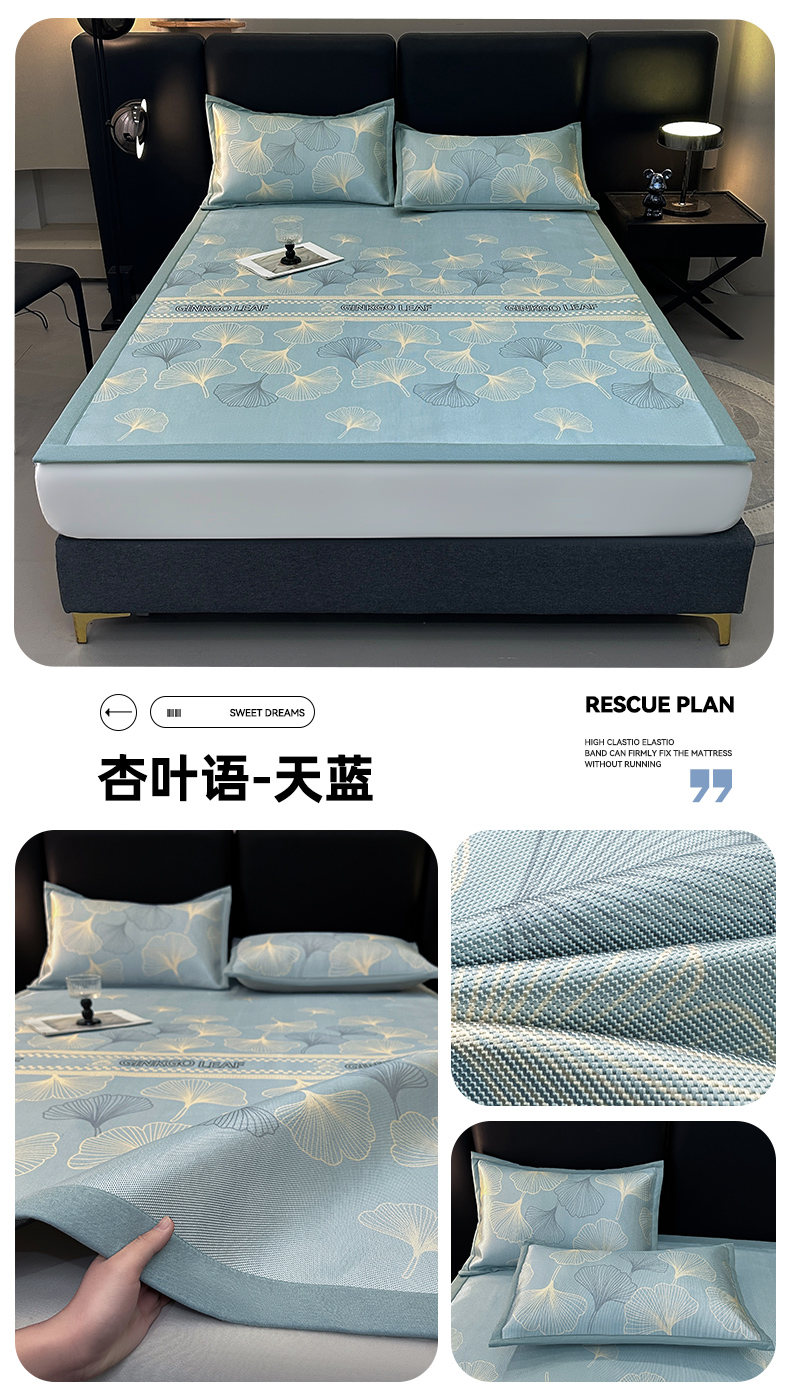 商品名称:全季家居 2025新款A类轻奢系列数码印花冰藤席凉席席子 杏叶语-天蓝 床笠