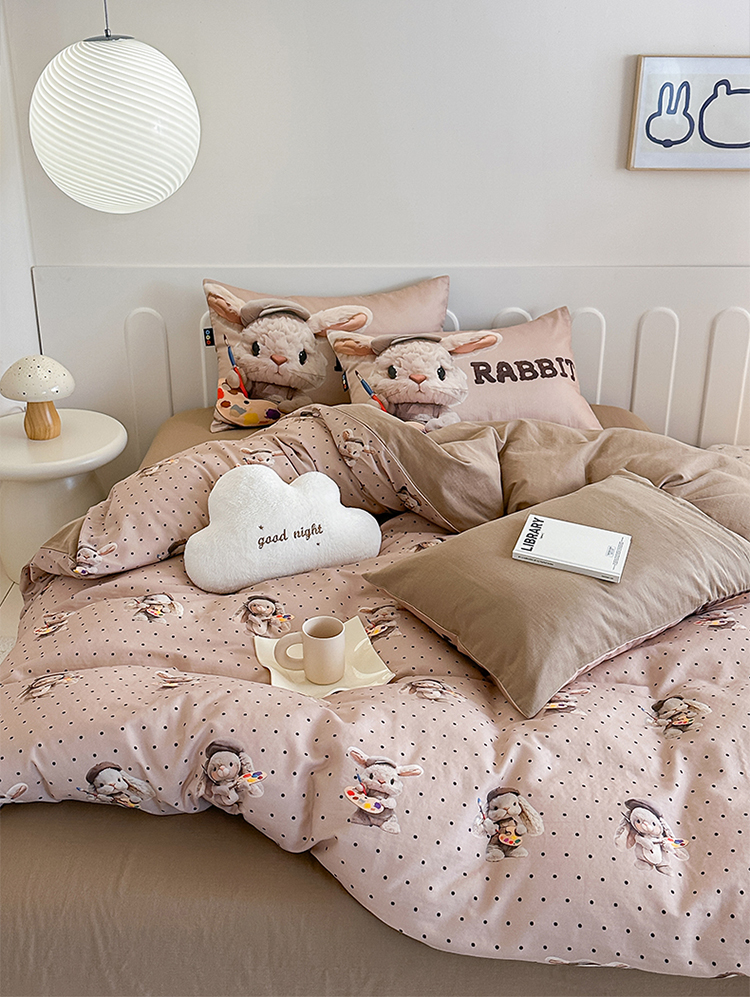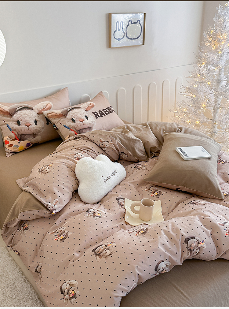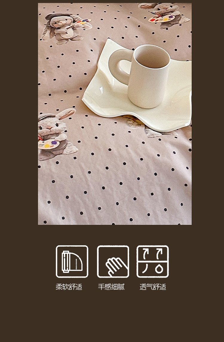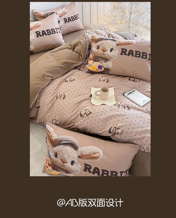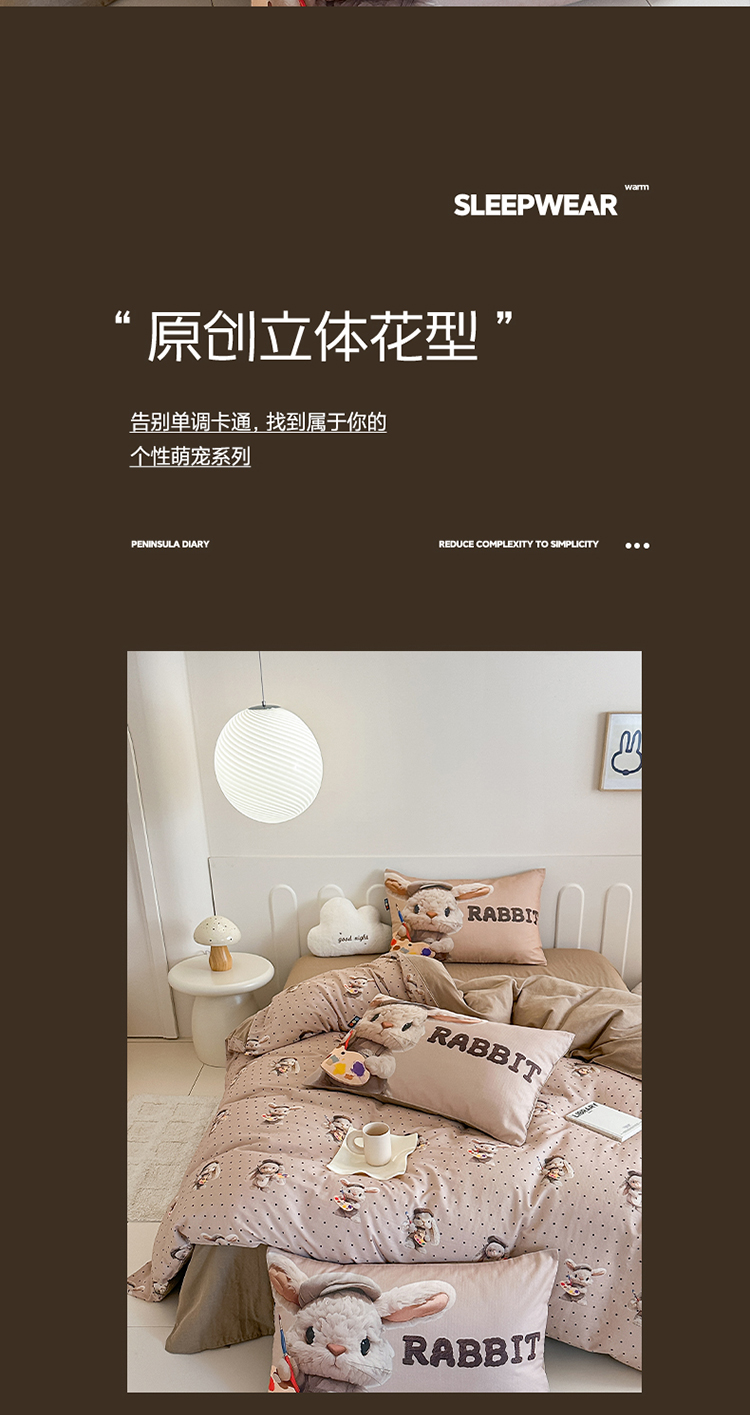 (总)RYB红黄兰 2025新款设计师原创A版抽条兔兔绒B版牛奶绒印花四件套,咖色潦草狗,波点黑猫,包装展示图,星星蝴蝶结,蓝色兔兔,奶油西高地