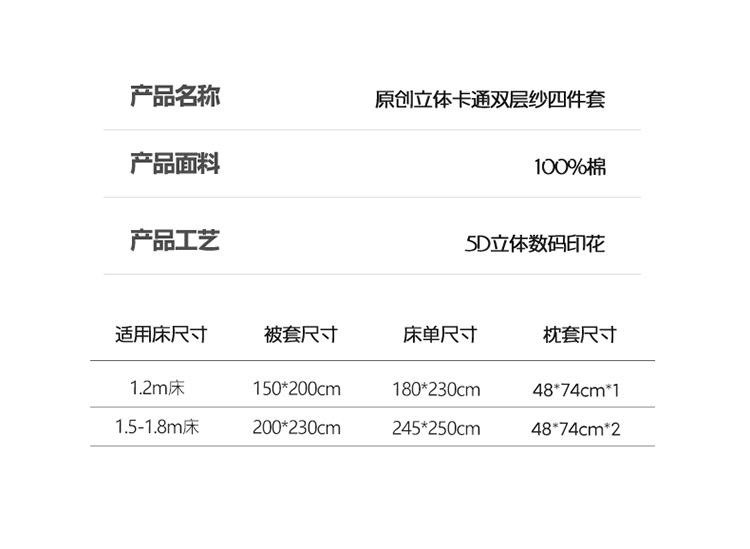 商品名称:(总)RYB红黄兰 2025新款ins卡通5D立体数码全棉纯棉有氧双层纱四件套系列