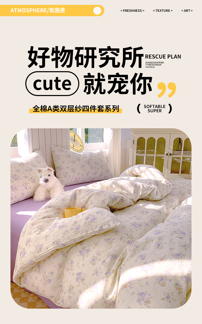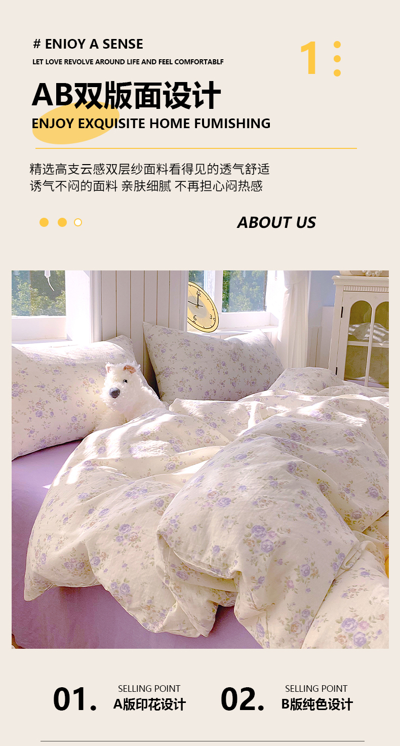 当前位置: 91家纺网 > 商品网购 > 床品套件 > 四件套 > 全棉普通四件套 > 春皖家纺 2026新款A类全棉有氧双层纱印花四件套单品系列-四件套 雾染玫瑰