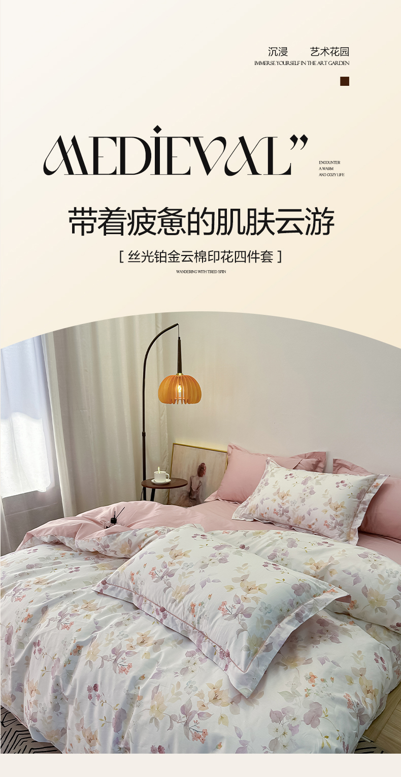 商品名称:橙艺家居 2026新款丝光铂金云棉印花四件套 本店线上严格控价,券后、活动后标准不得低于218元,以此类推。请各位老爷严格遵守,以免低价后再调整价格,影响链接权重 花颜外-粉