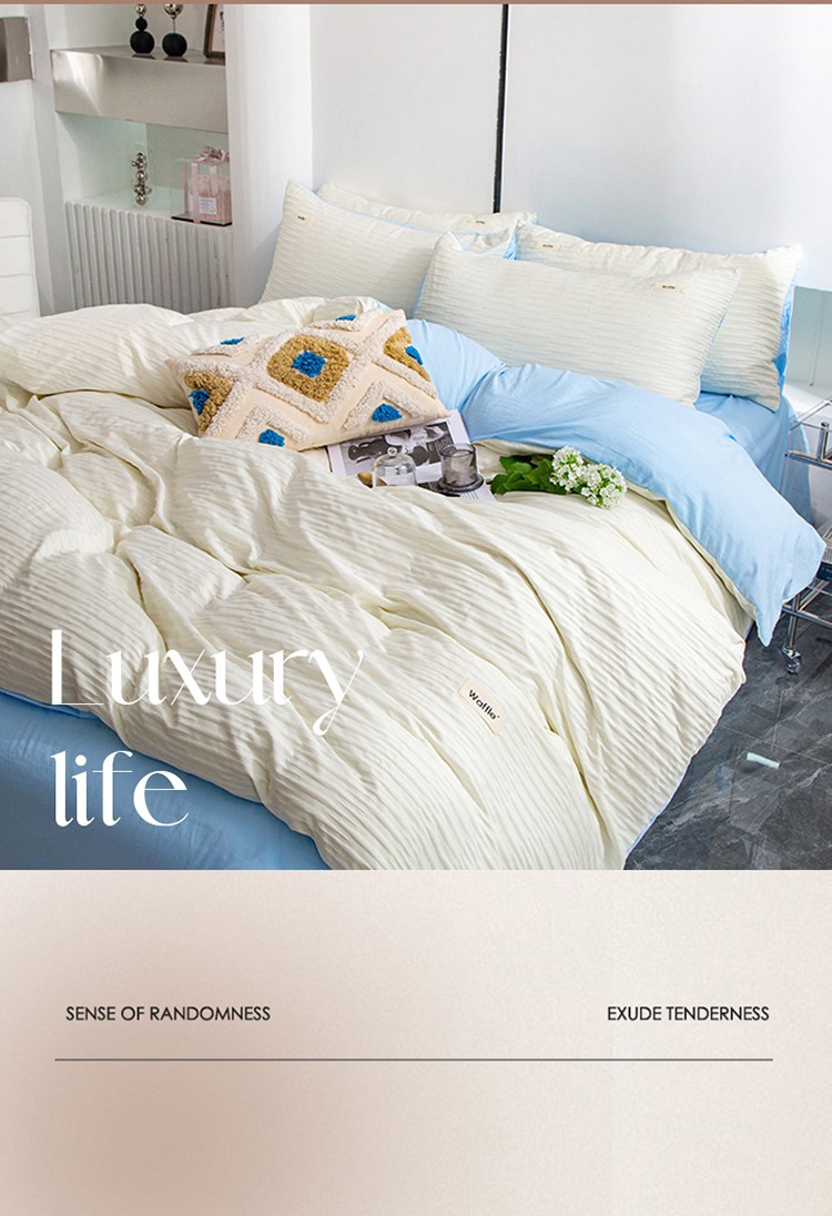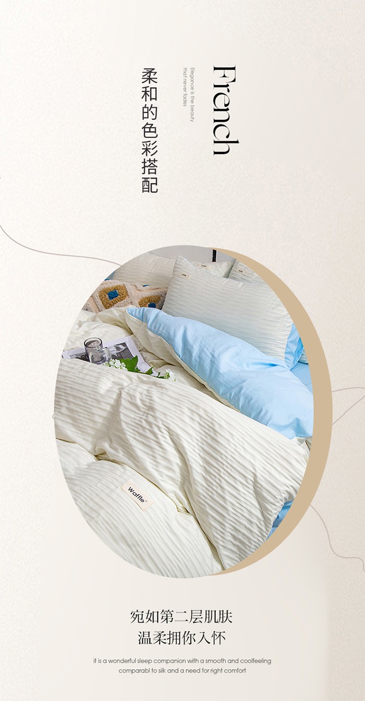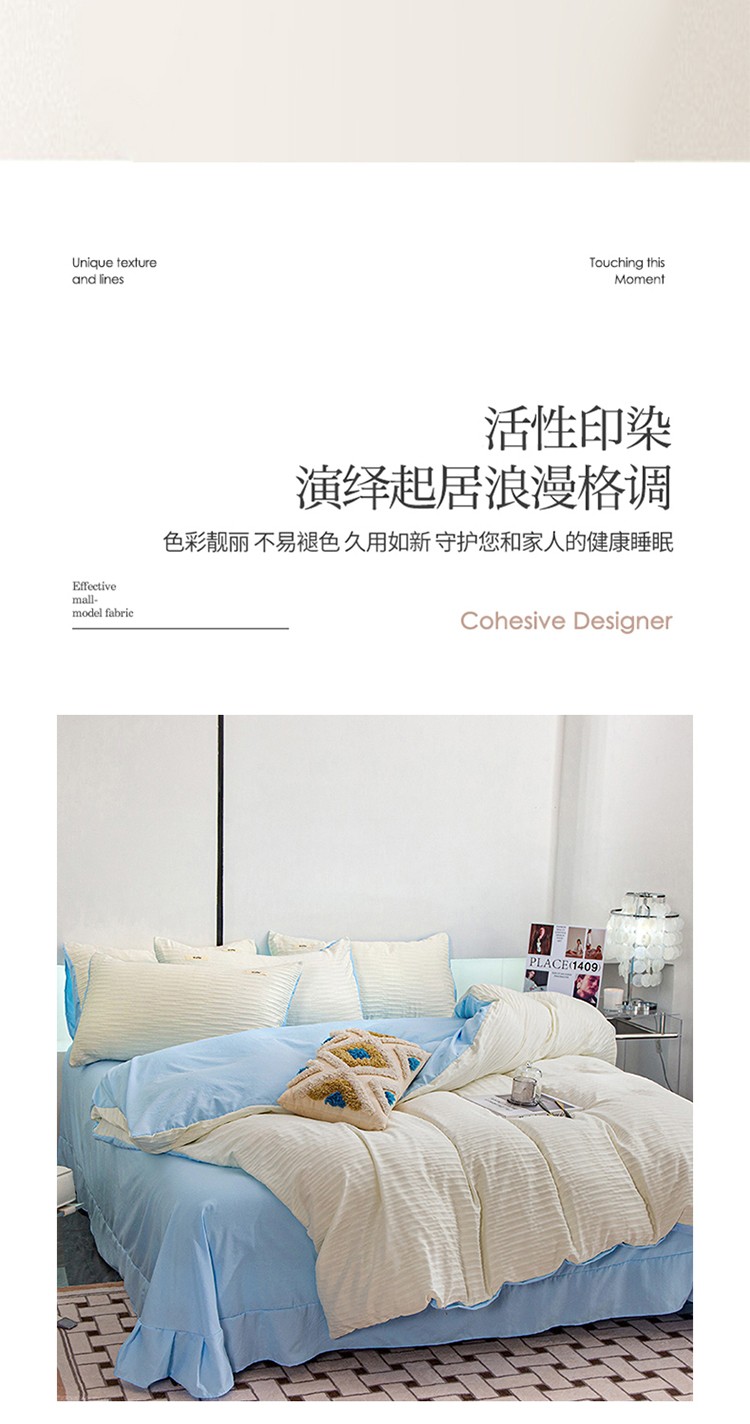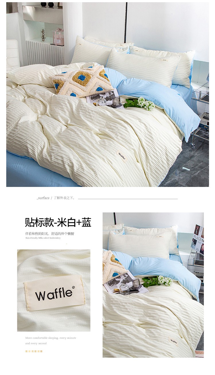 仟网汇 2023新款简约款贴标叶子泡泡纱水洗棉四件套 贴标款-米白+蓝