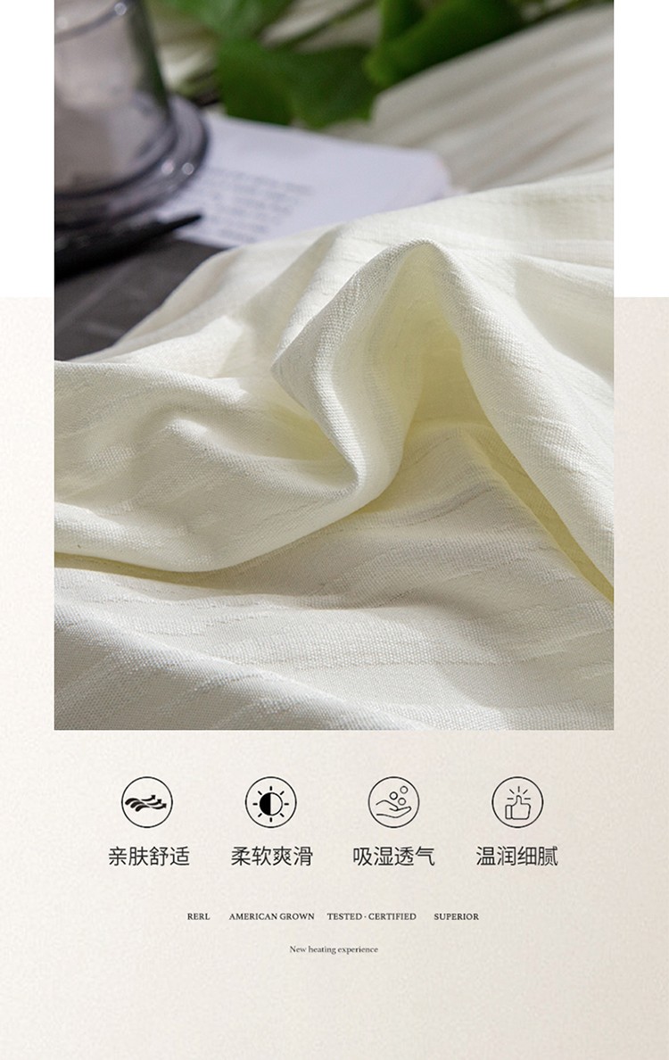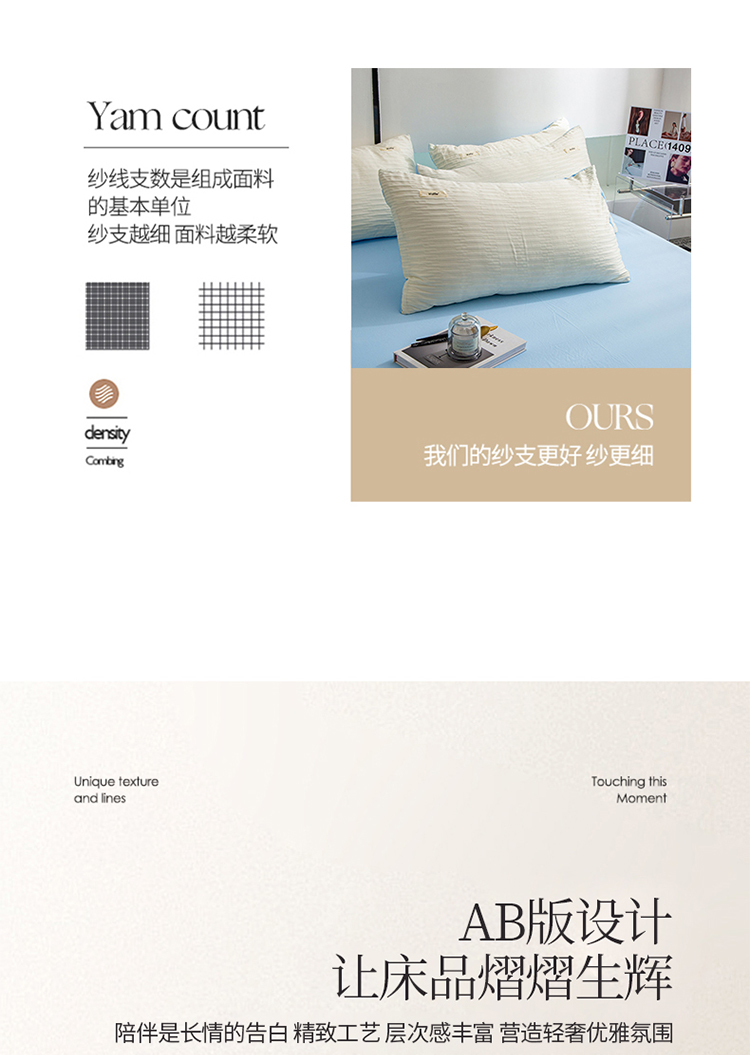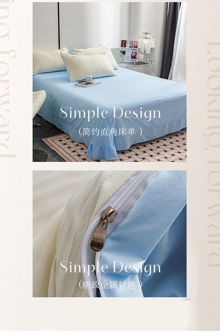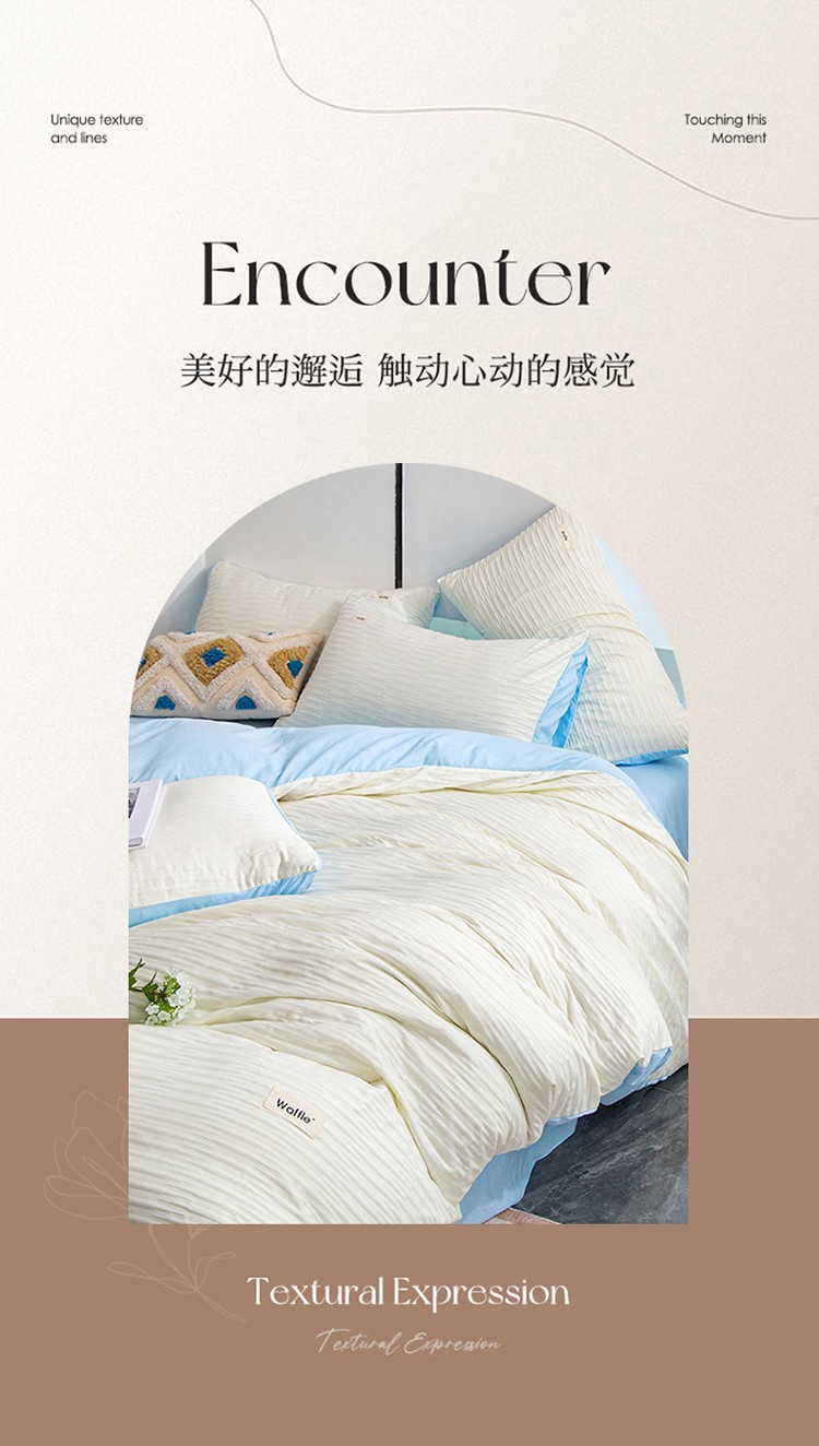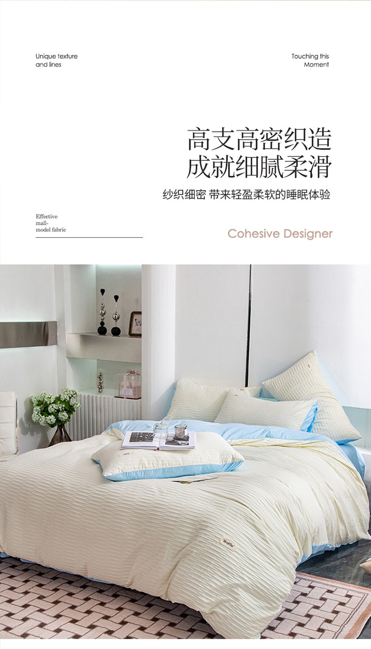 仟网汇 2023新款简约款贴标叶子泡泡纱水洗棉四件套 贴标款-米白+蓝
