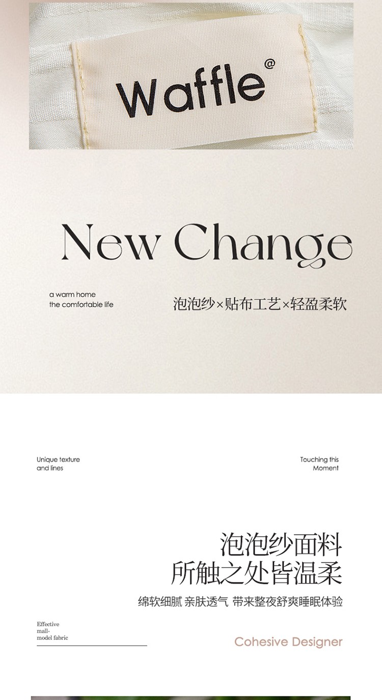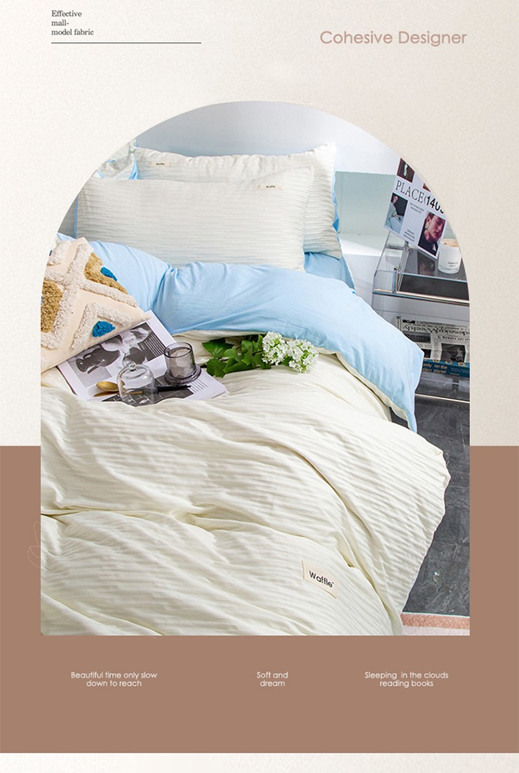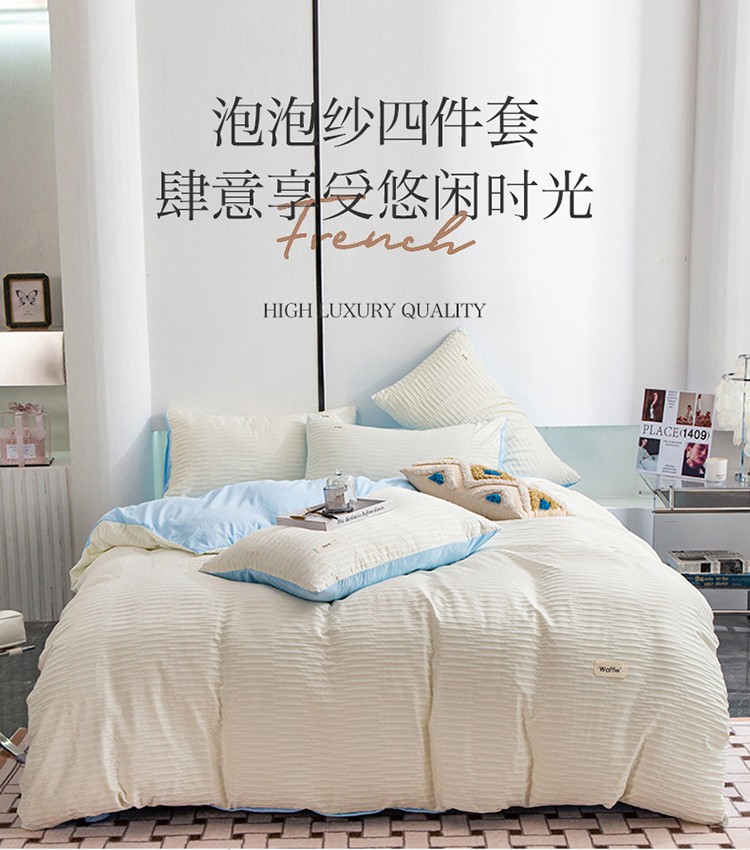 商品名称:仟网汇 2023新款简约款贴标叶子泡泡纱水洗棉四件套 贴标款-米白+蓝