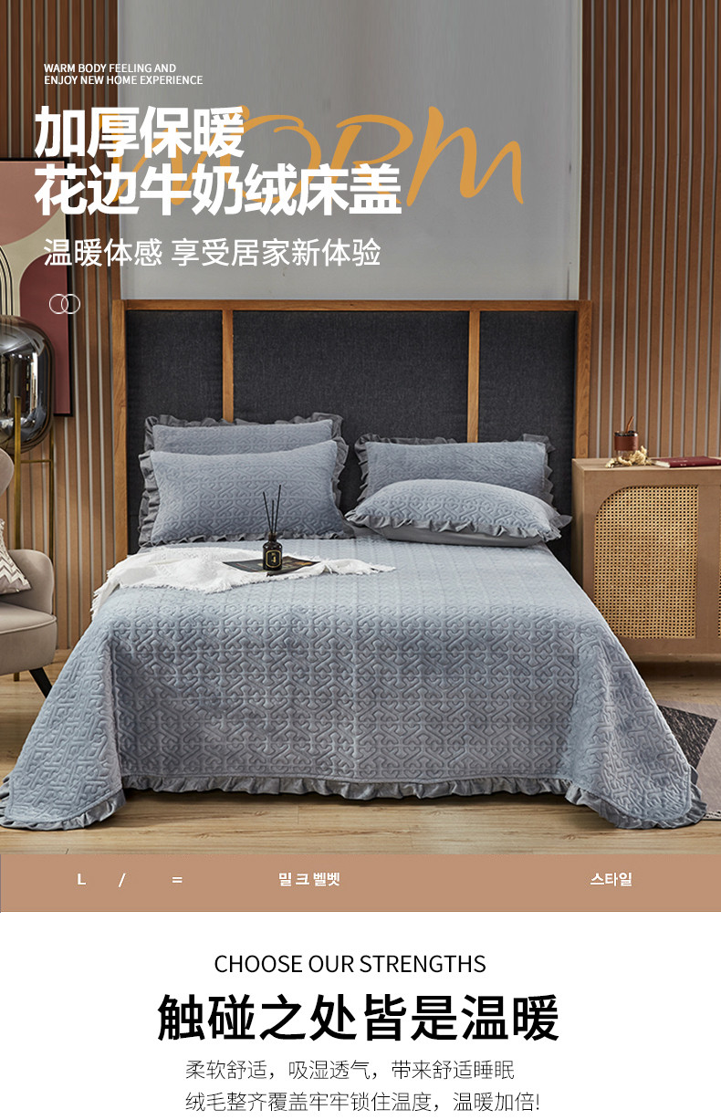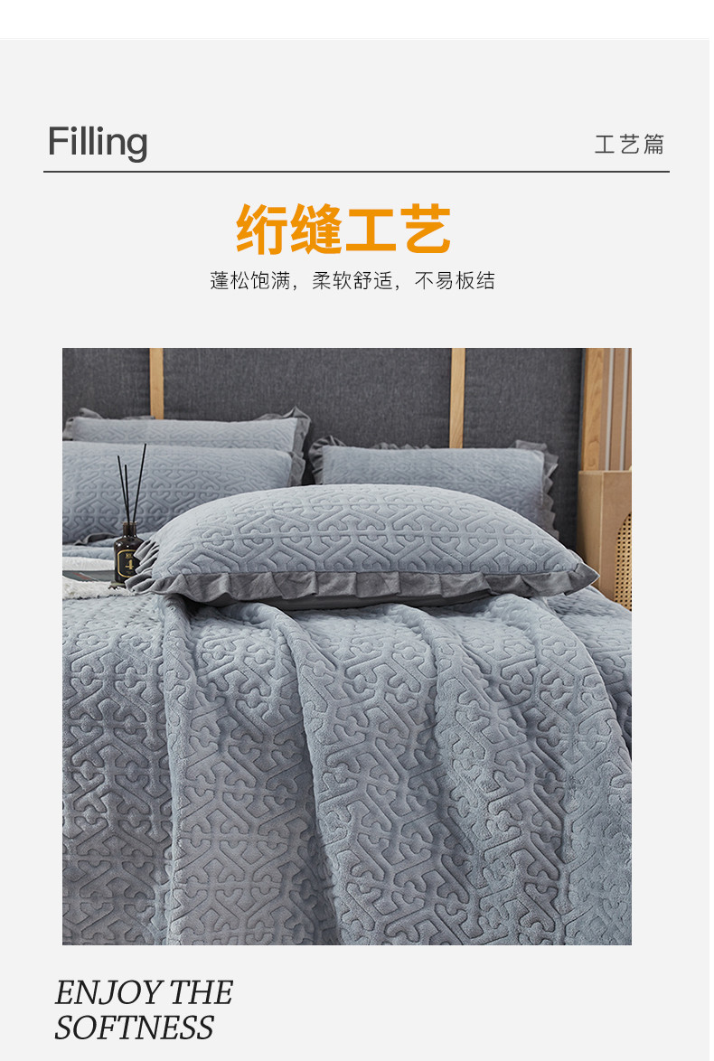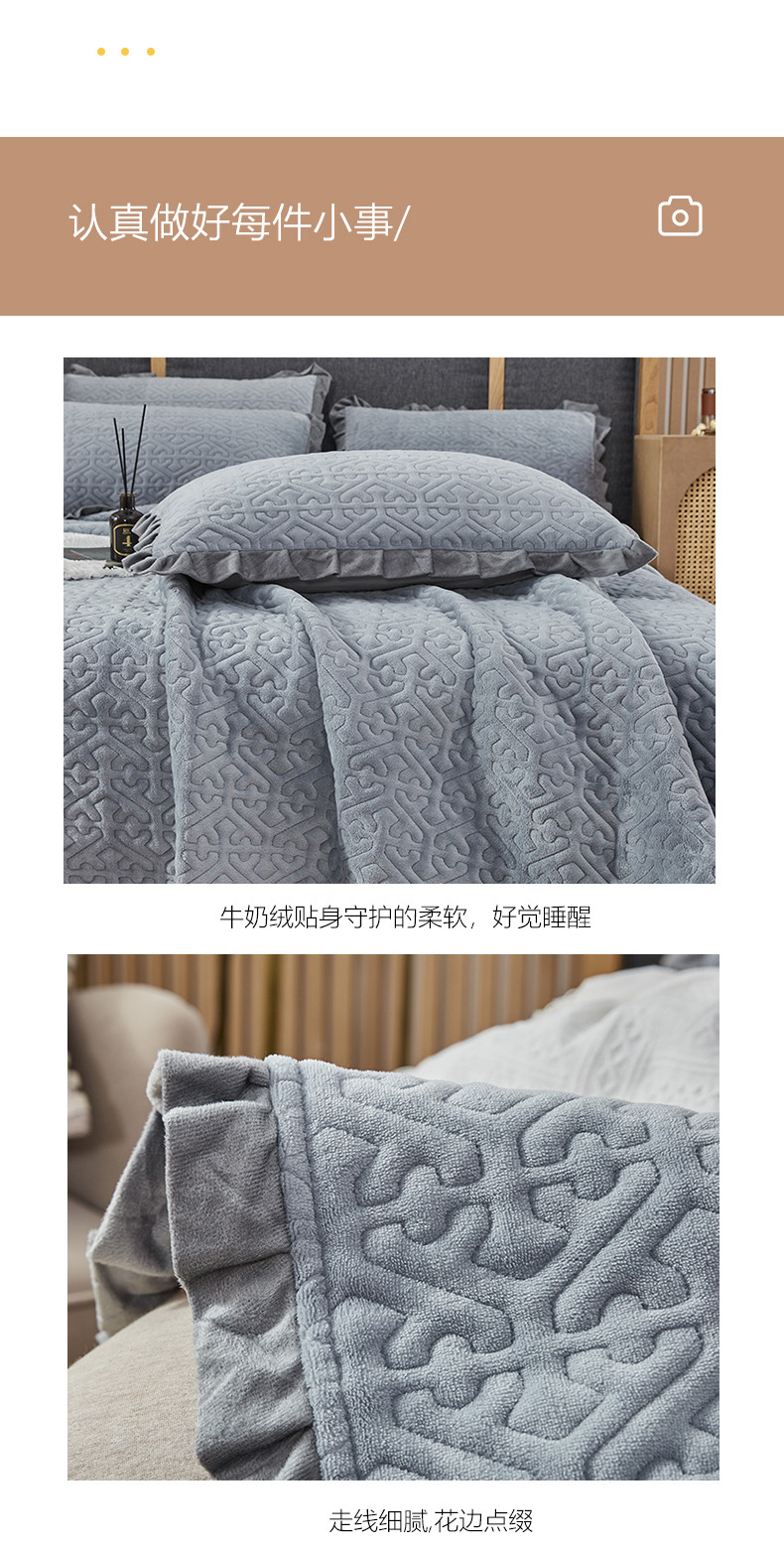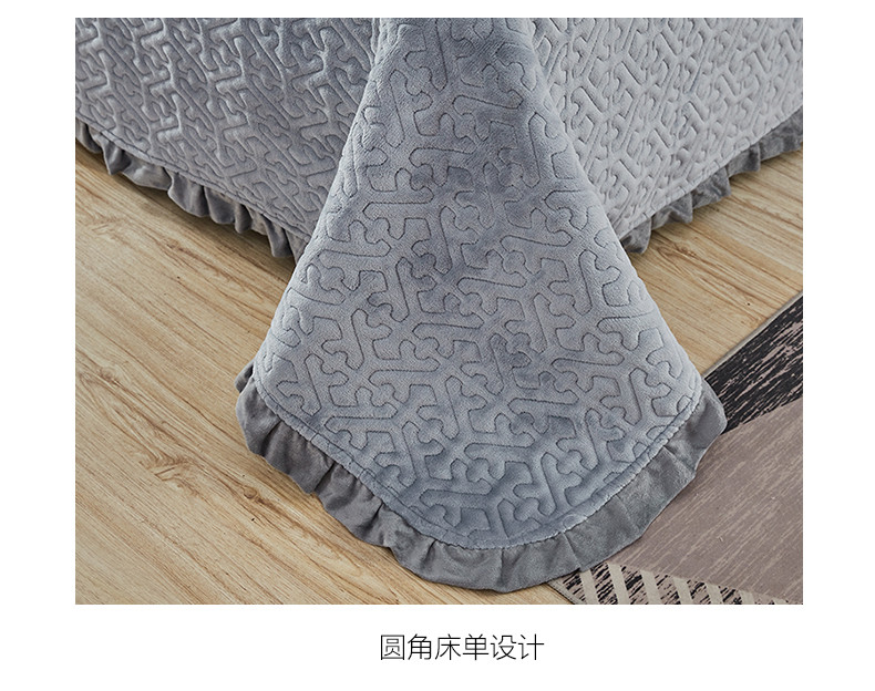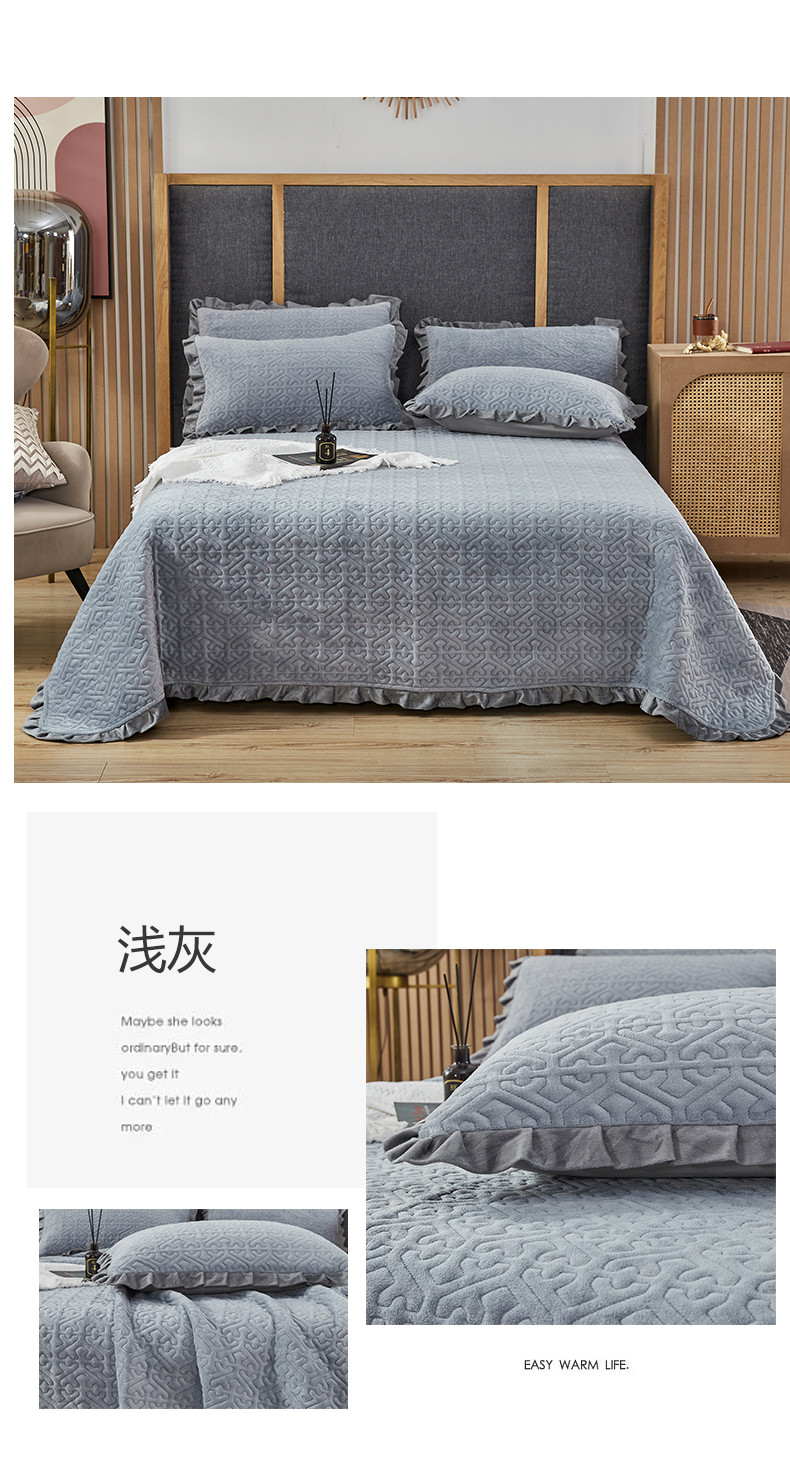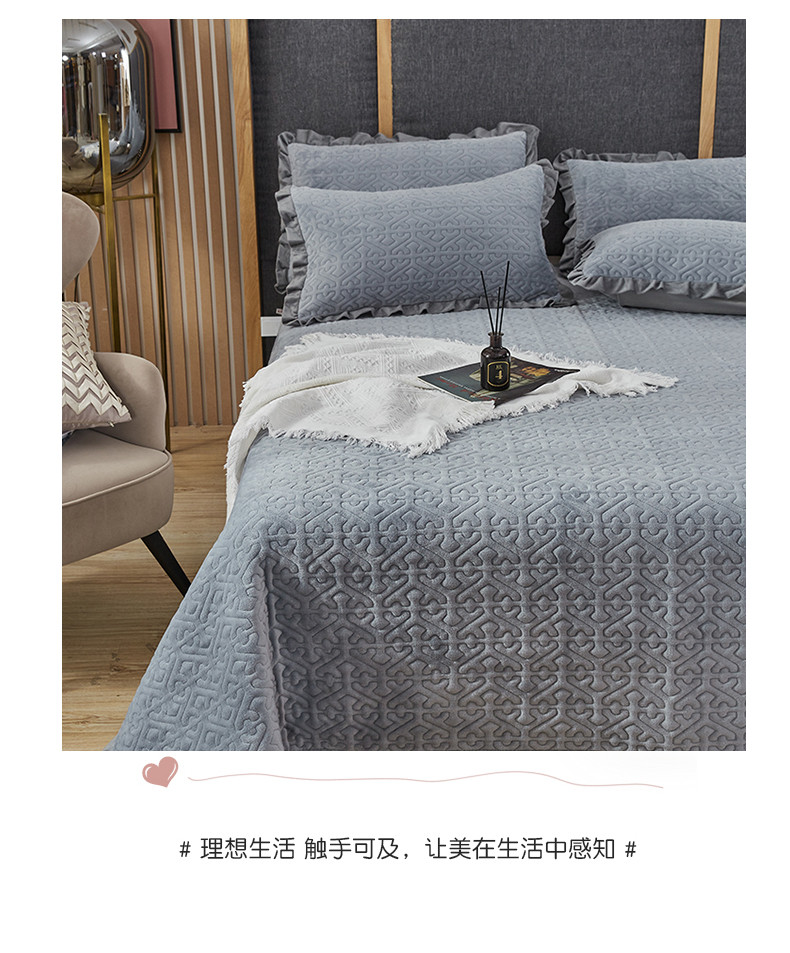 佳梦家纺 牛奶绒纯色花边床盖绗缝夹棉绒毯三件套榻榻米席梦思床垫子 浅灰