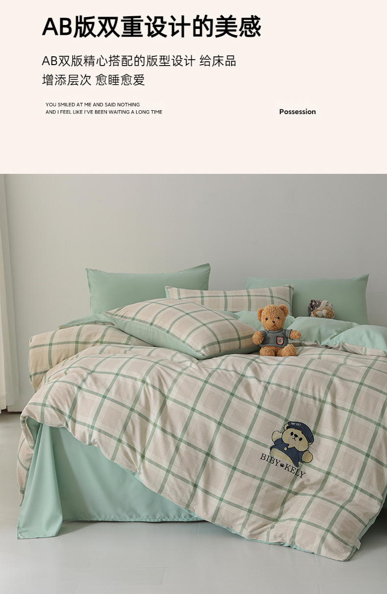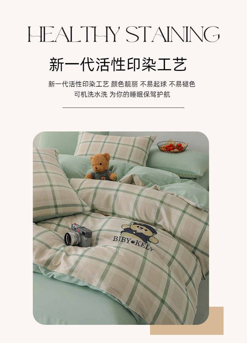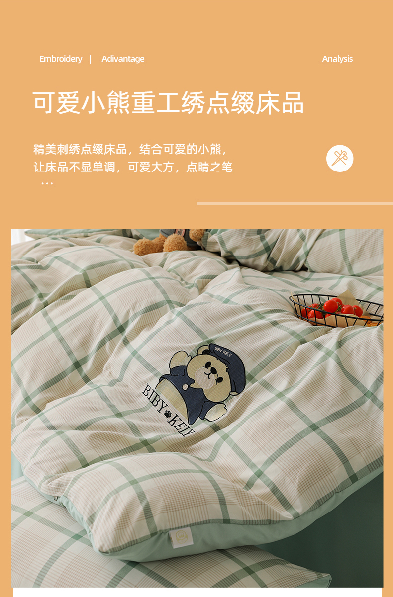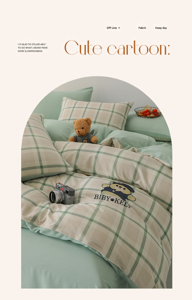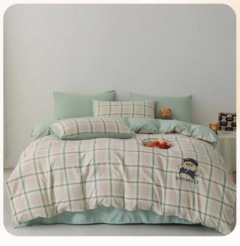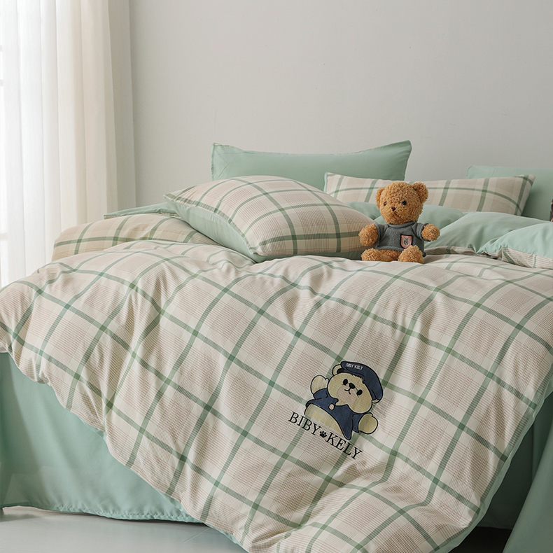 潮邦创意家居 2025新款春夏亲肤水洗棉刺绣四件套-贝恩熊 贝恩熊-英伦绿