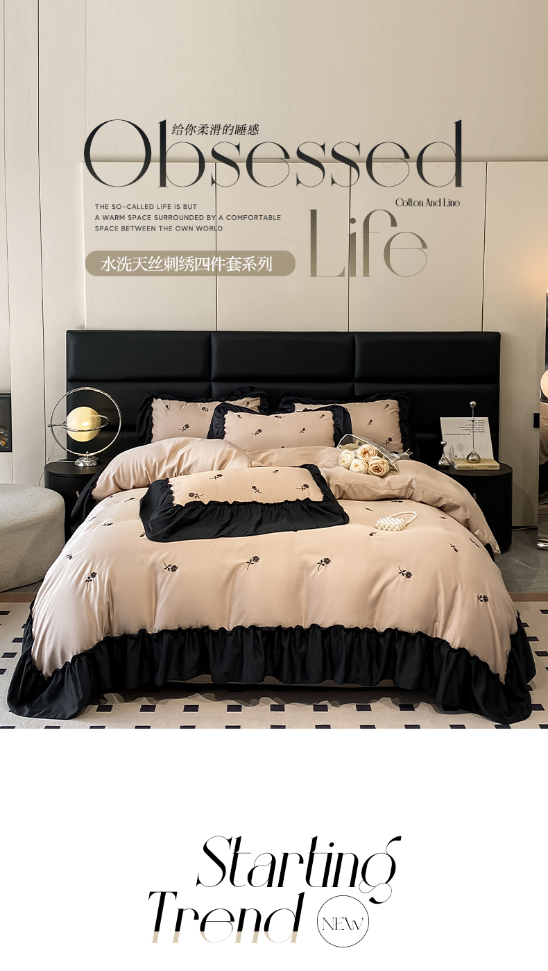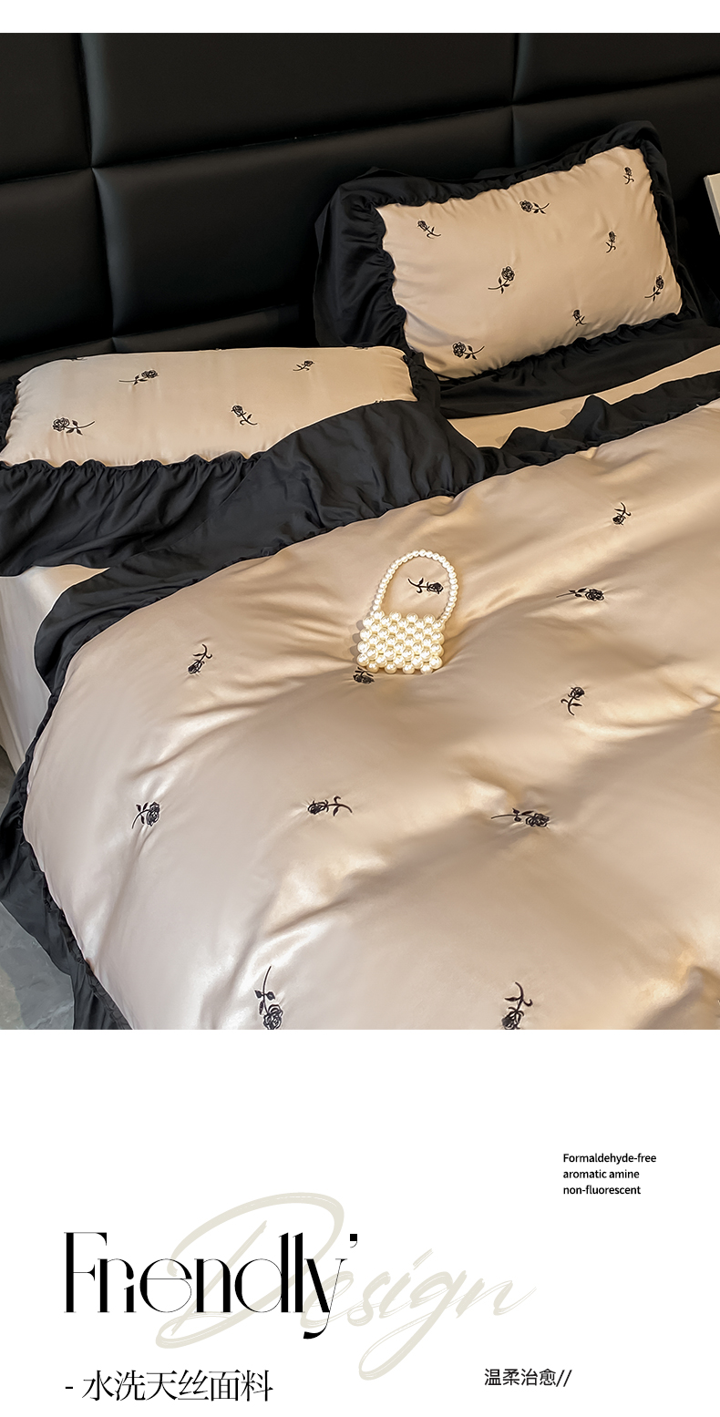 (总)绒掌柜家纺(品质焕新) 2026新款水洗真丝天丝冰丝刺绣四件套-典雅系列,宾利蓝,高级灰,墨绿,奶白,浅灰,少女粉,香槟,珍珠白