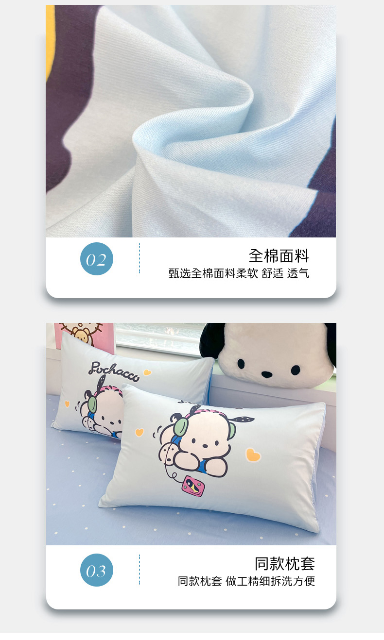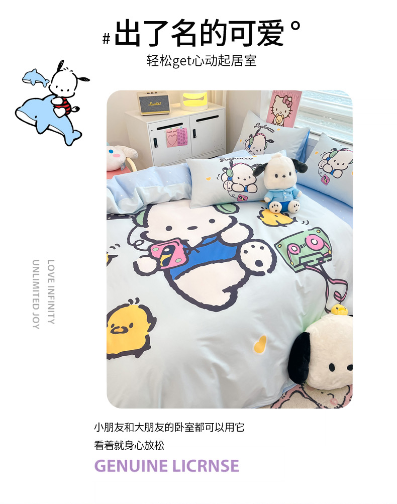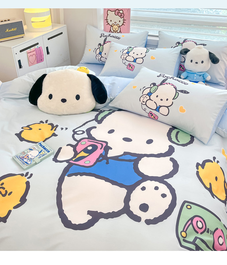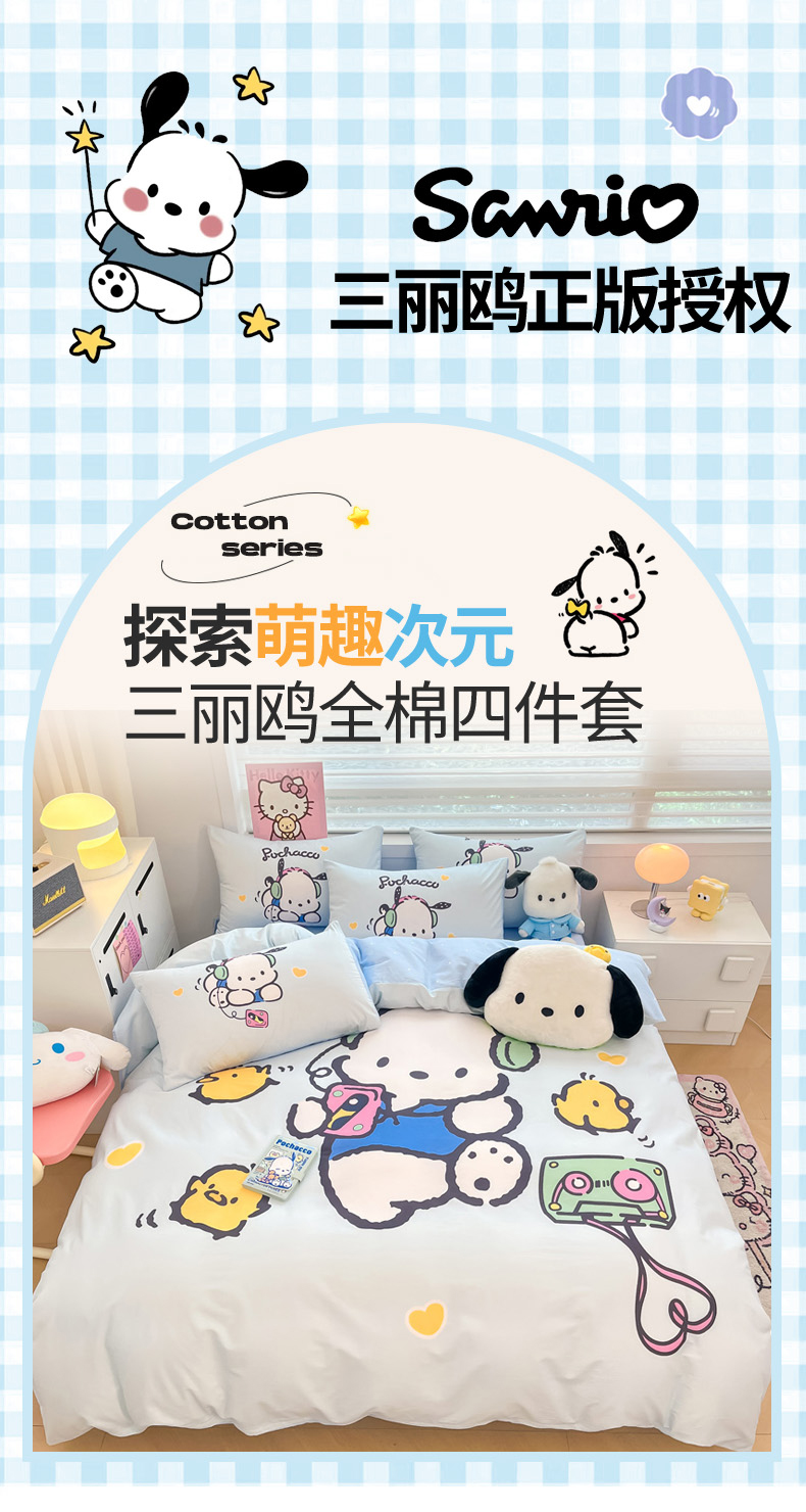 当前位置: 91家纺网 > 商品网购 > 床品套件 > 四件套 > 全棉普通四件套 > 暮思家居 2025新款正版授权三丽鸥大阪全棉数码印花纯棉四件套系列-第三批(专版花型) 大版-音乐帕恰狗
