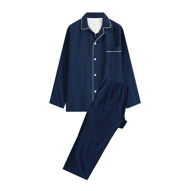 伊嫚家居 2025新款无印日式双股全棉法兰绒家居服良品睡衣女纯棉直播秋冬款情侣睡衣 纯藏青色男