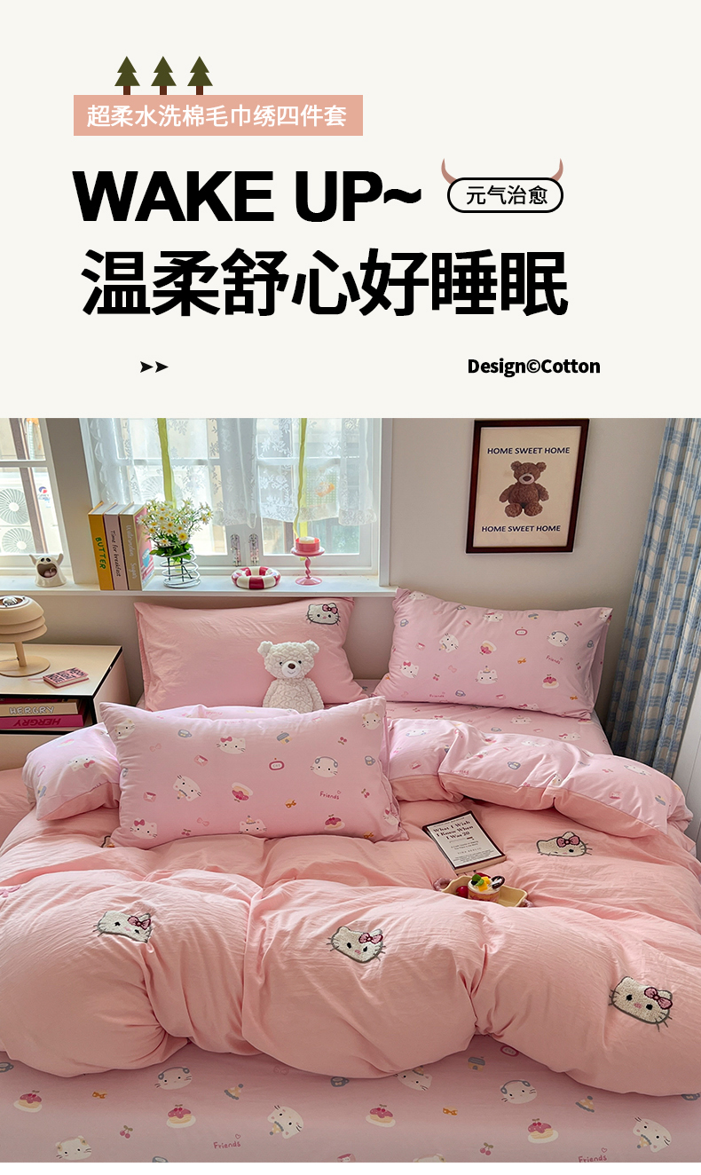 当前位置: 91家纺网 > 商品网购 > 床品套件 > 四件套 > 毛巾绣四件套 > 喜颜 2025新款超柔水洗糯糯棉爆款毛巾绣四件套学生宿舍三件套 可爱KT-浅粉