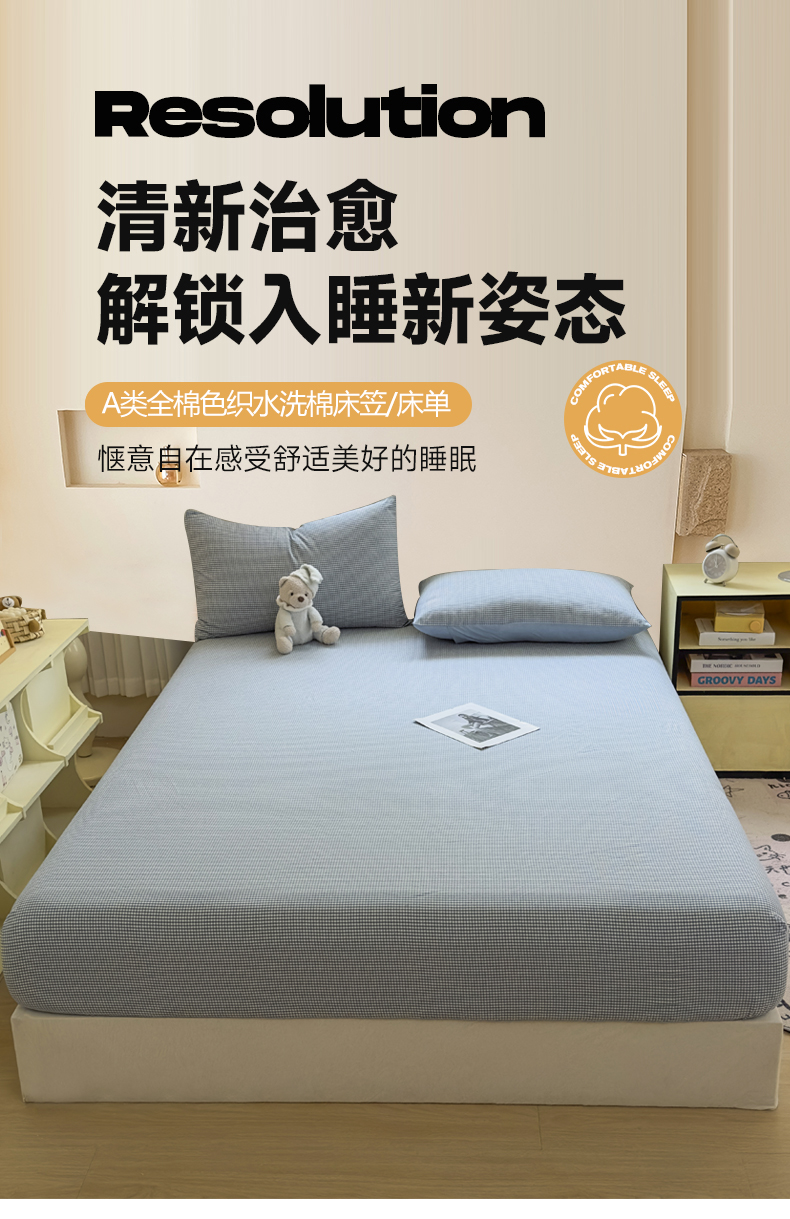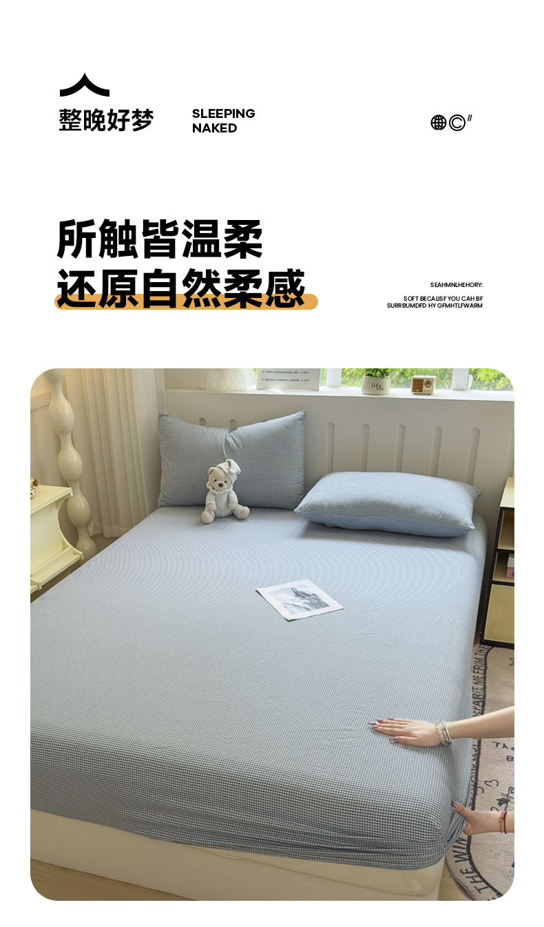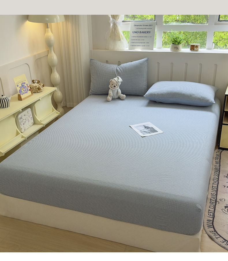晚依家纺 2025新款A类色织全棉纯棉水洗棉床笠单件纯棉格子纯色学生宿舍定制定做 密格-浅蓝