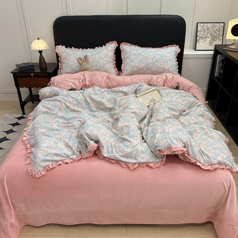 (总)仟网汇 2025新款热款剪花绒毛毛球绒水晶绒四件套,粉色